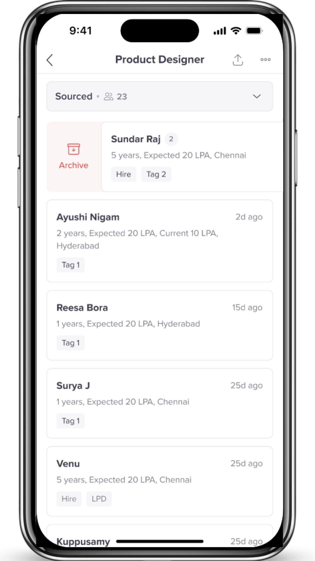 - Swiping right on a candidate’s card allows you to quickly select the option to Archive the candidate if you decide not to proceed with their application.