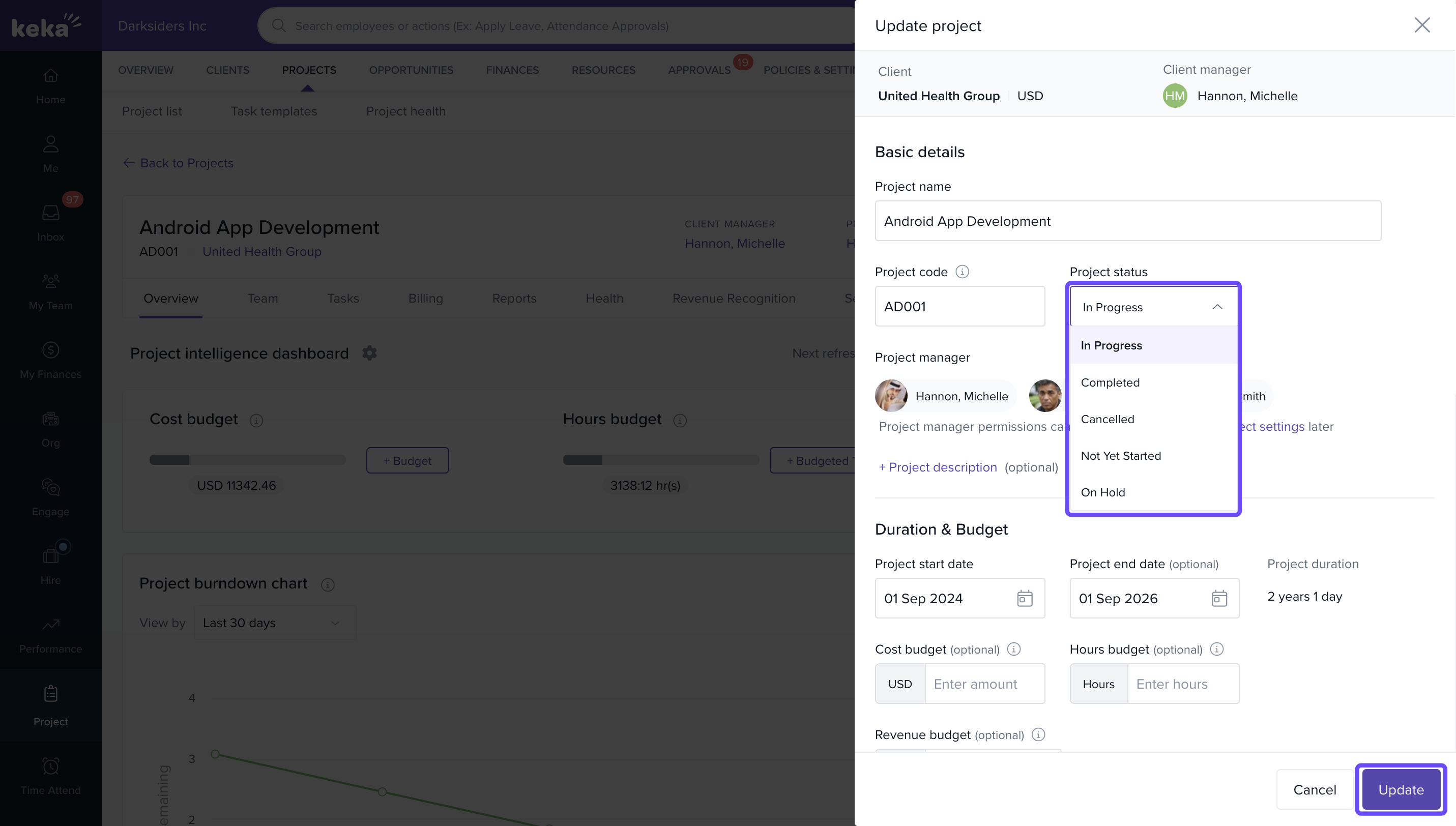 How to update a project's status individually in Keka PSA.