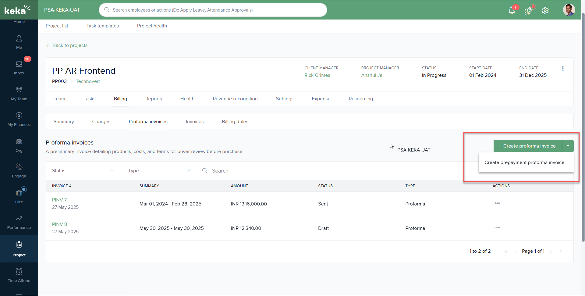 You can now issue Proforma and Prepayment Invoices within Keka PSA. These additions allow finance and delivery teams to simulate billing, handle advance payments, and track balances seamlessly—all within the same platform.