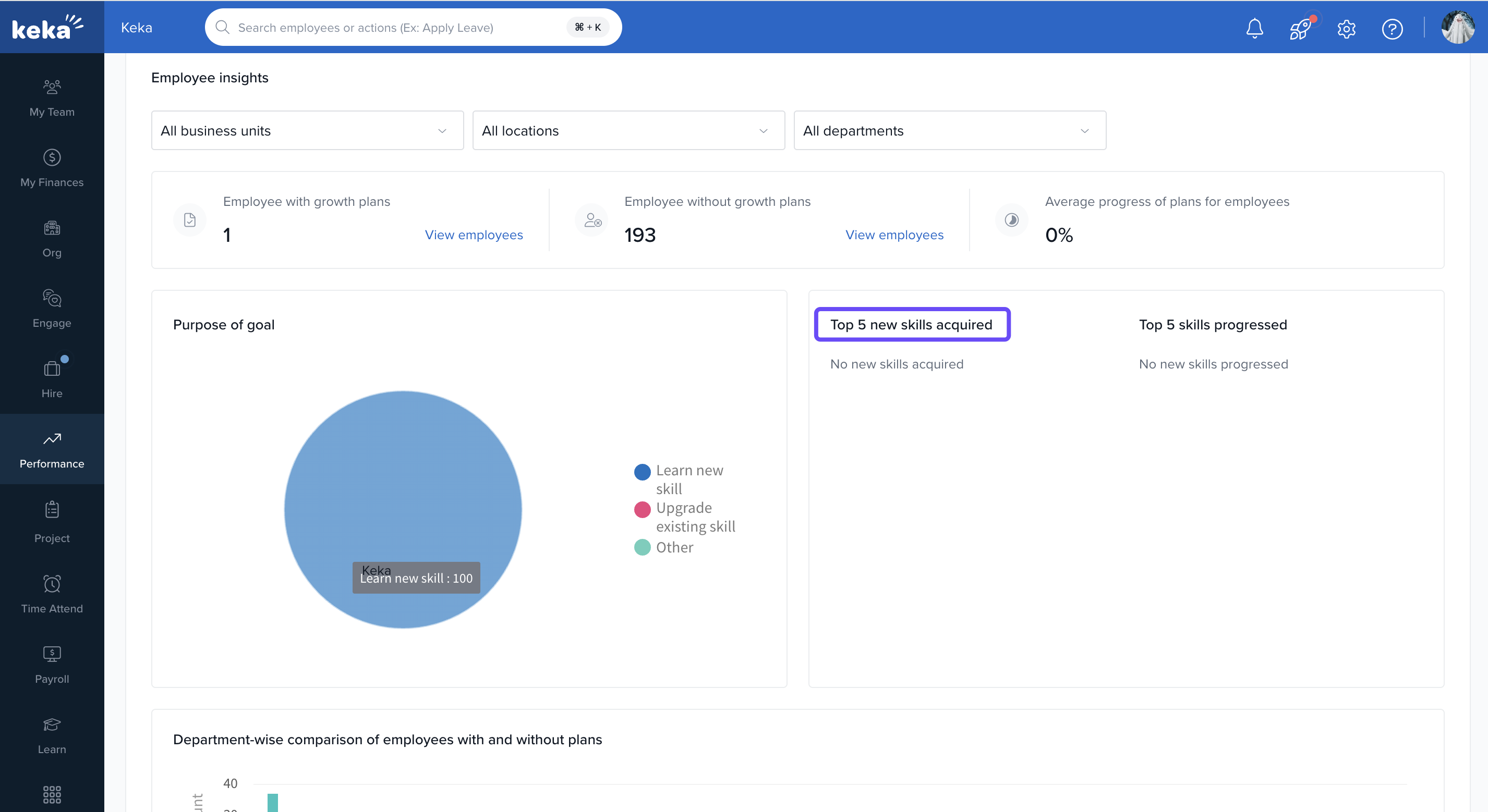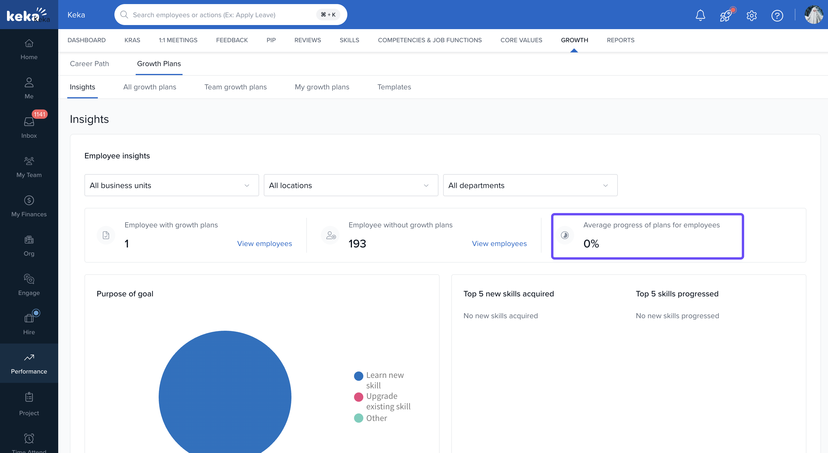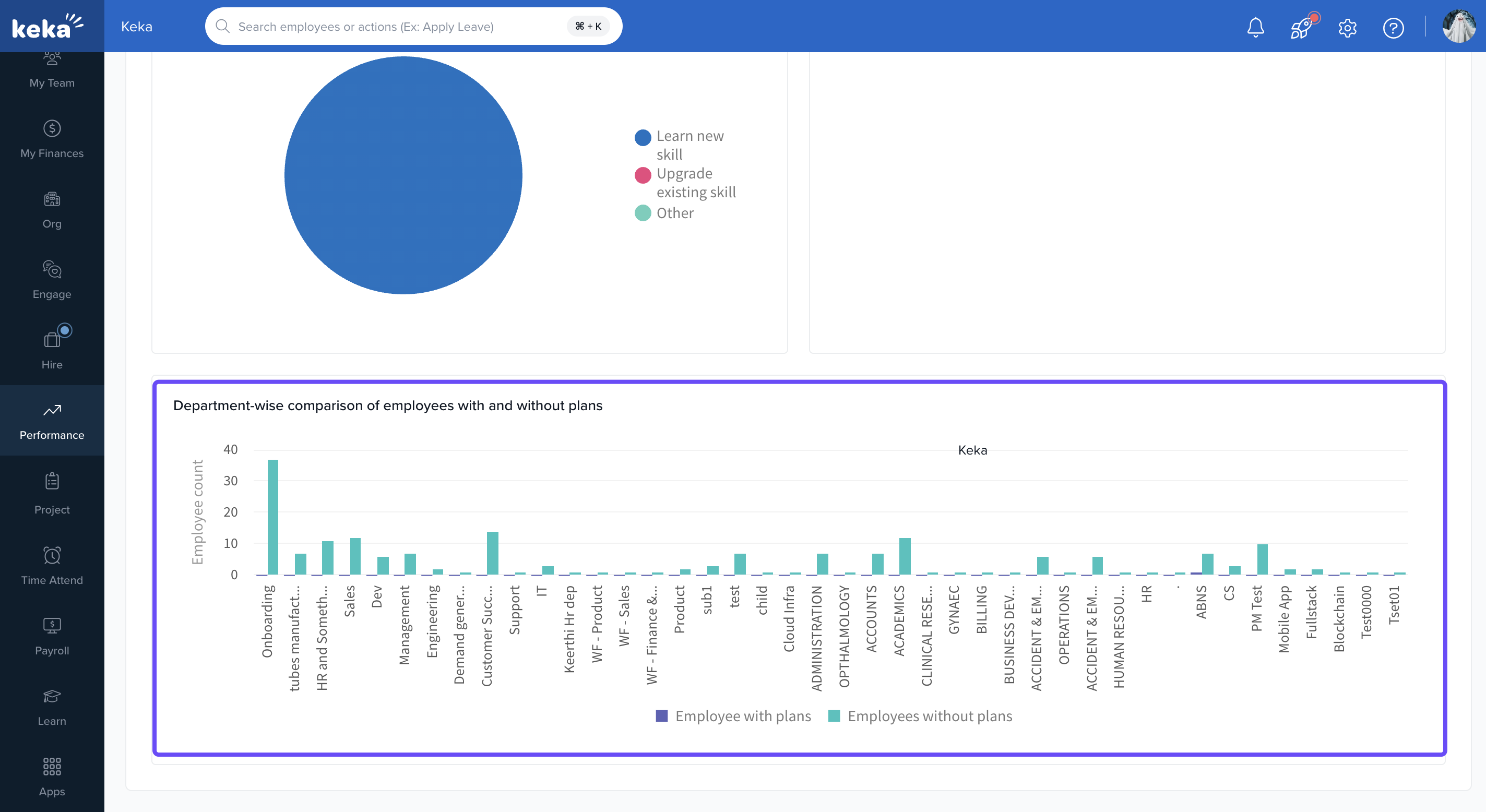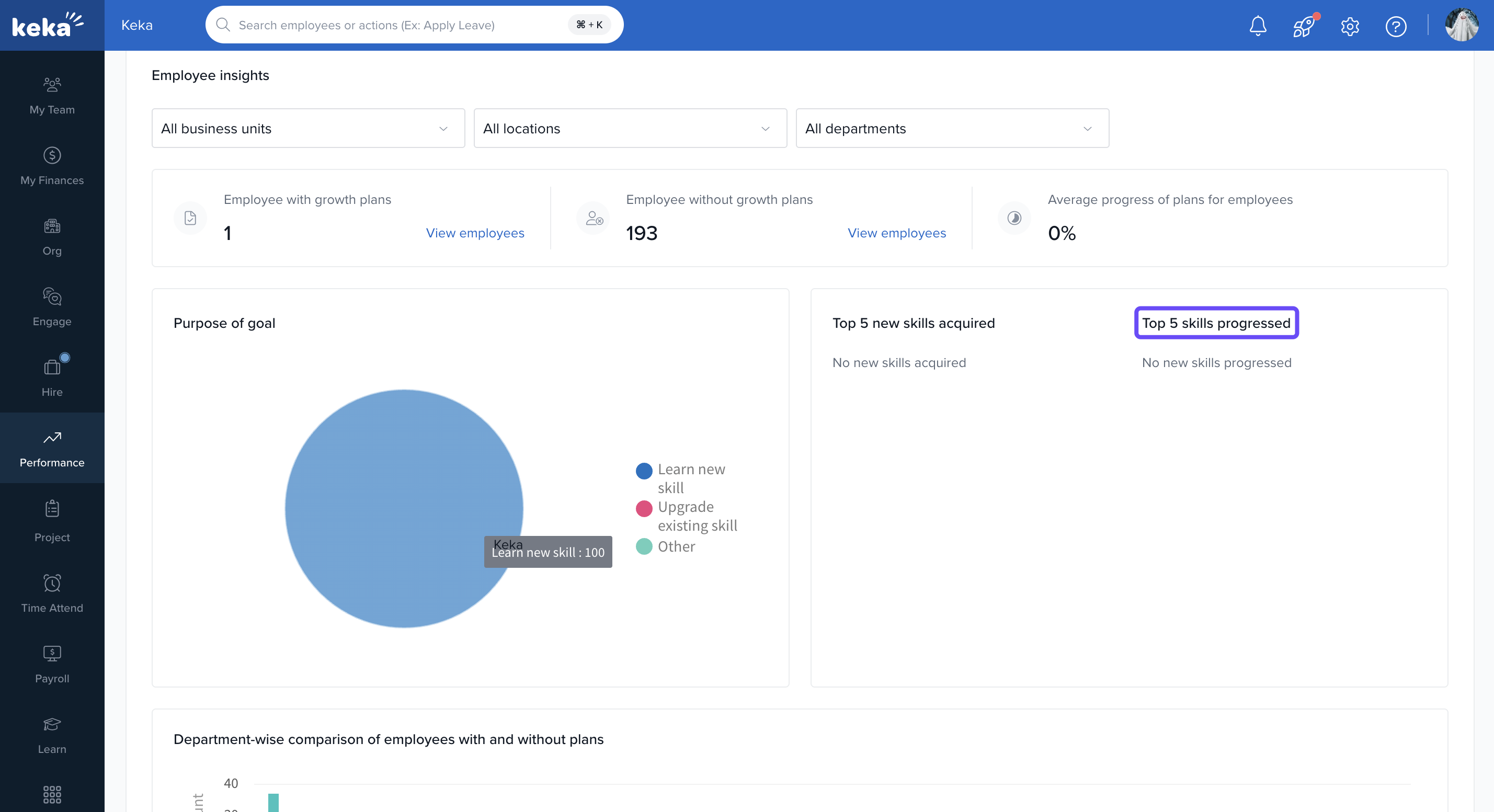 Keka’s Growth Plan Insights gives you a snapshot of how employees are progressing with their development plans. Admins and Performance Managers can monitor plan adoption, track progress, and compare trends across departments.