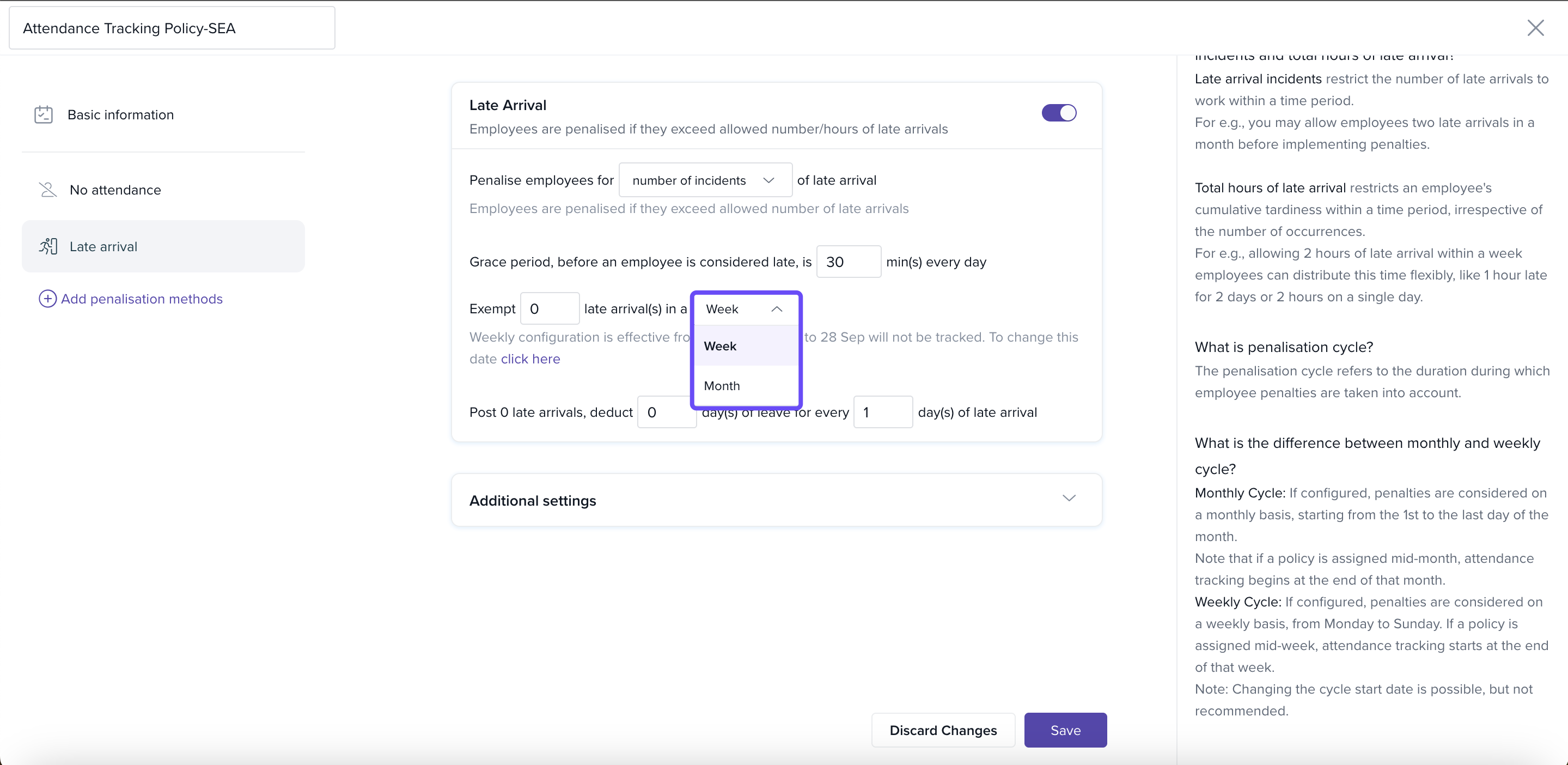 When you assign a penalization policy mid-period (week or month), Keka waits until the end of that current period before it starts tracking late arrivals or other attendance issues.