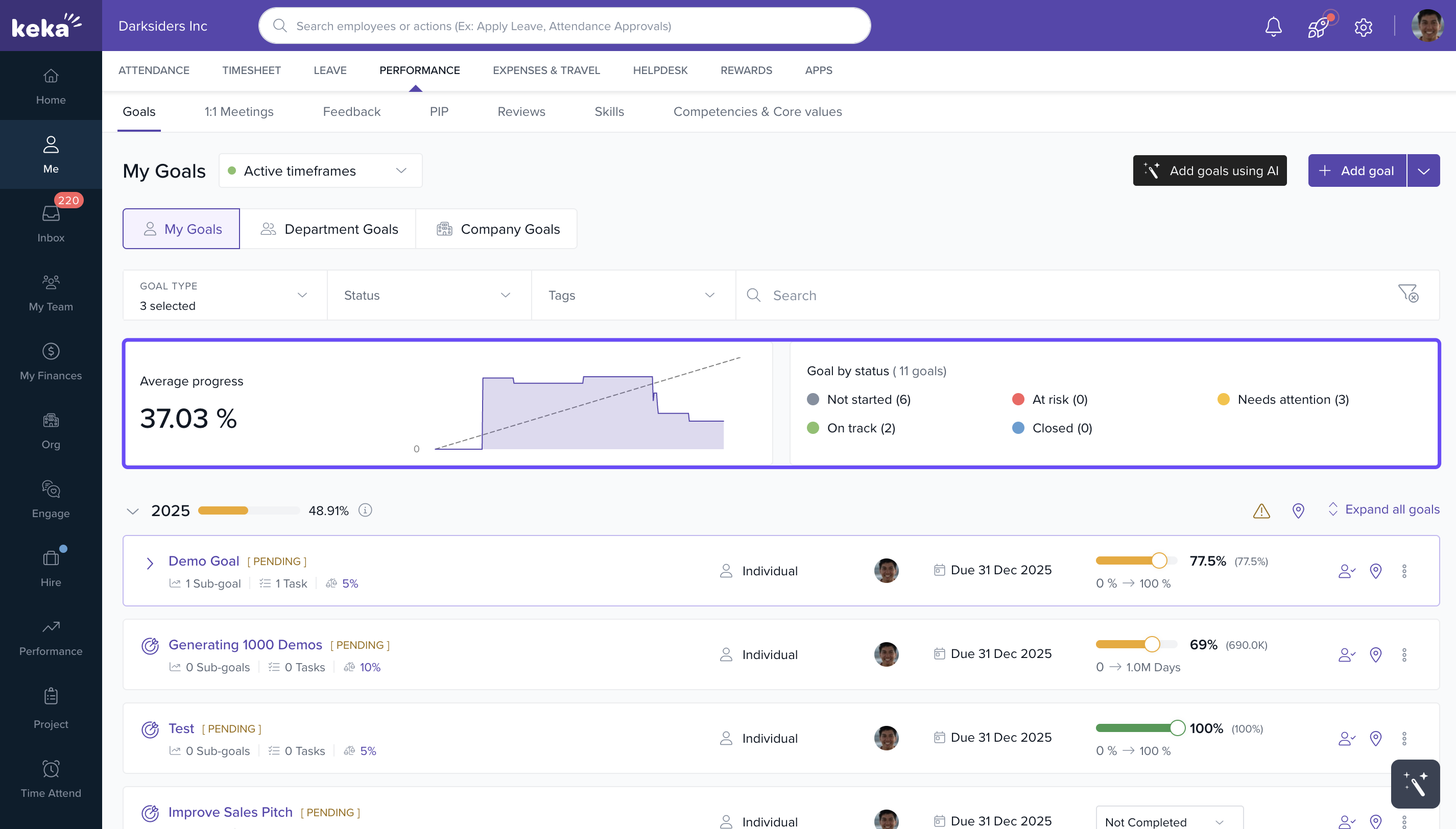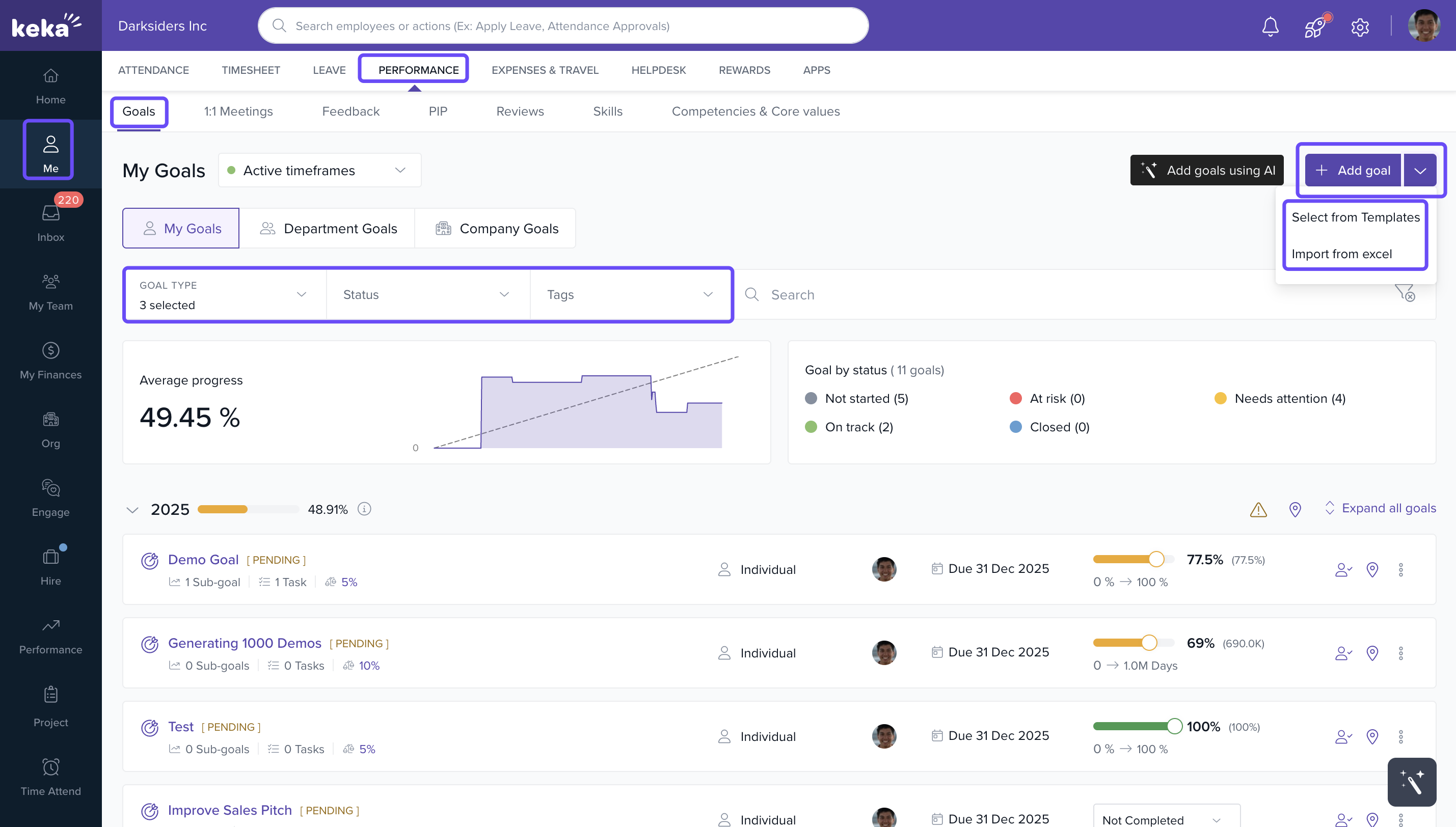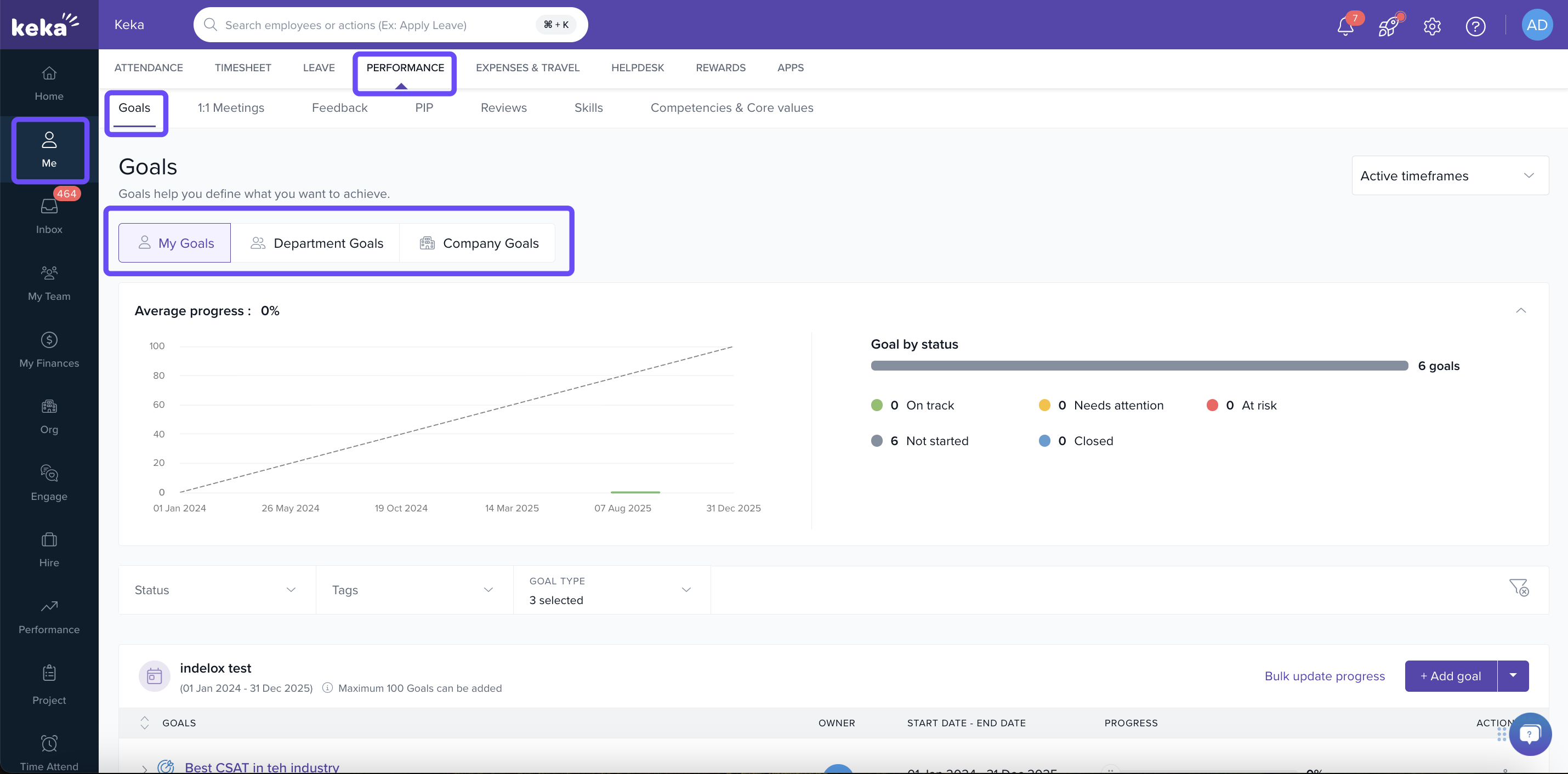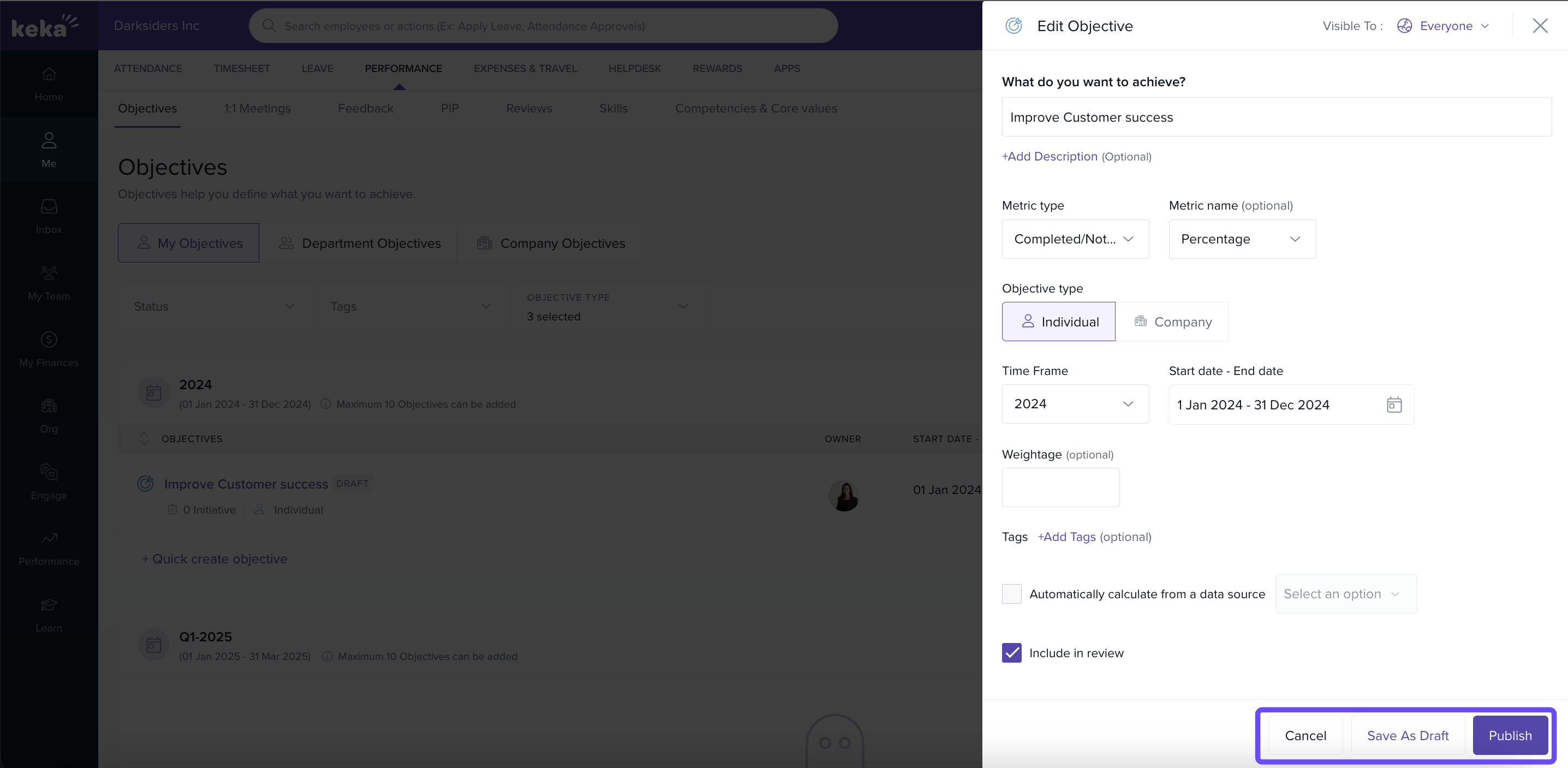 You can use Keka’s performance management features to set personal objectives (goals), break them down into measurable key results, and track progress over time. This helps you stay focused and aligned with team or company goals.
