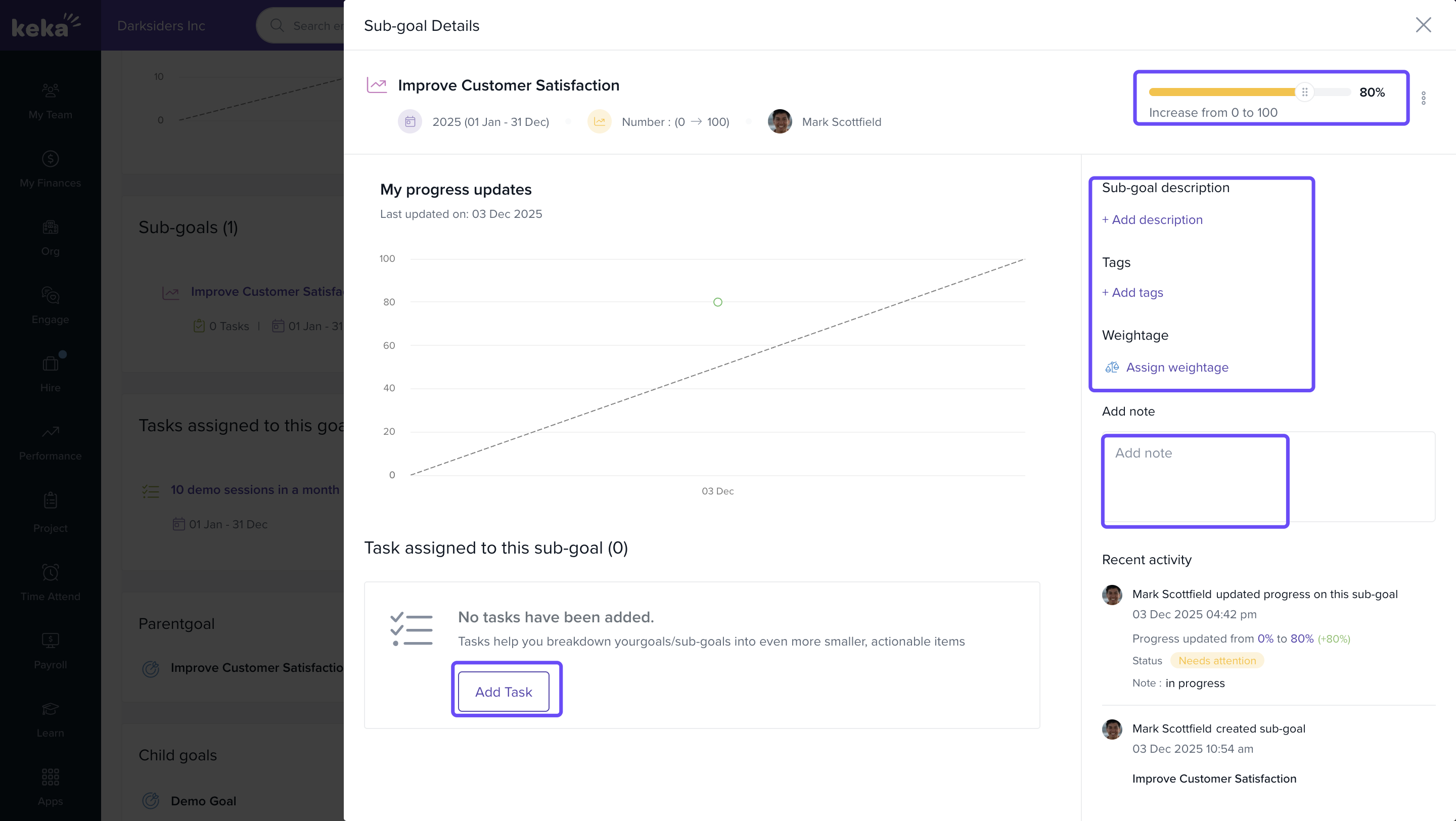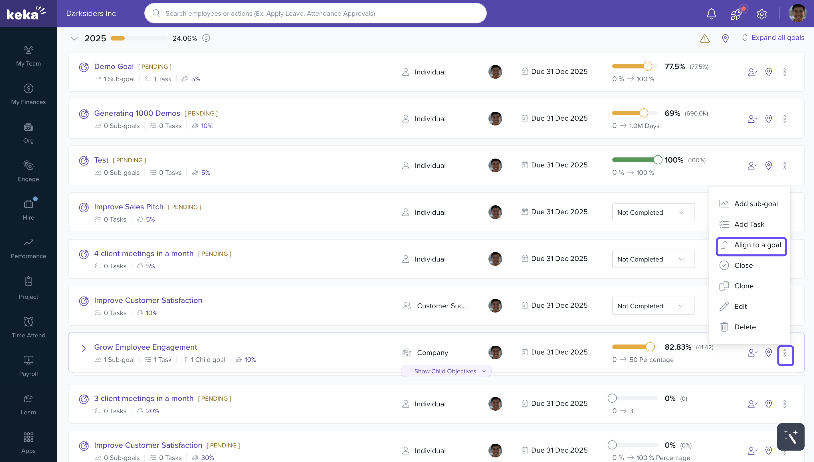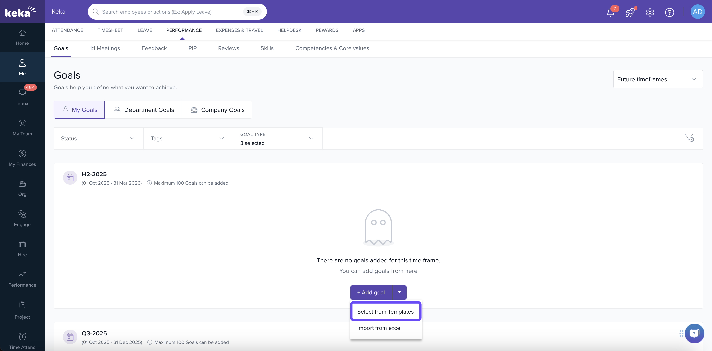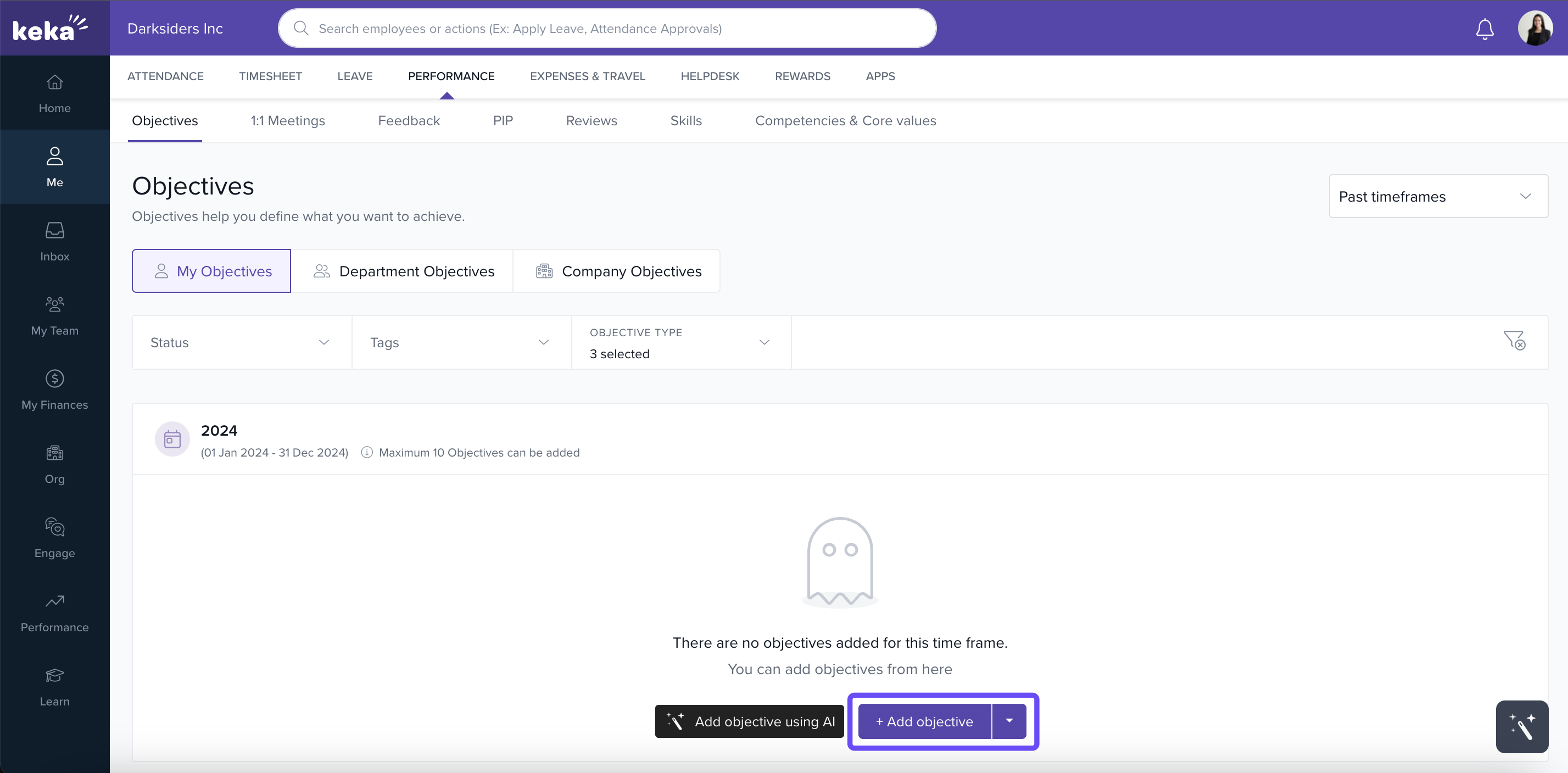 You can use Keka’s performance management features to set personal objectives (goals), break them down into measurable key results, and track progress over time. This helps you stay focused and aligned with team or company goals.