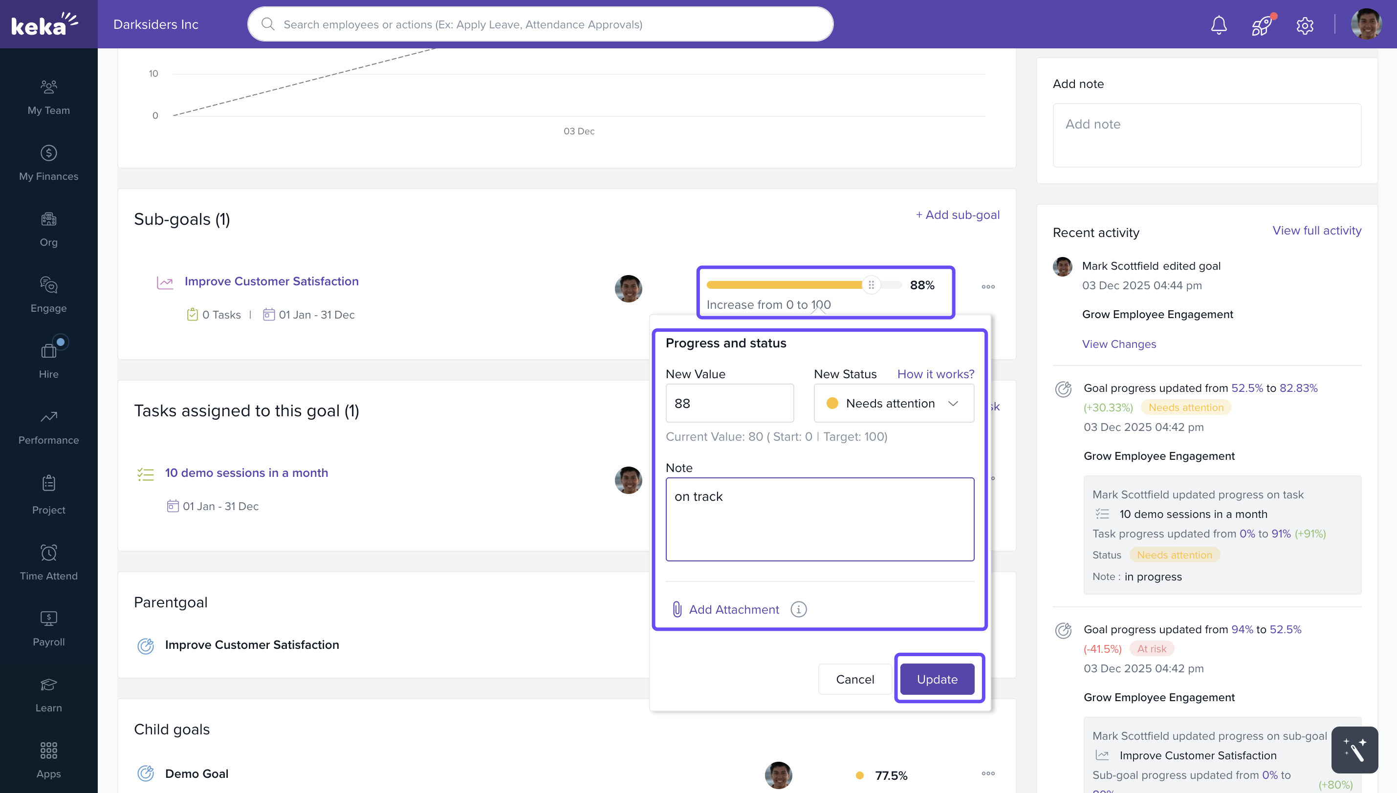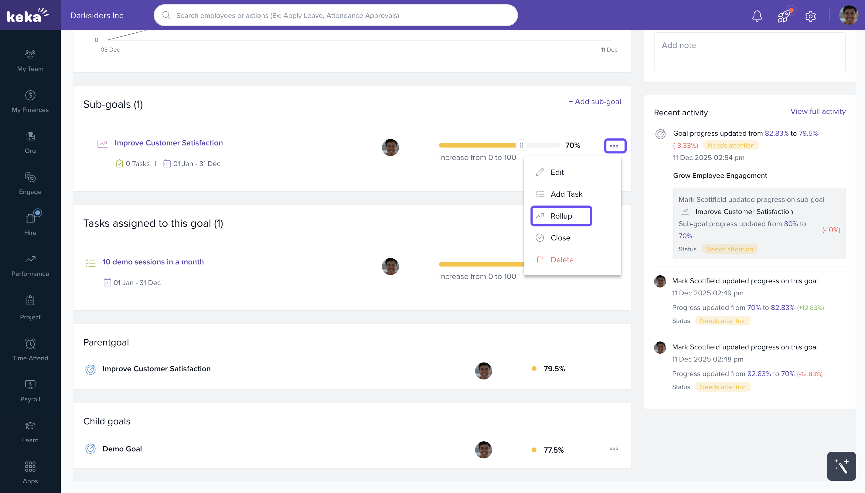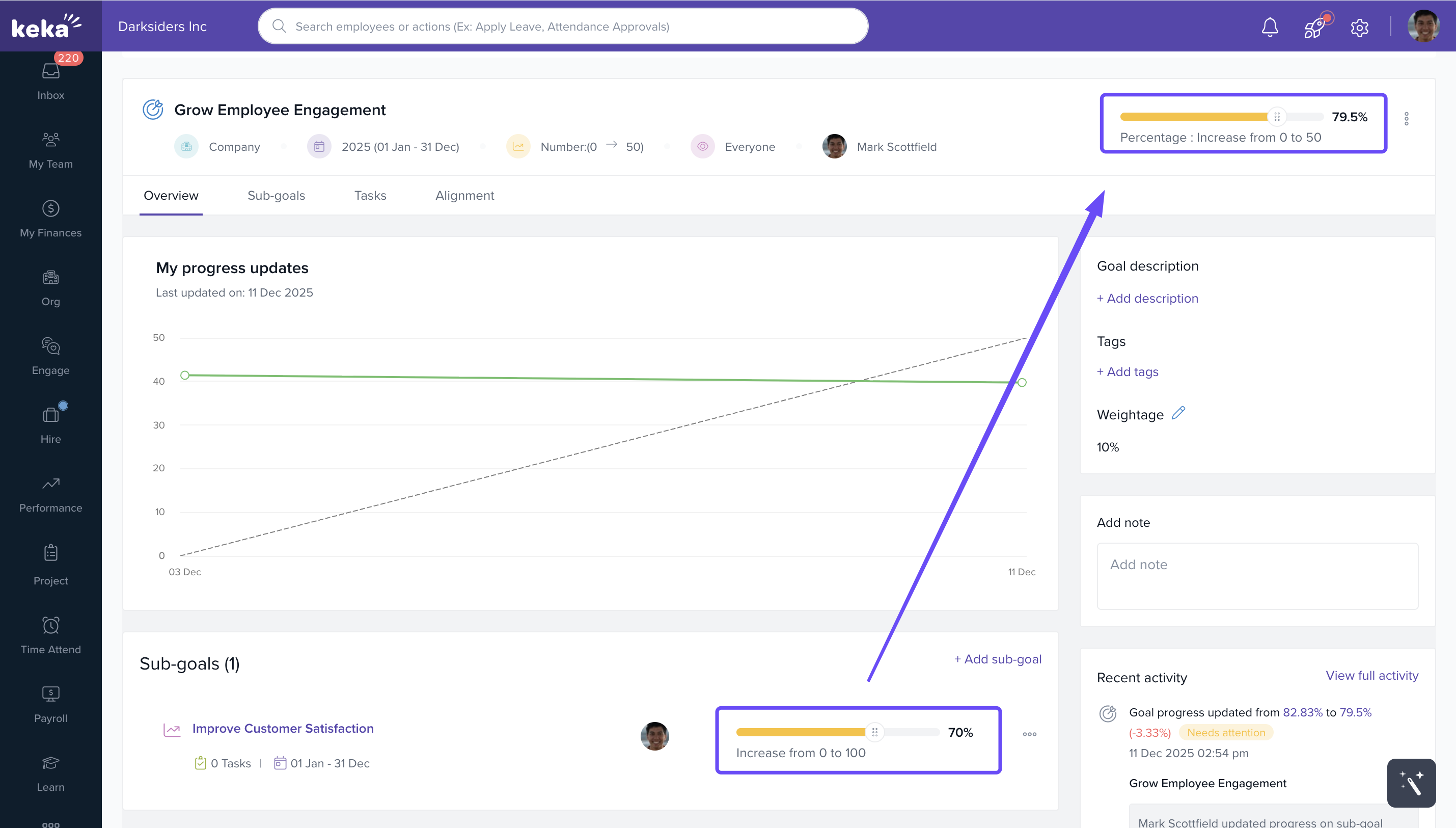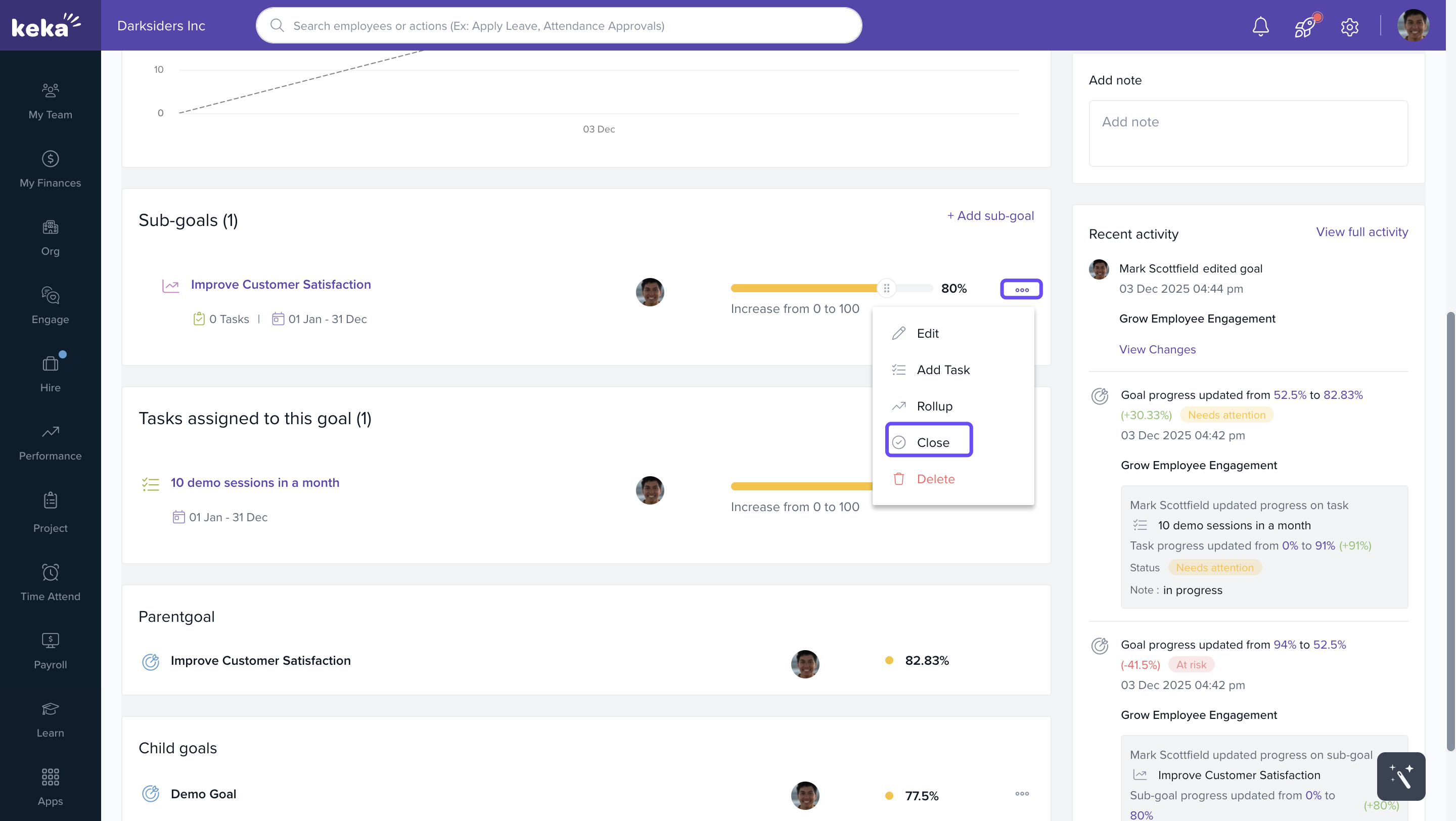 You can use Keka’s performance management features to set personal objectives (goals), break them down into measurable key results, and track progress over time. This helps you stay focused and aligned with team or company goals.