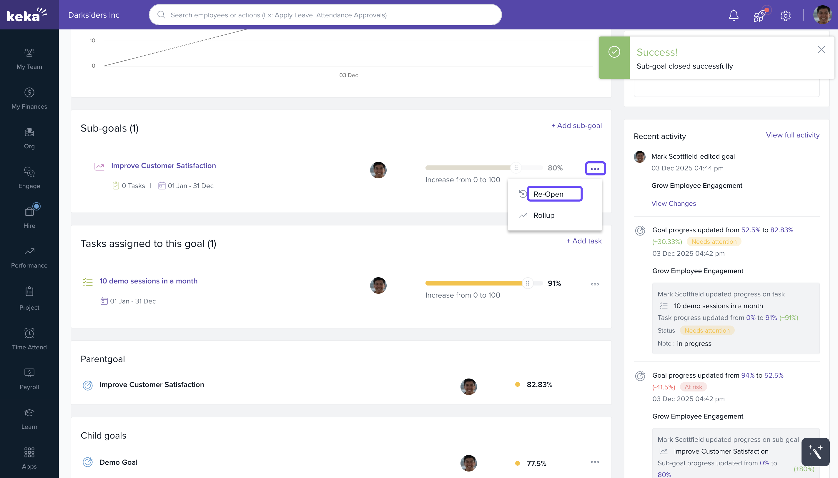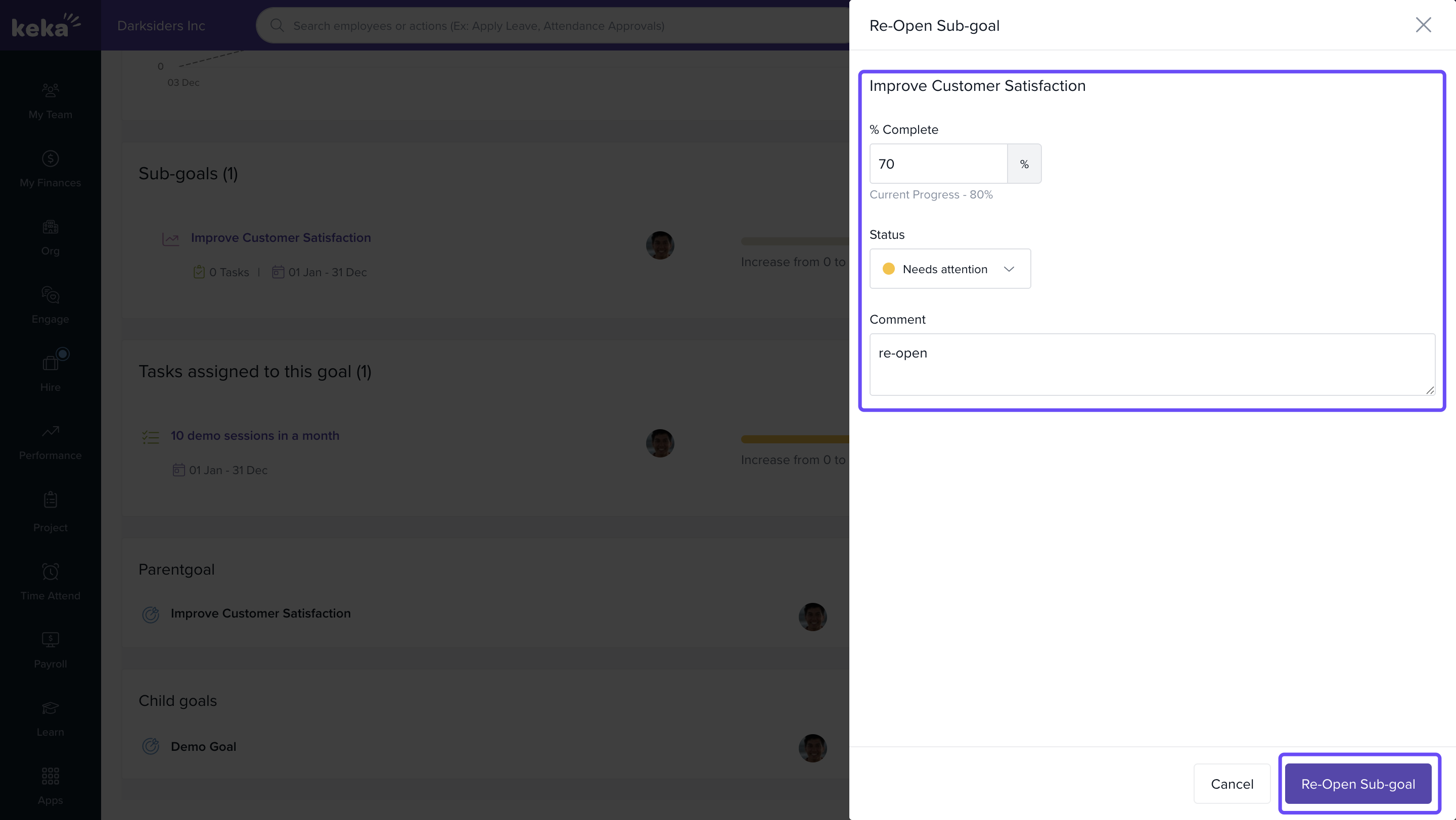 Enter a note and enter the progress percentage and click on Re-Open Sub-Goal.