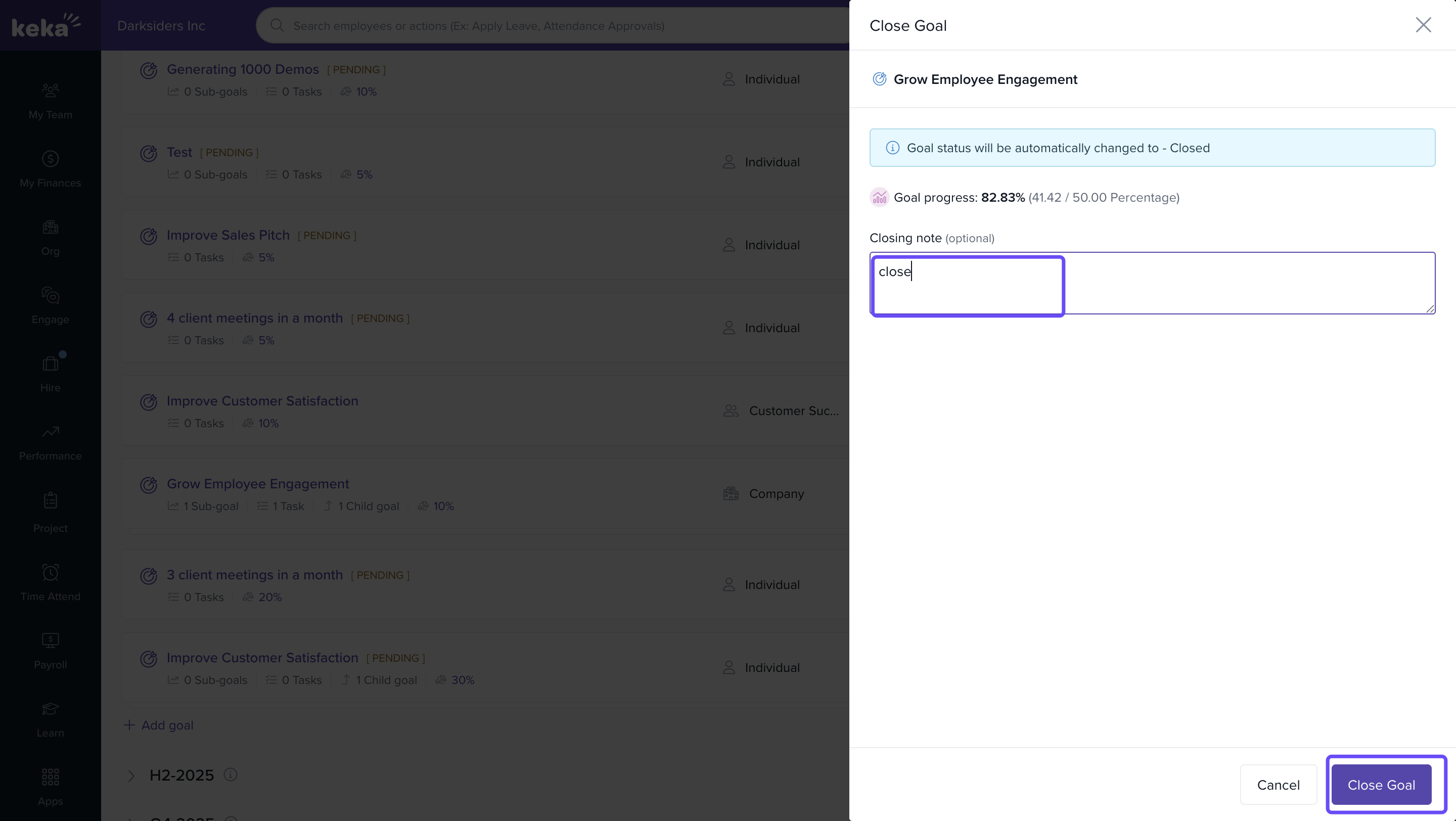 Enter a closing note and click on Close Goal.