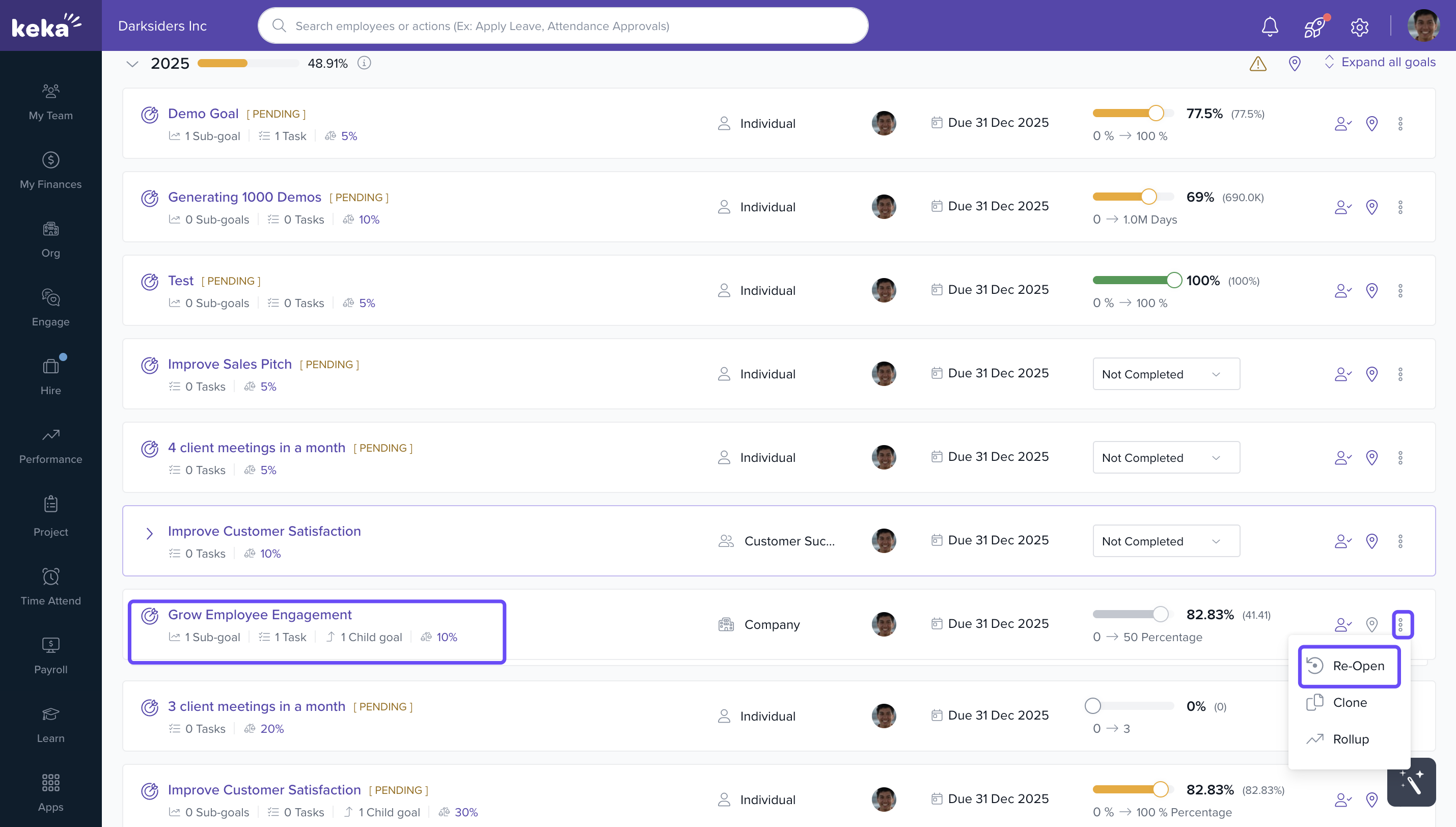 To re‑open a key-result, use the three dots menu and select Re‑open.
