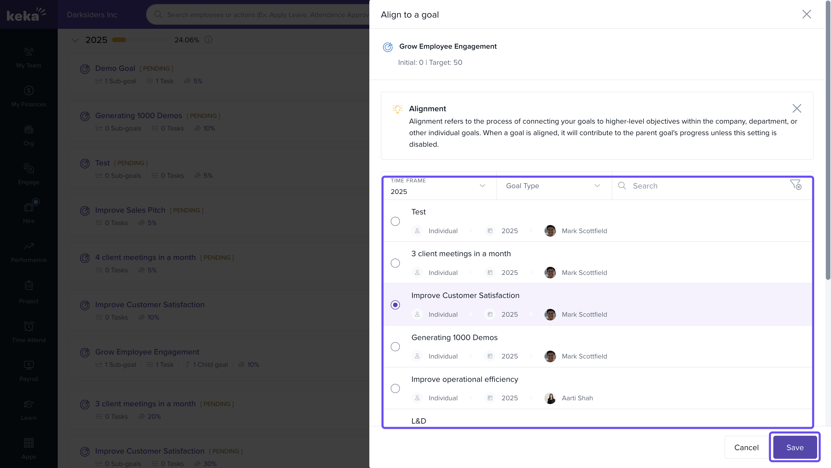 In the alignment window, see existing objectives at team or organizational level, and pick which one(s) your objective should be linked to.