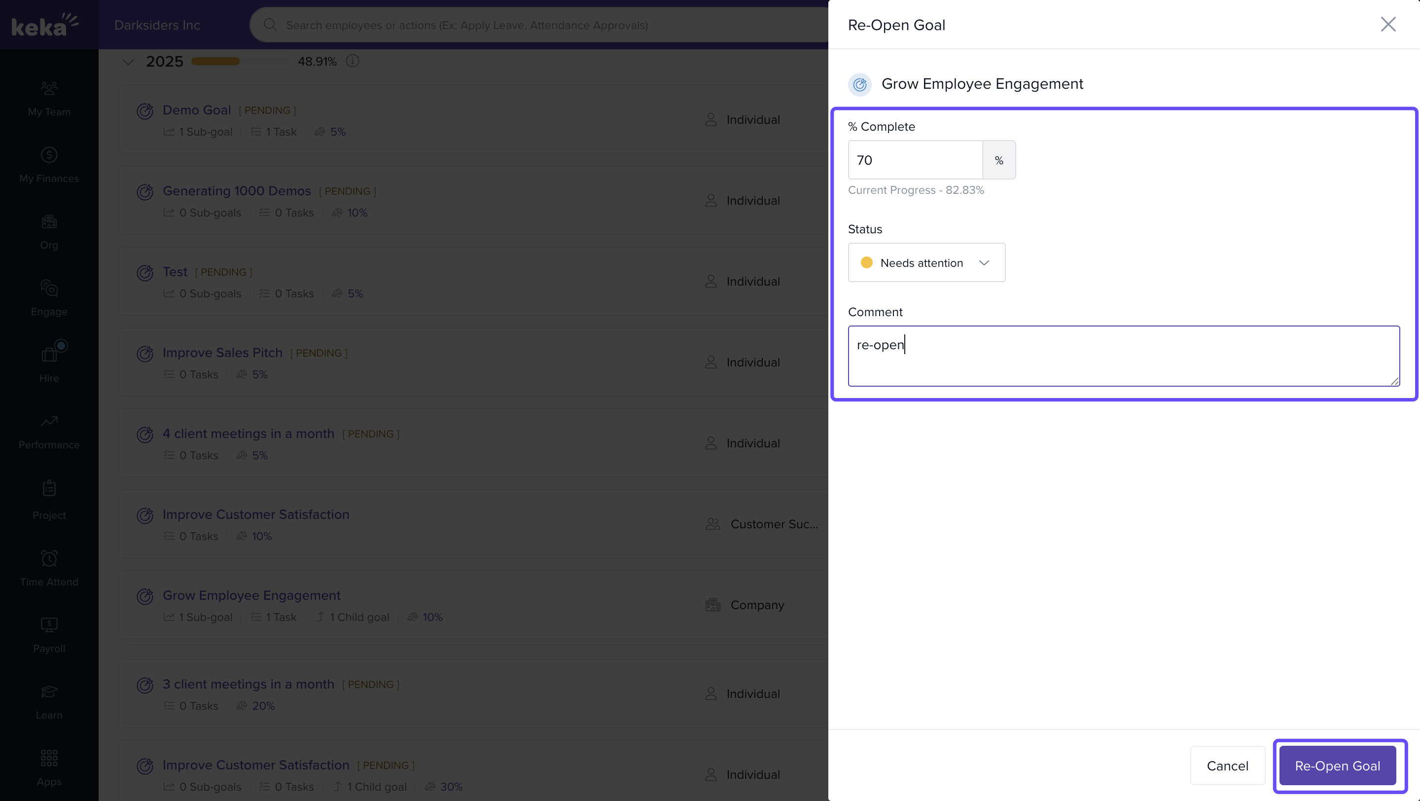 Enter a note and enter the progress percentage and click on Re-Open Goal.