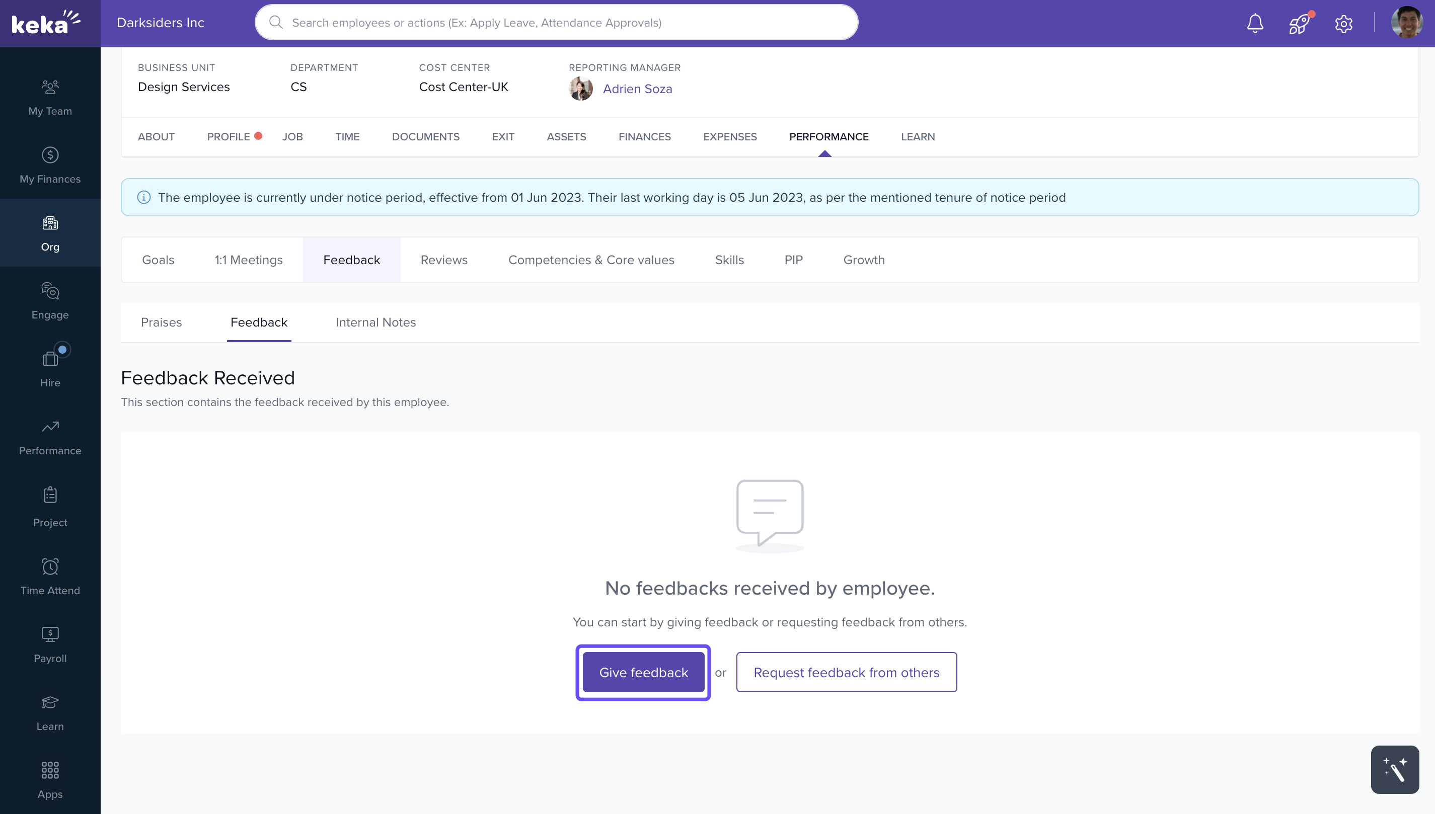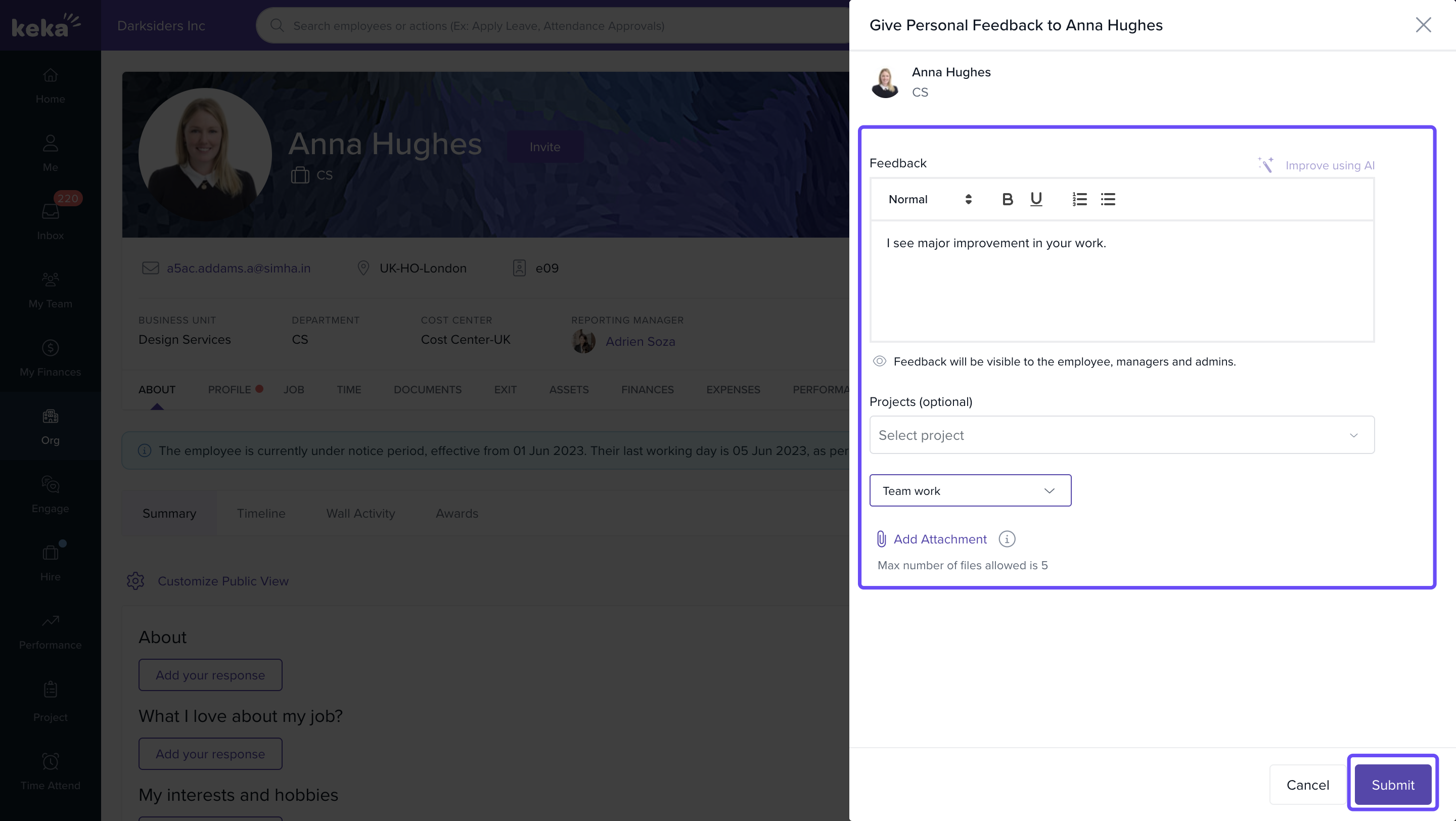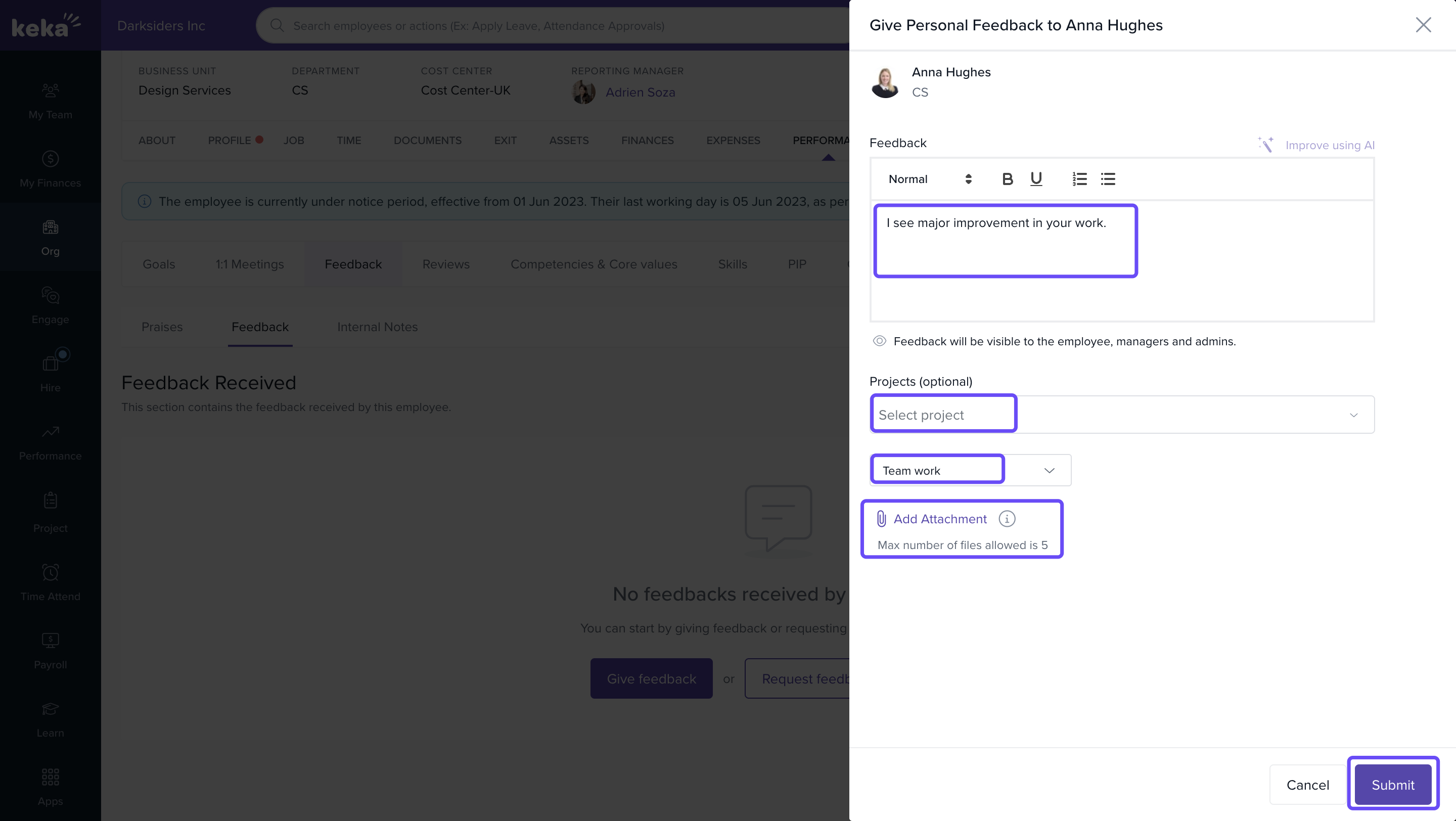 Providing feedback through Keka helps strengthen workplace culture by encouraging openness and growth. By following either of these two methods, you can contribute to a collaborative and productive environment while helping colleagues improve and succeed.