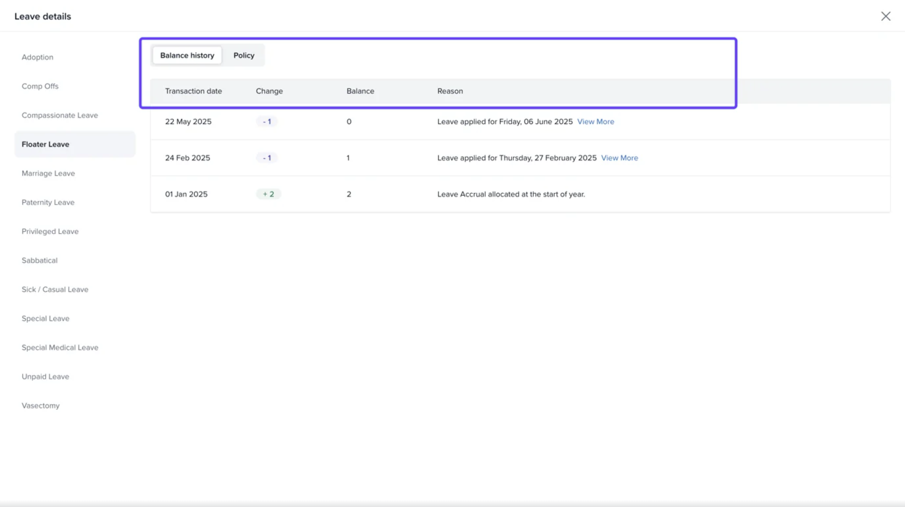In the Leave details page click on the leave type and you can see the Balance history along with Transaction date, Change, Balance etc.