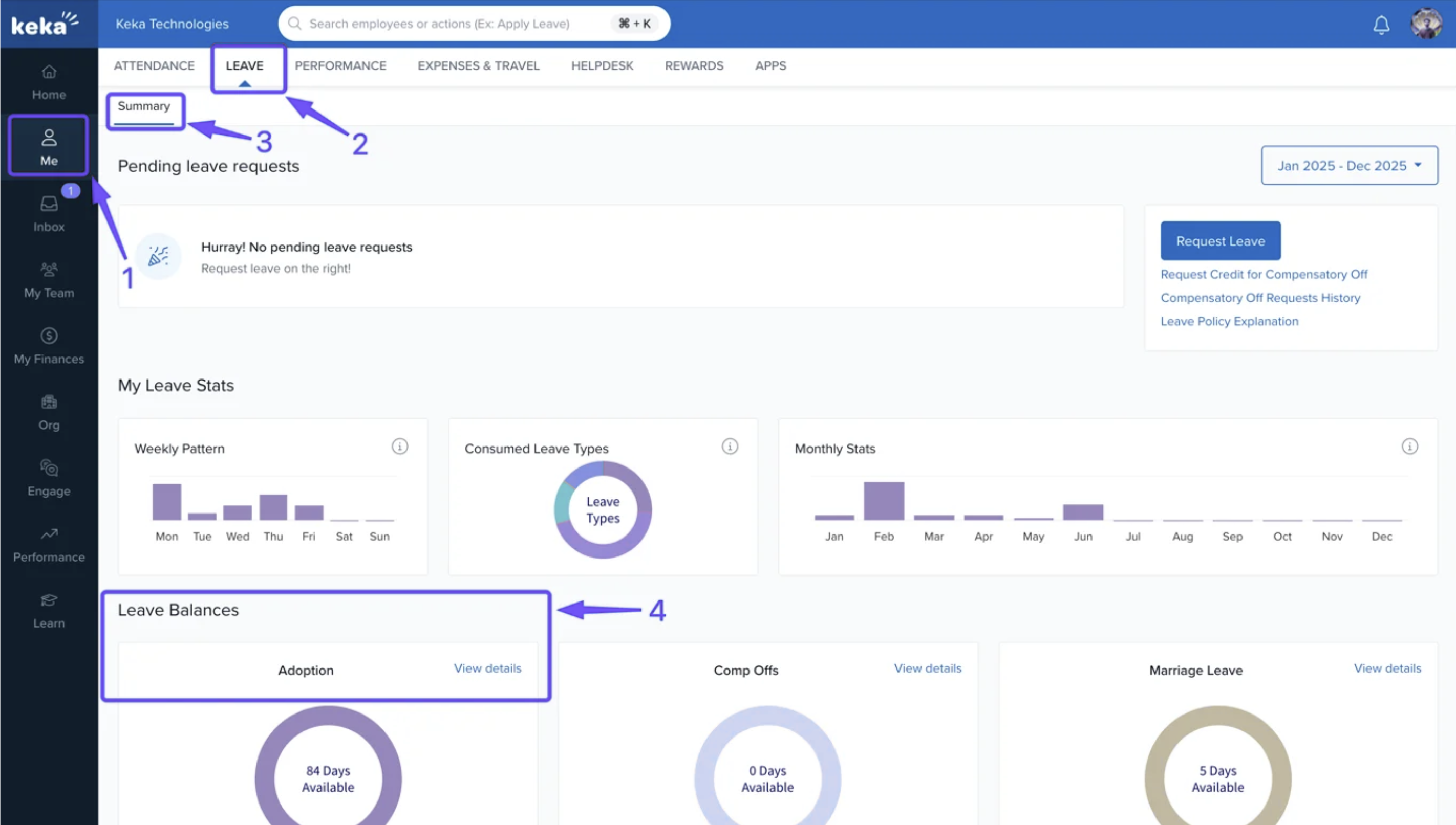 To check your Leave balance, go to the Me section on your Keka profile and navigate to Leave tab, You will be landed on the summary page. Here under Leave Balances section click on View details for any of the leave type.