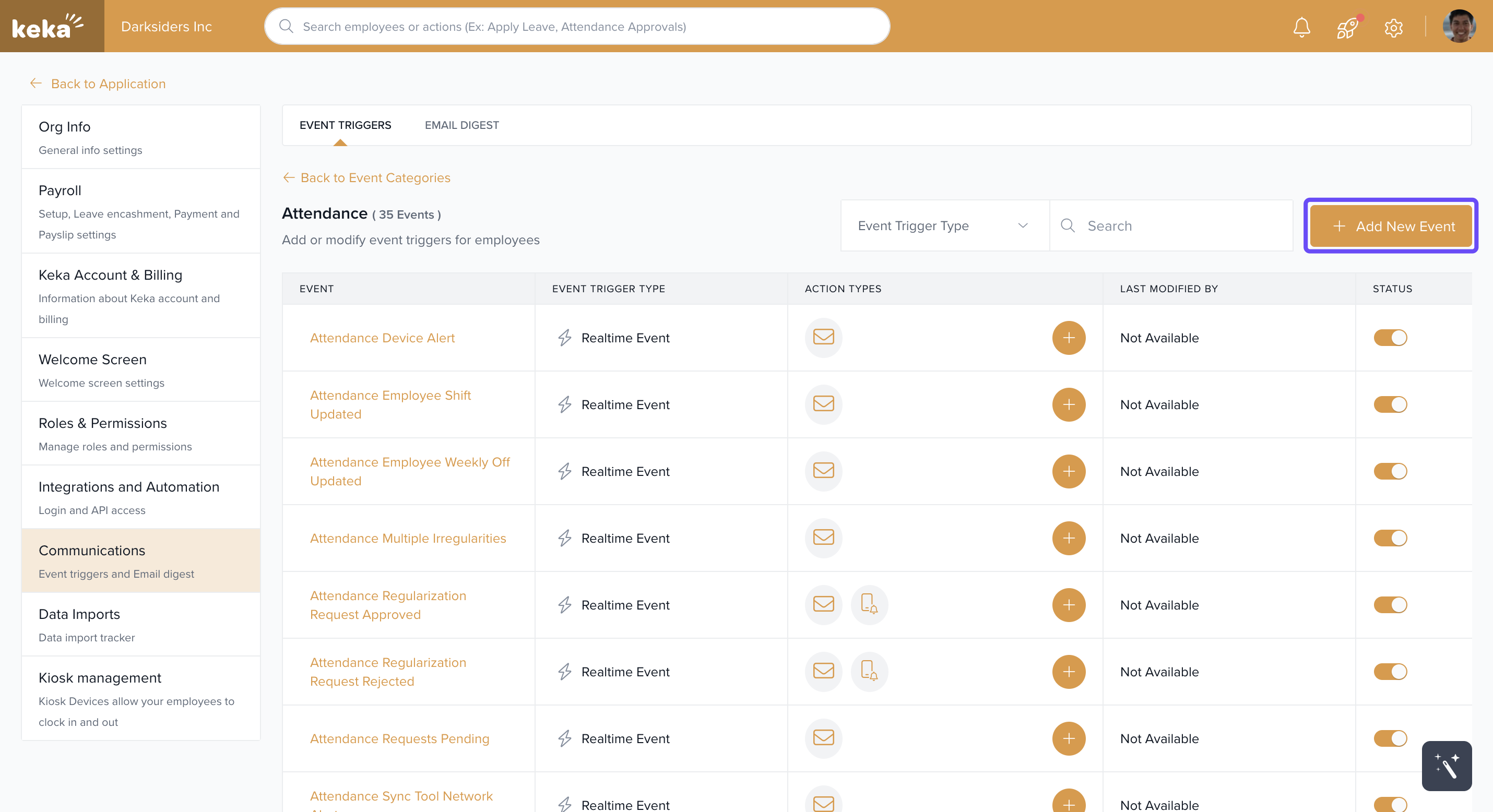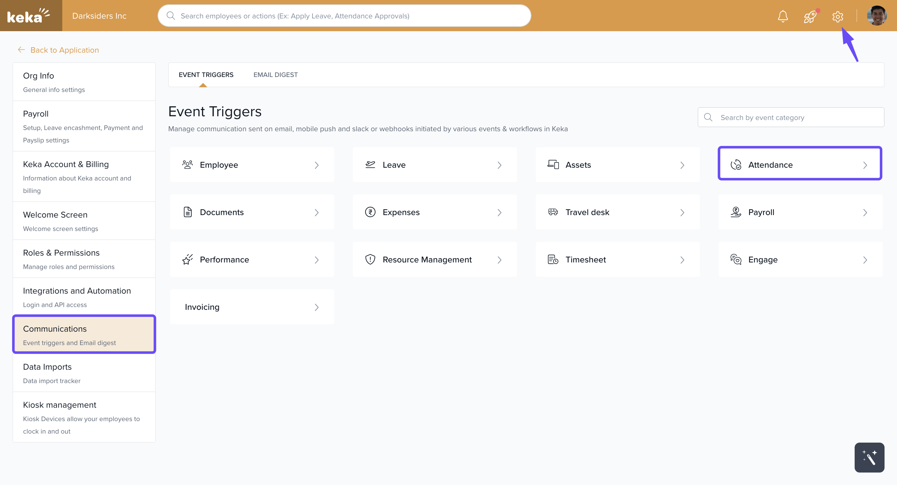 From the left-hand panel, go to Global Settings > Communications > Event Triggers > Attendance.