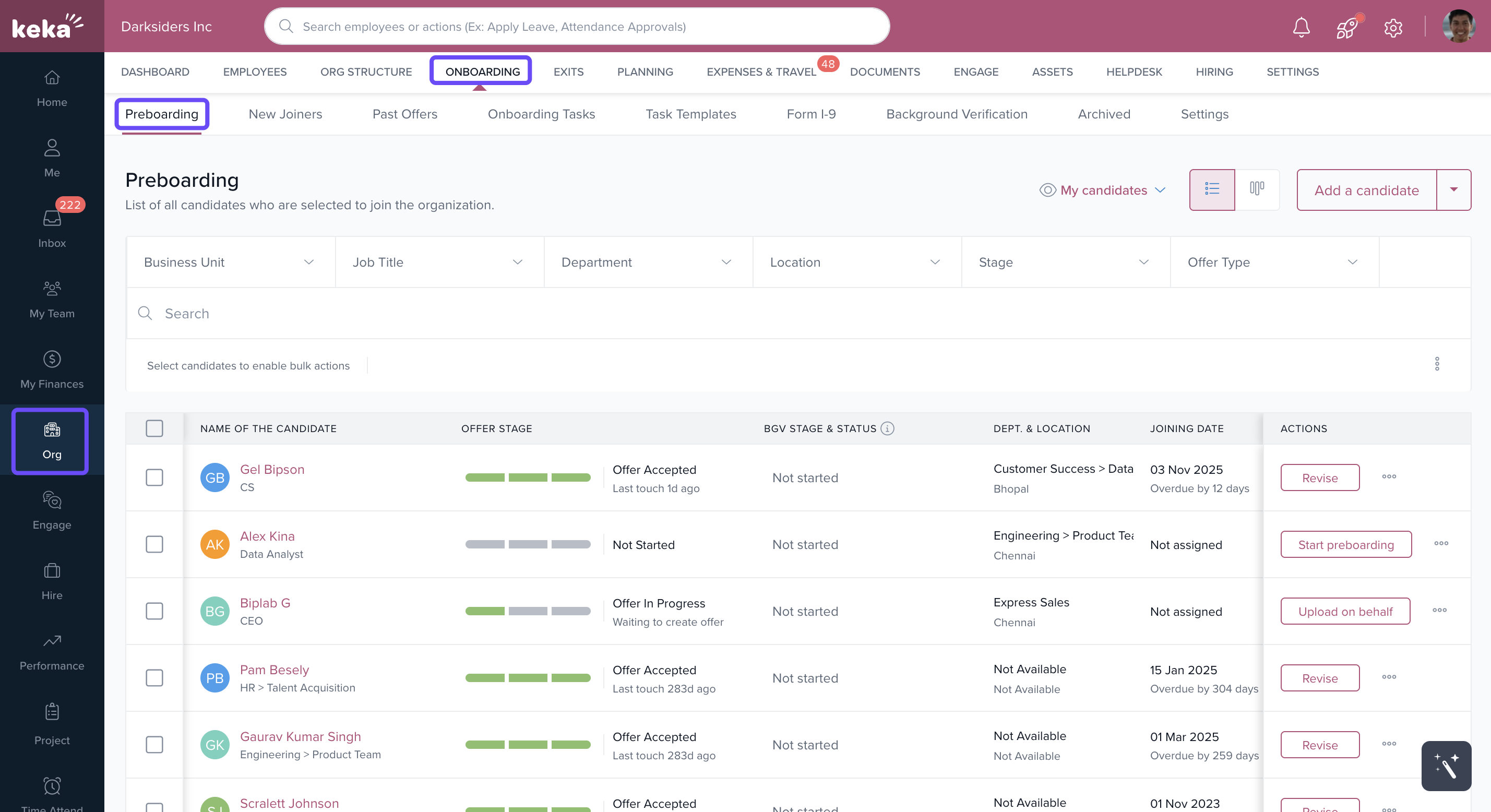 Sometimes candidates delay accepting their offer letter, which can slow down the hiring process. Keka helps you stay on track by letting you send a reminder email directly from the Preboarding section.