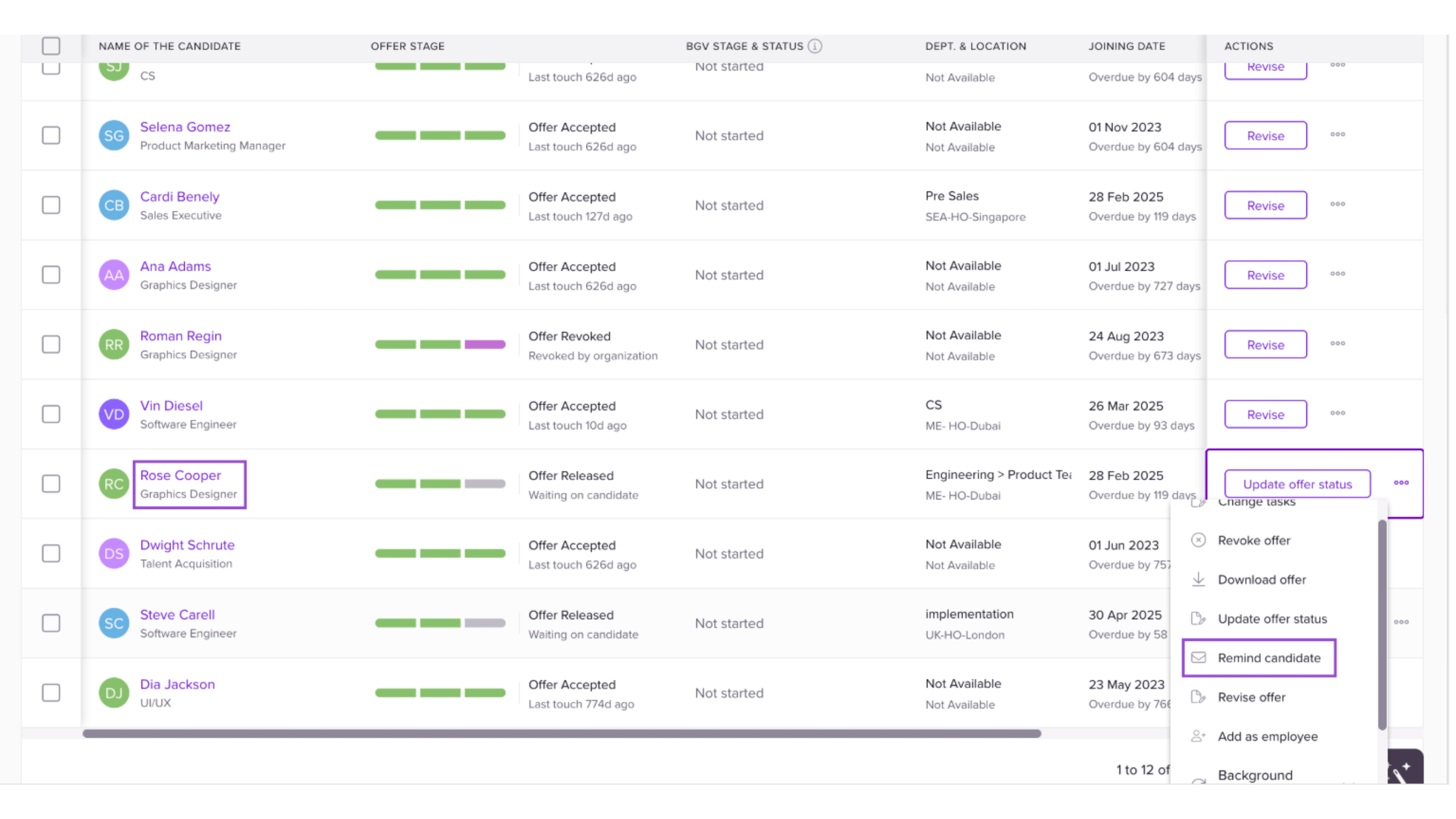 Note: The Reminder candidate option only appears if the offer letter has been issued but hasn’t yet been accepted by the candidate.