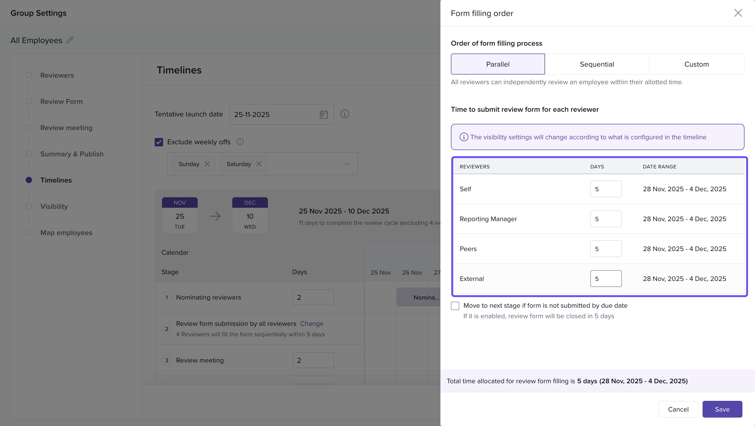 Here, you can specify the number of days allocated for both Self and Reporting Manager reviews. After making your adjustments to the number of days, click Save to apply the changes.