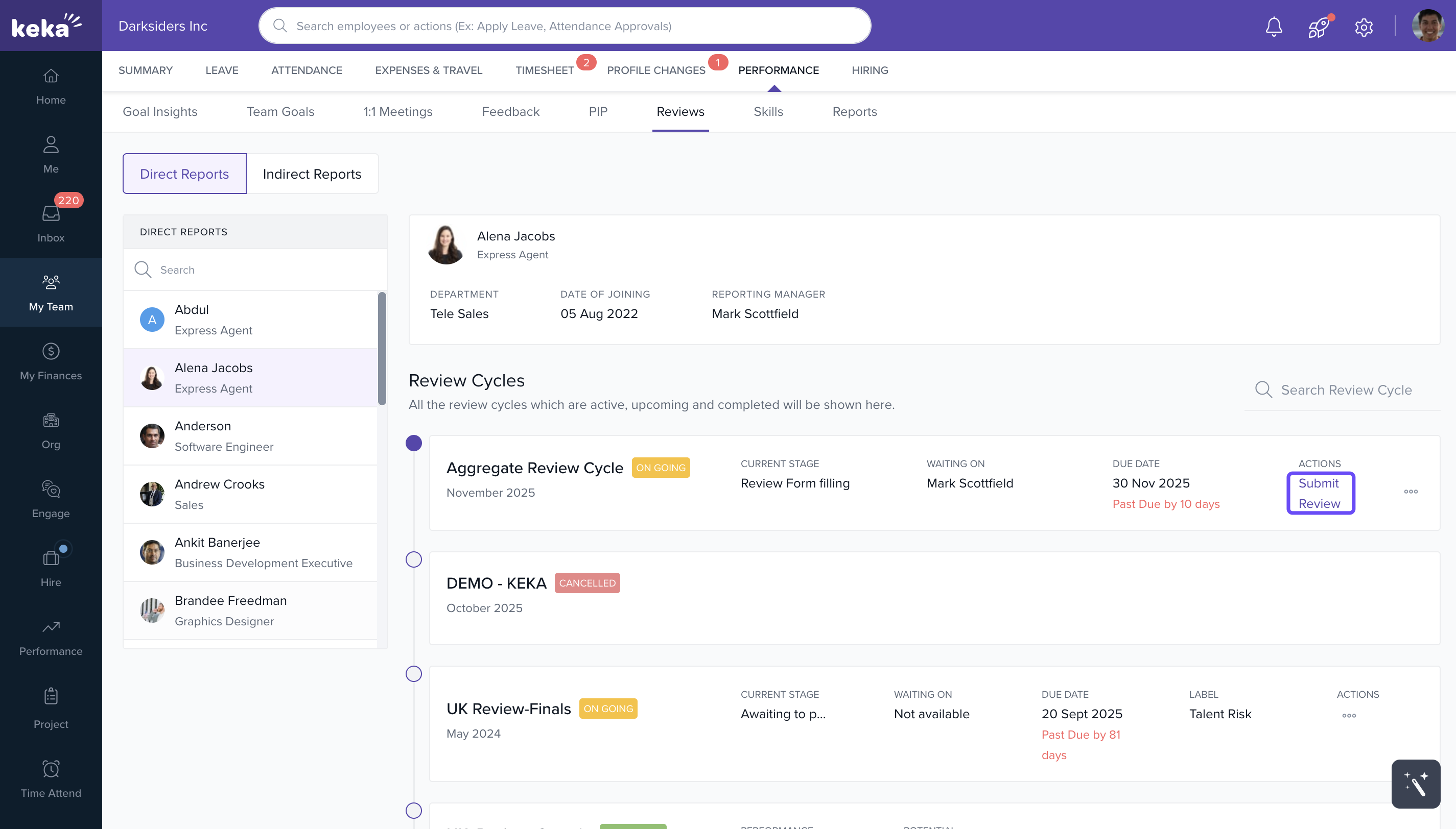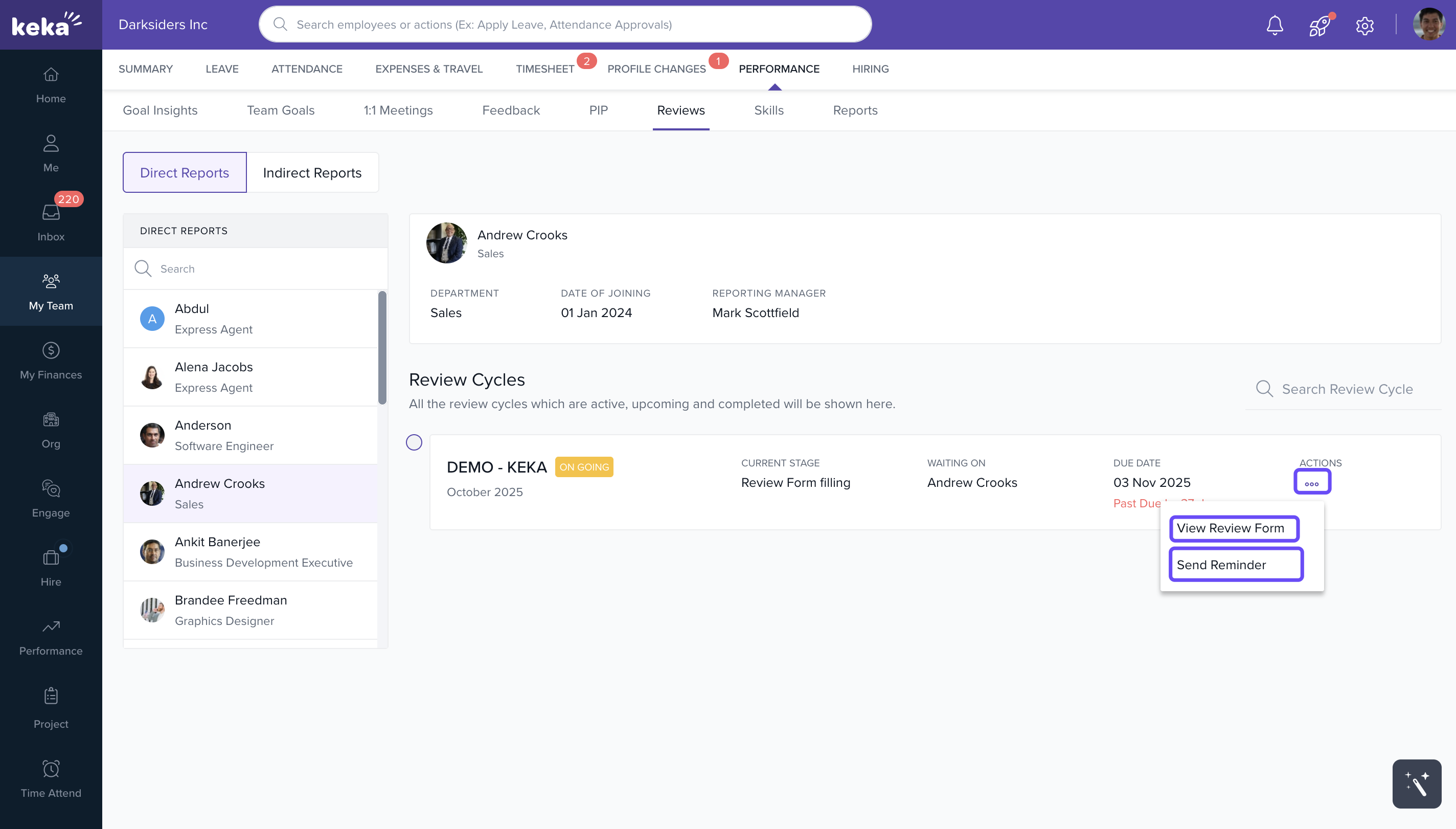 As a manager, you can monitor your team’s review activity during a performance cycle in Keka. This helps ensure employees complete required steps and allows you to step in when needed.