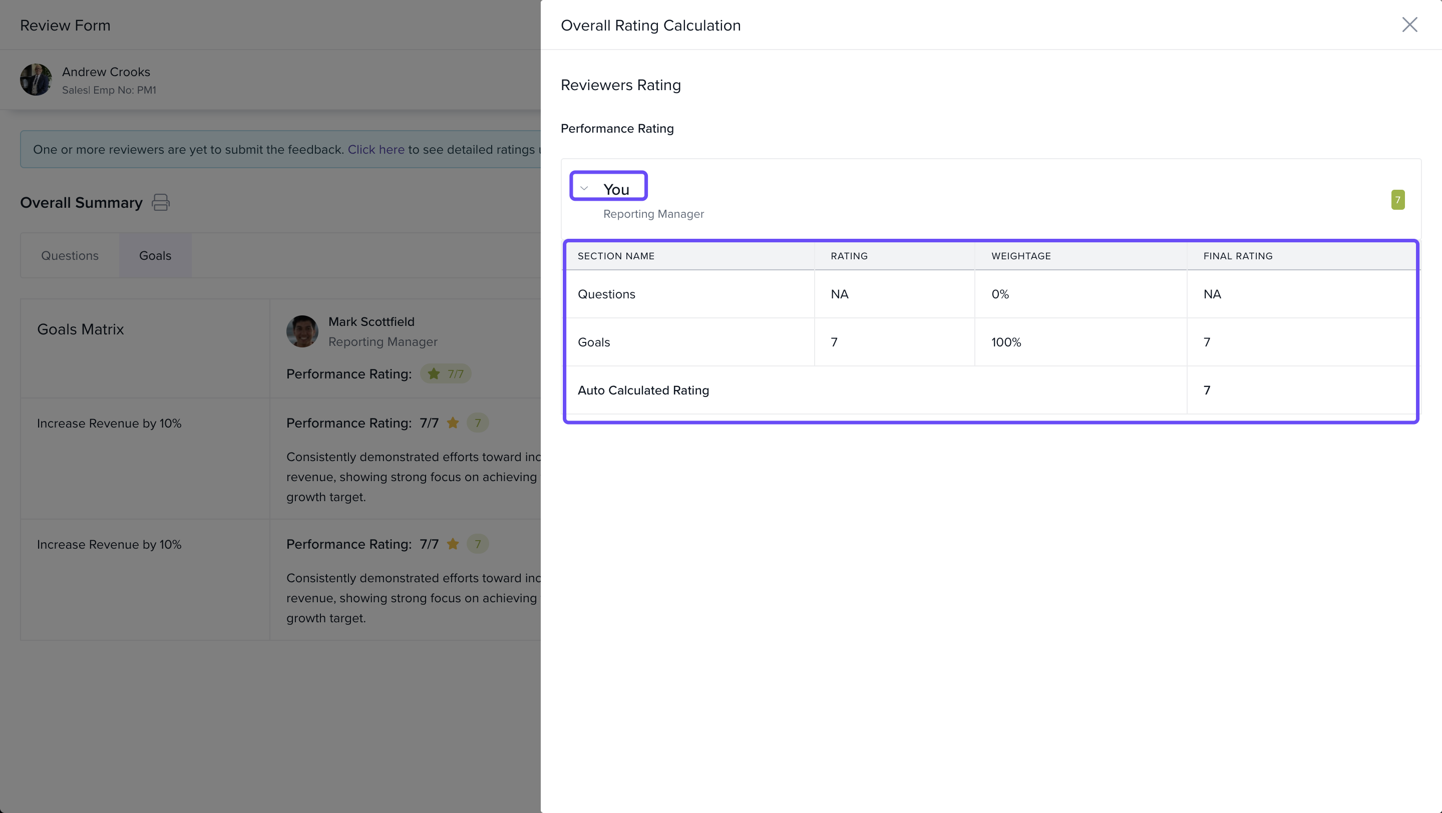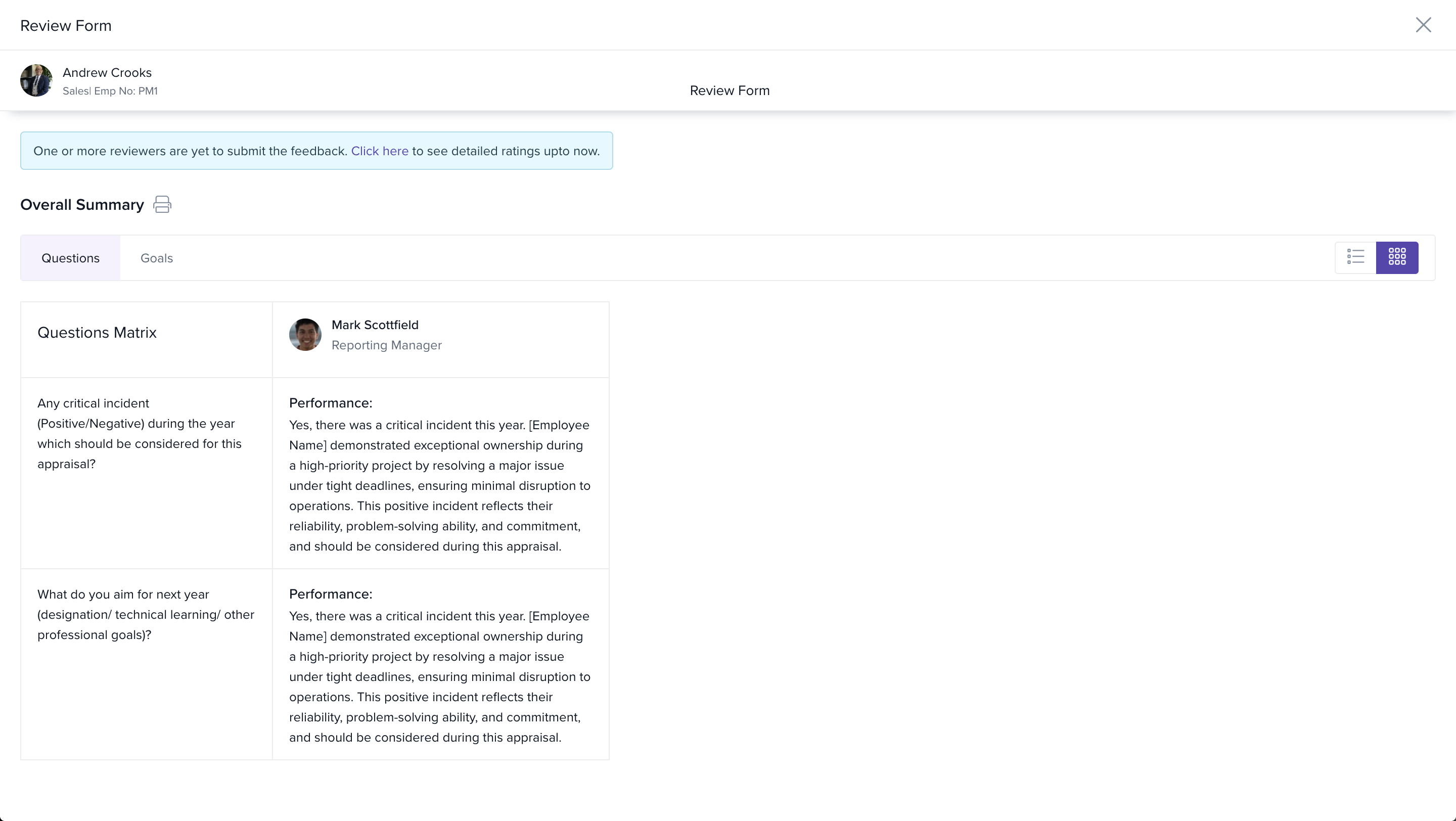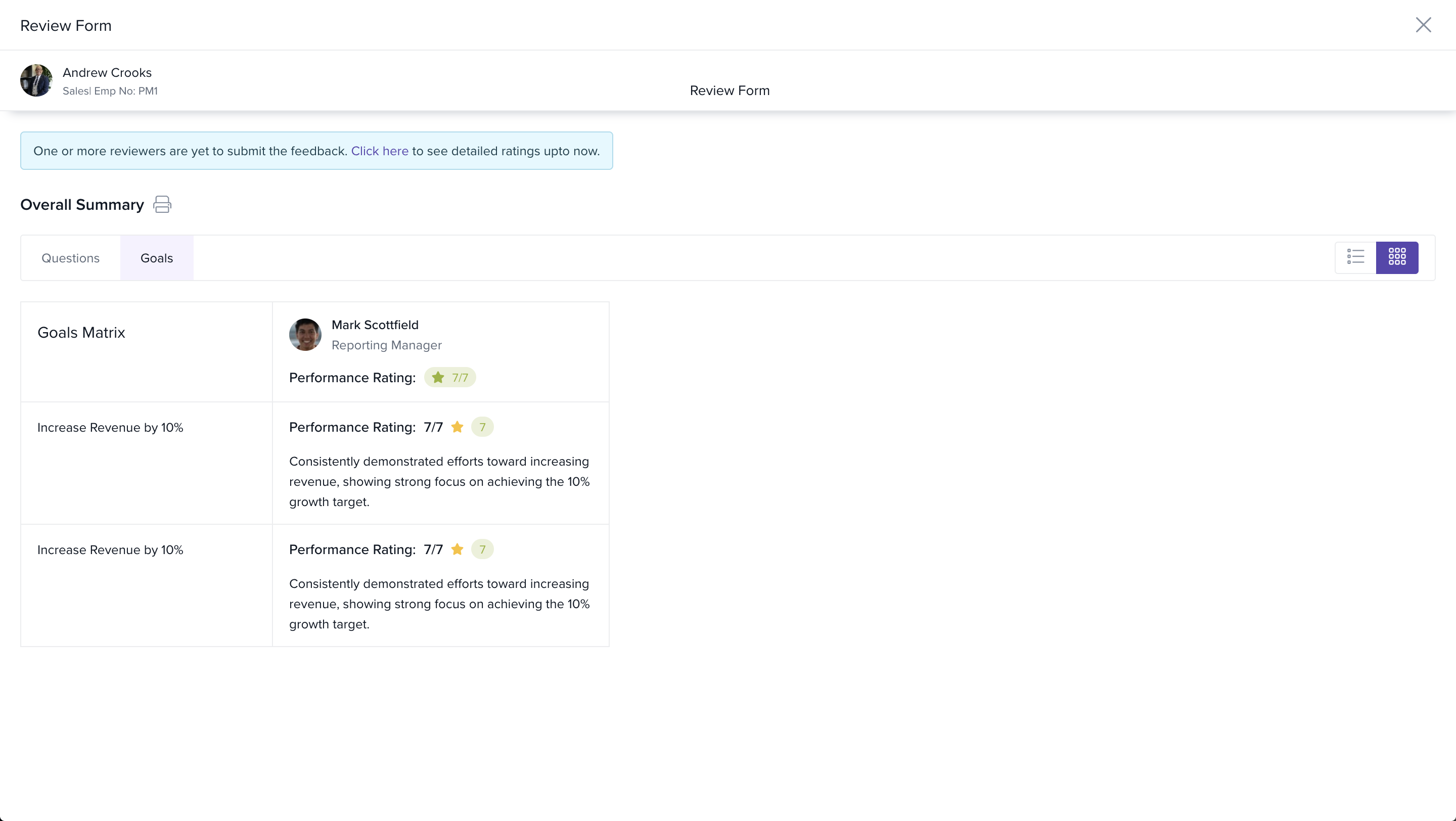 Click on any employee’s name to view their review cycles (active, upcoming, and completed).