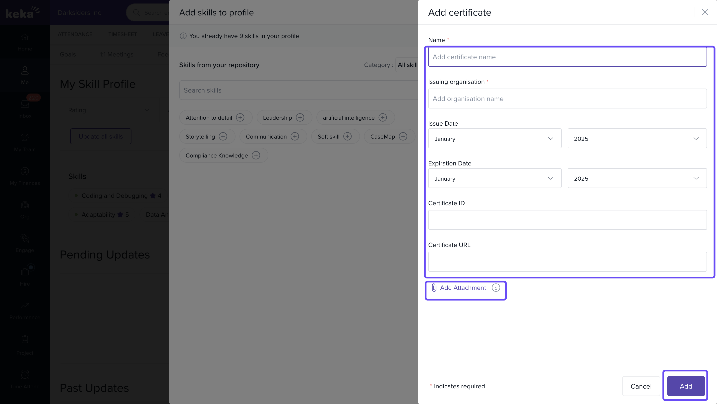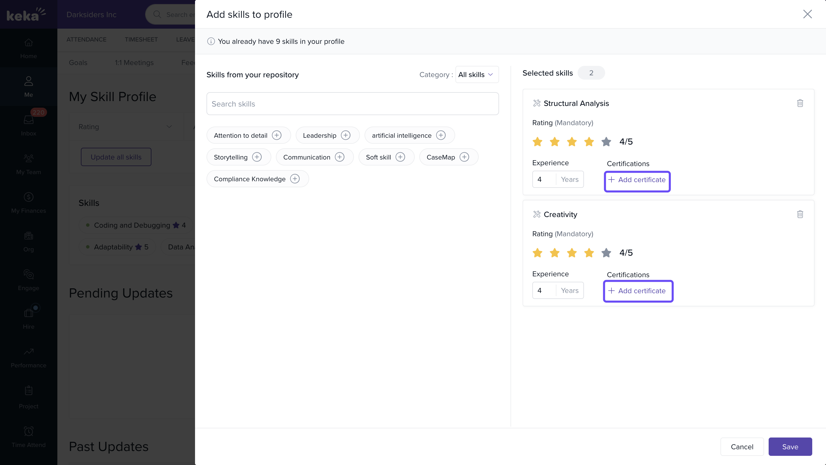 Your Skills profile in Keka lets you list and rate your professional skills, attach certificates, and track your growth. Updating it regularly helps showcase your strengths, align with internal opportunities, and support reviews and learning plans.