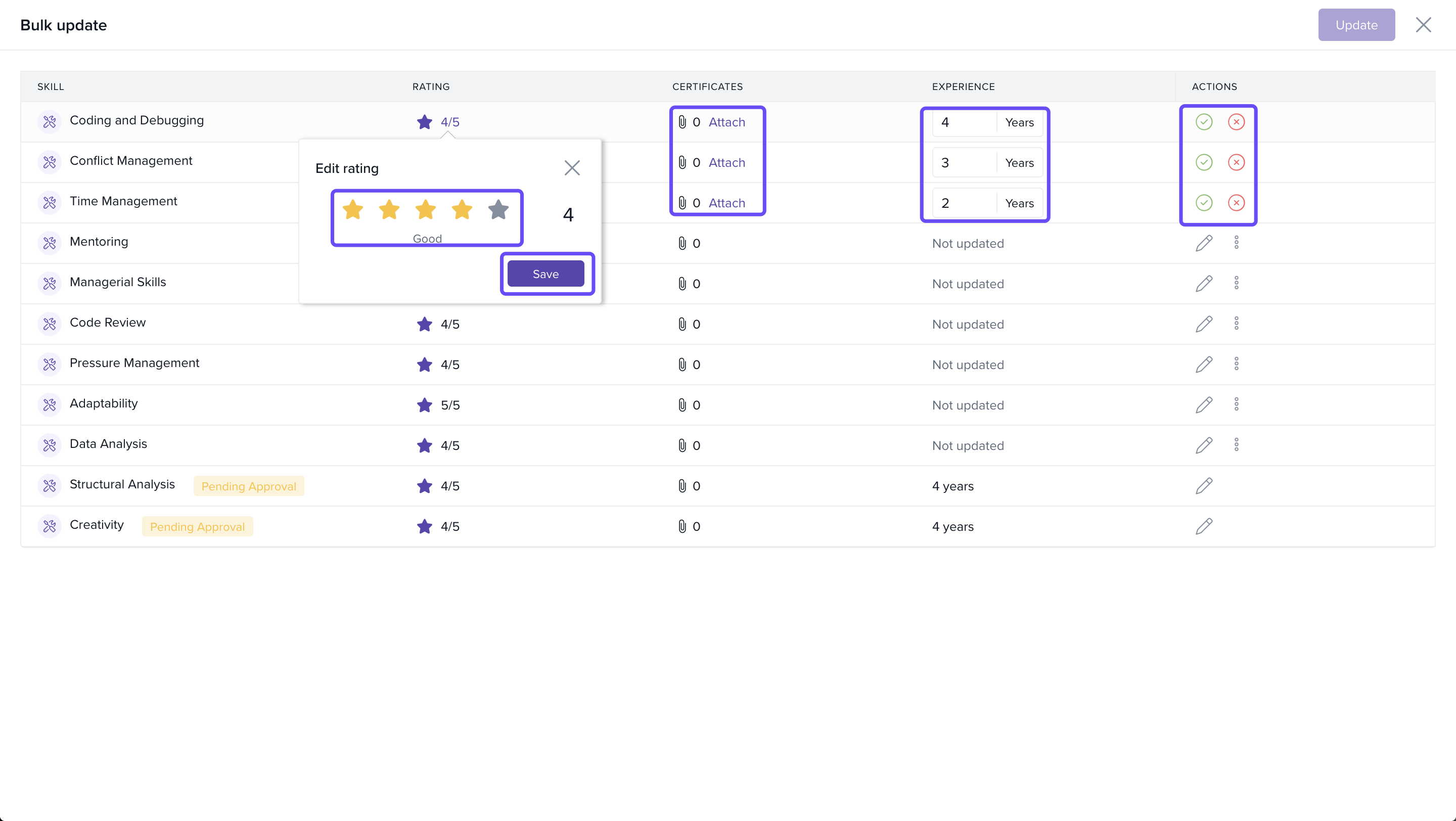 Note: Some fields (e.g. certificates or behaviours) may not be editable, depending on your org’s settings. Review your skill list occasionally to keep it relevant and current.