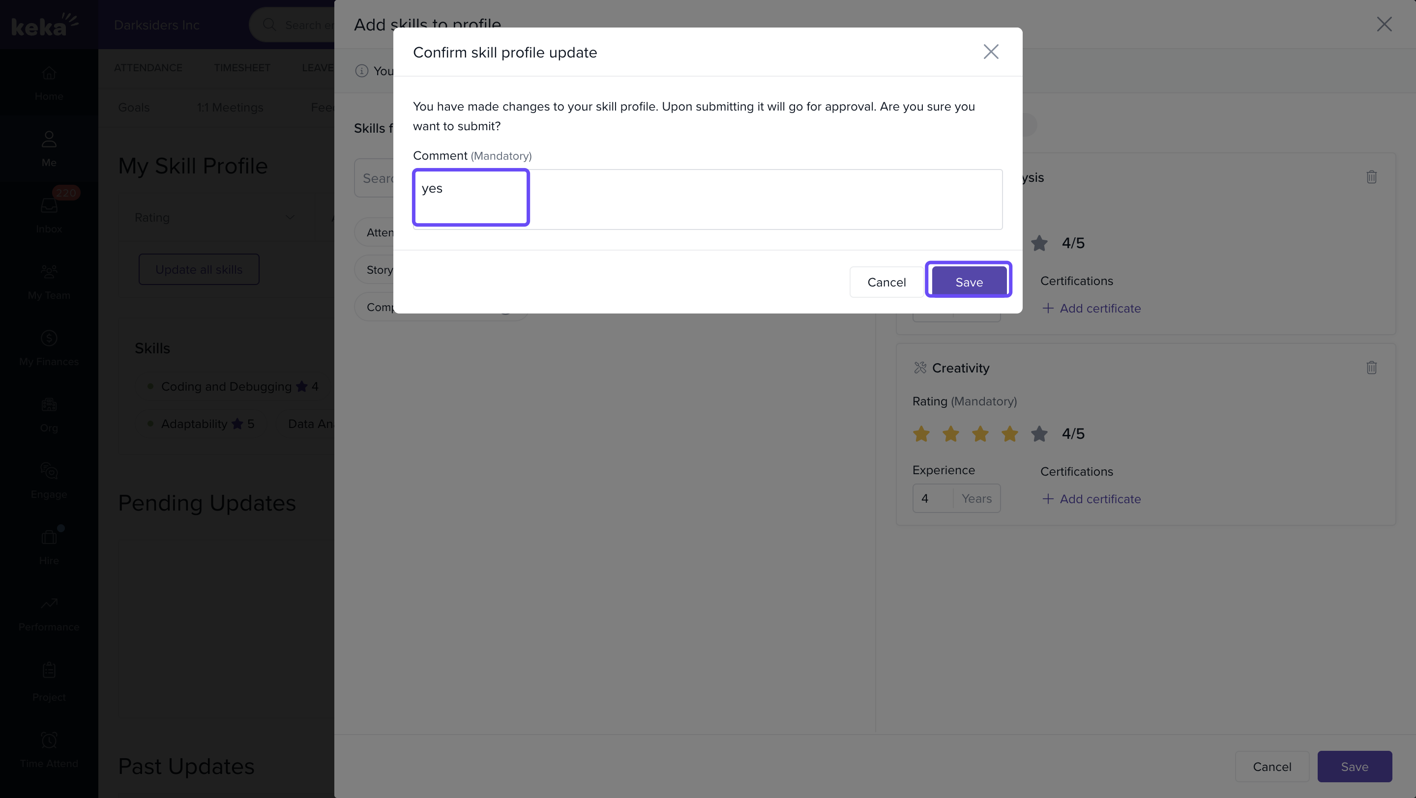 - If your organisation uses an approval workflow, you might need to add a comment explaining why you're adding or updating a skill.