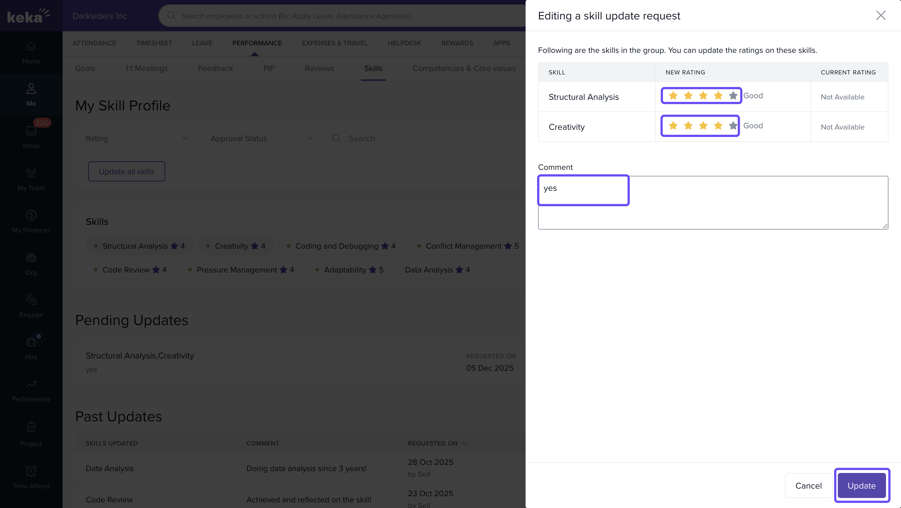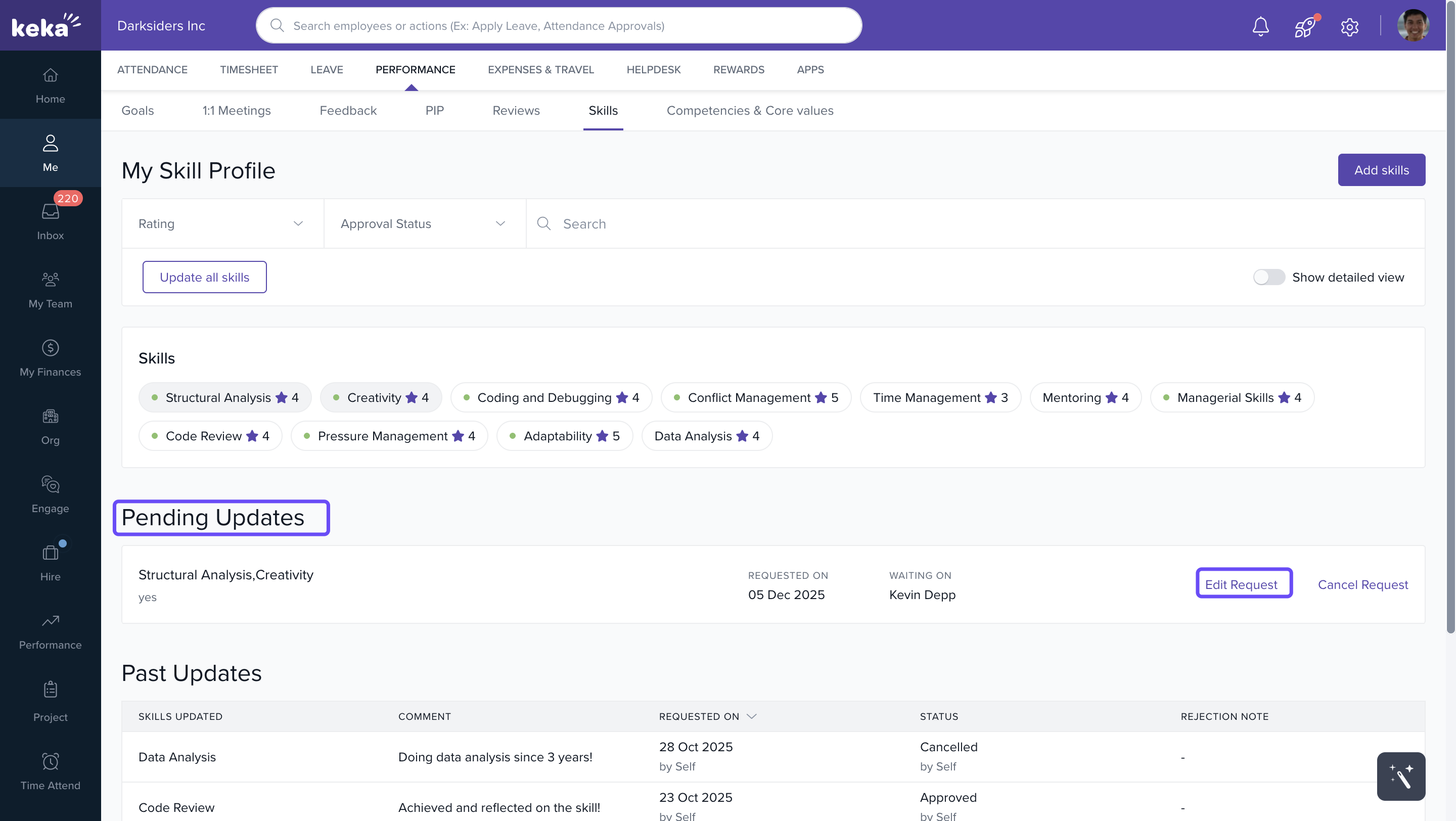 Click the edit request option next to a skill under Pending Updates section to edit details, such as: