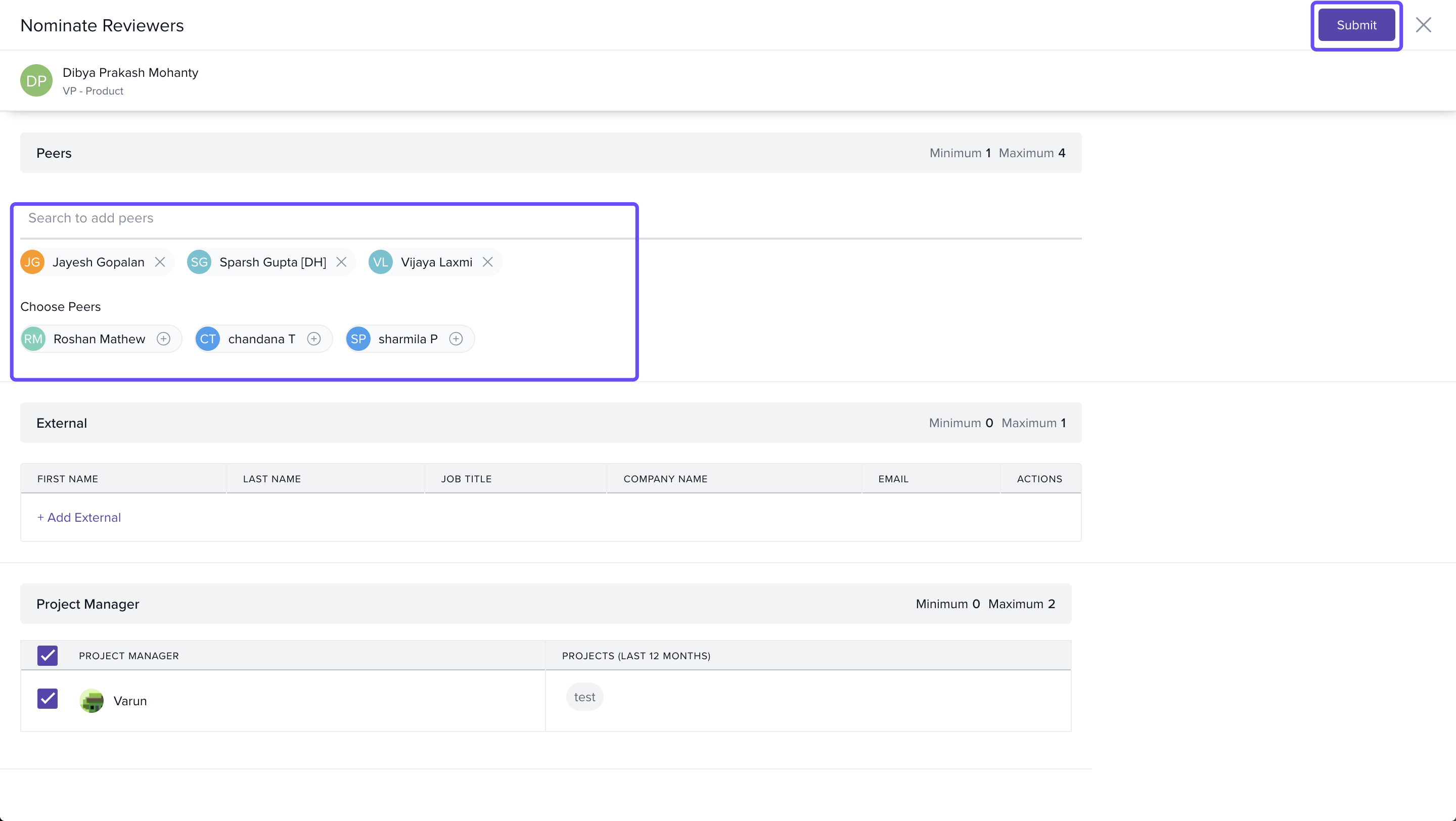 - Select relevant peers, external reviewers, custom participants, subordinates, or project managers for the employee’s review.