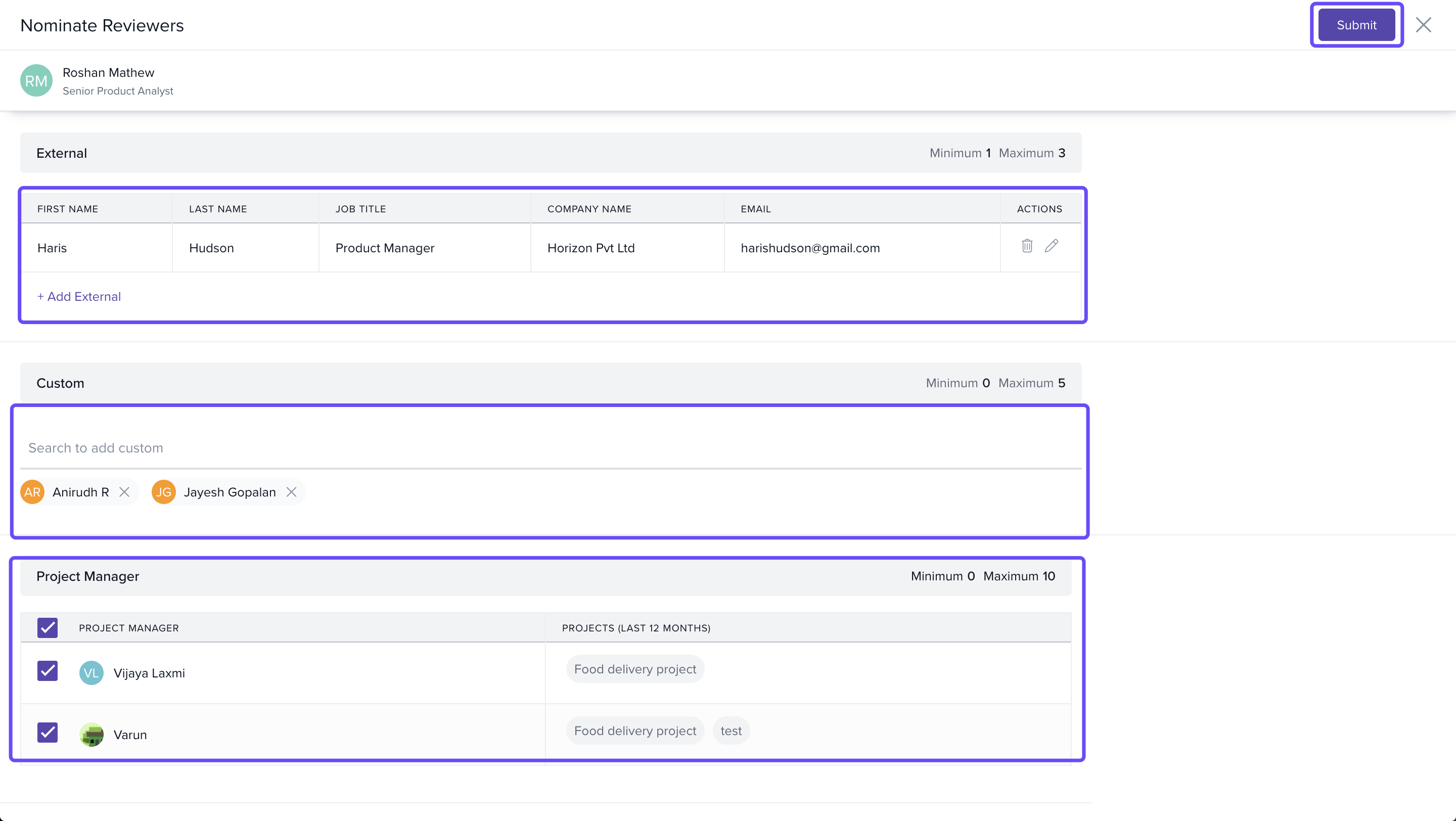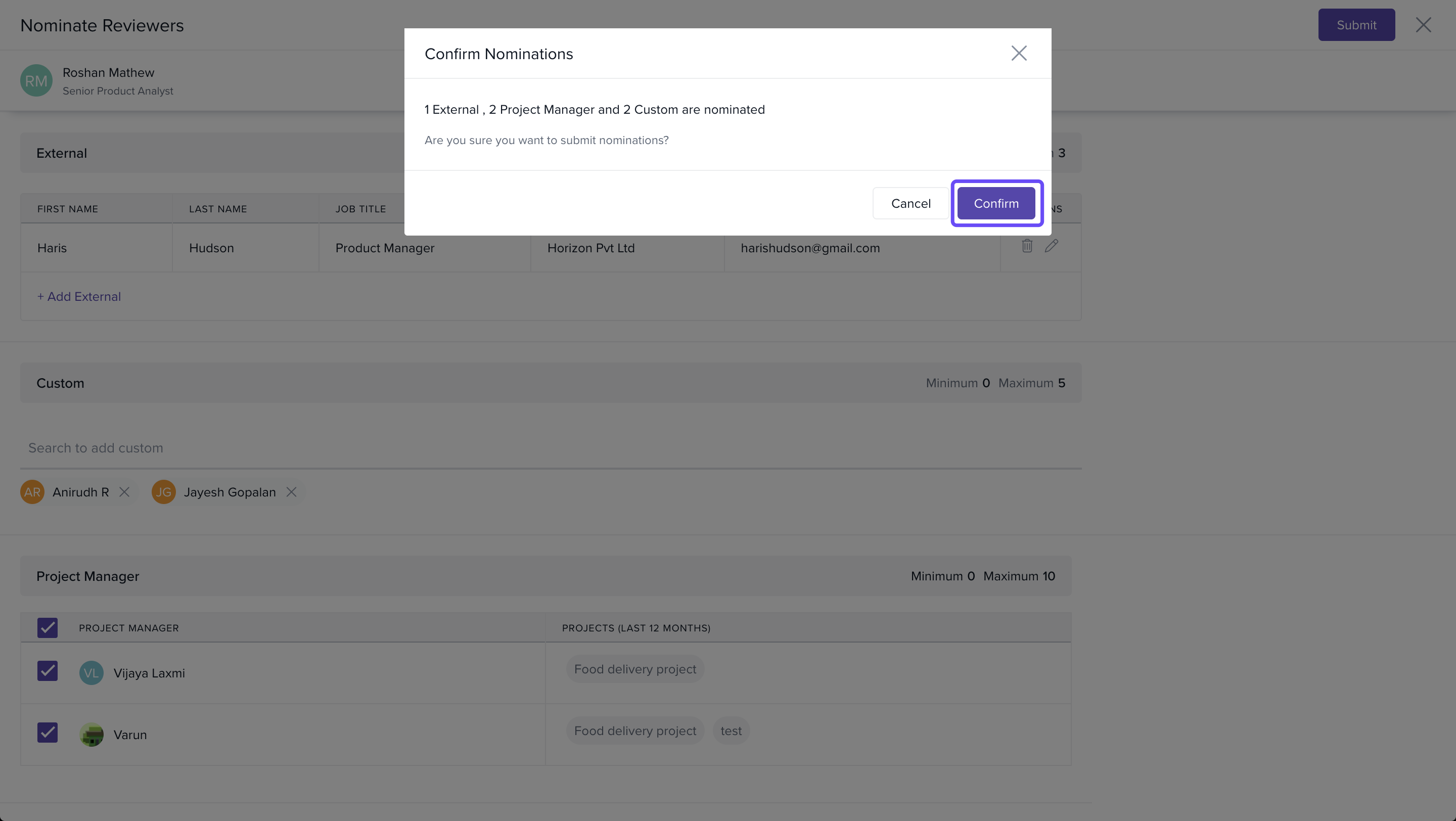 - Confirm the chosen reviewers and submit the nominations for approval.