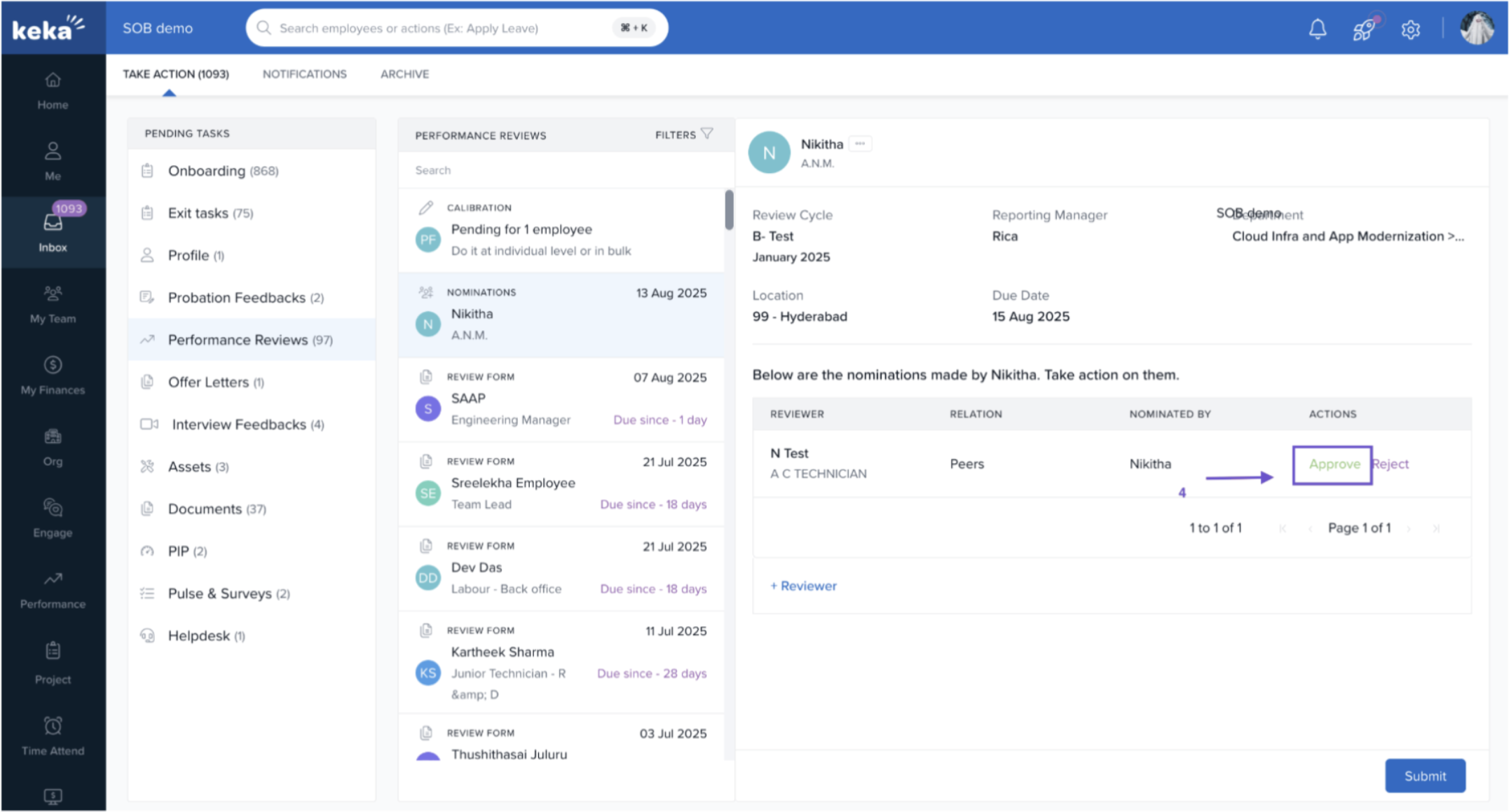 In Keka, managers can approve peer nomination requests made by their team members during the performance review cycle. This ensures that the right peers are included in the review process. Here’s a step-by-step guide to help you approve a nomination request quickly and accurately.