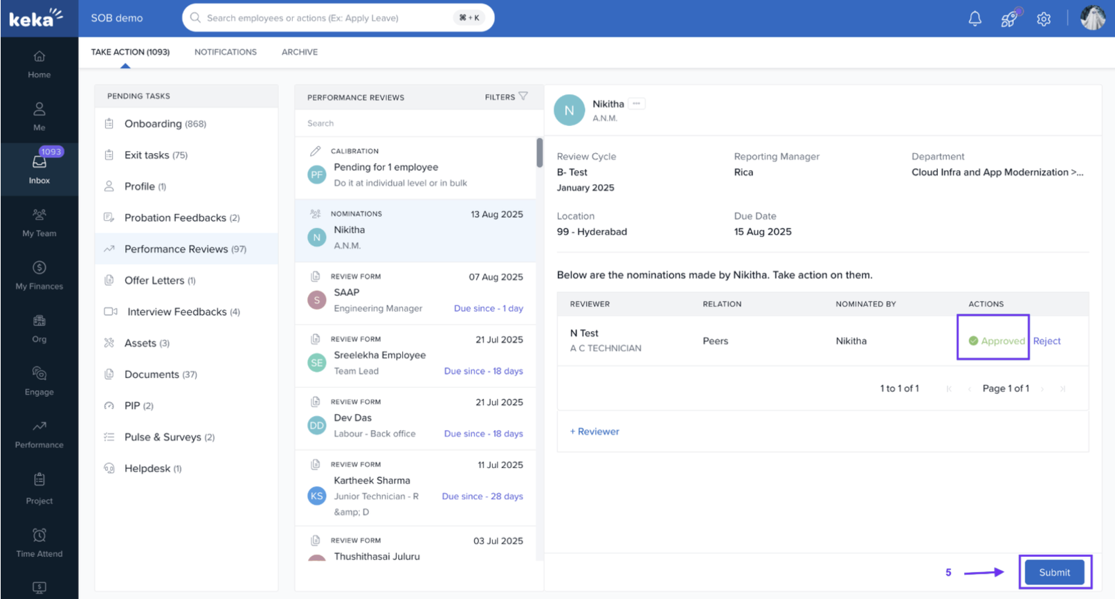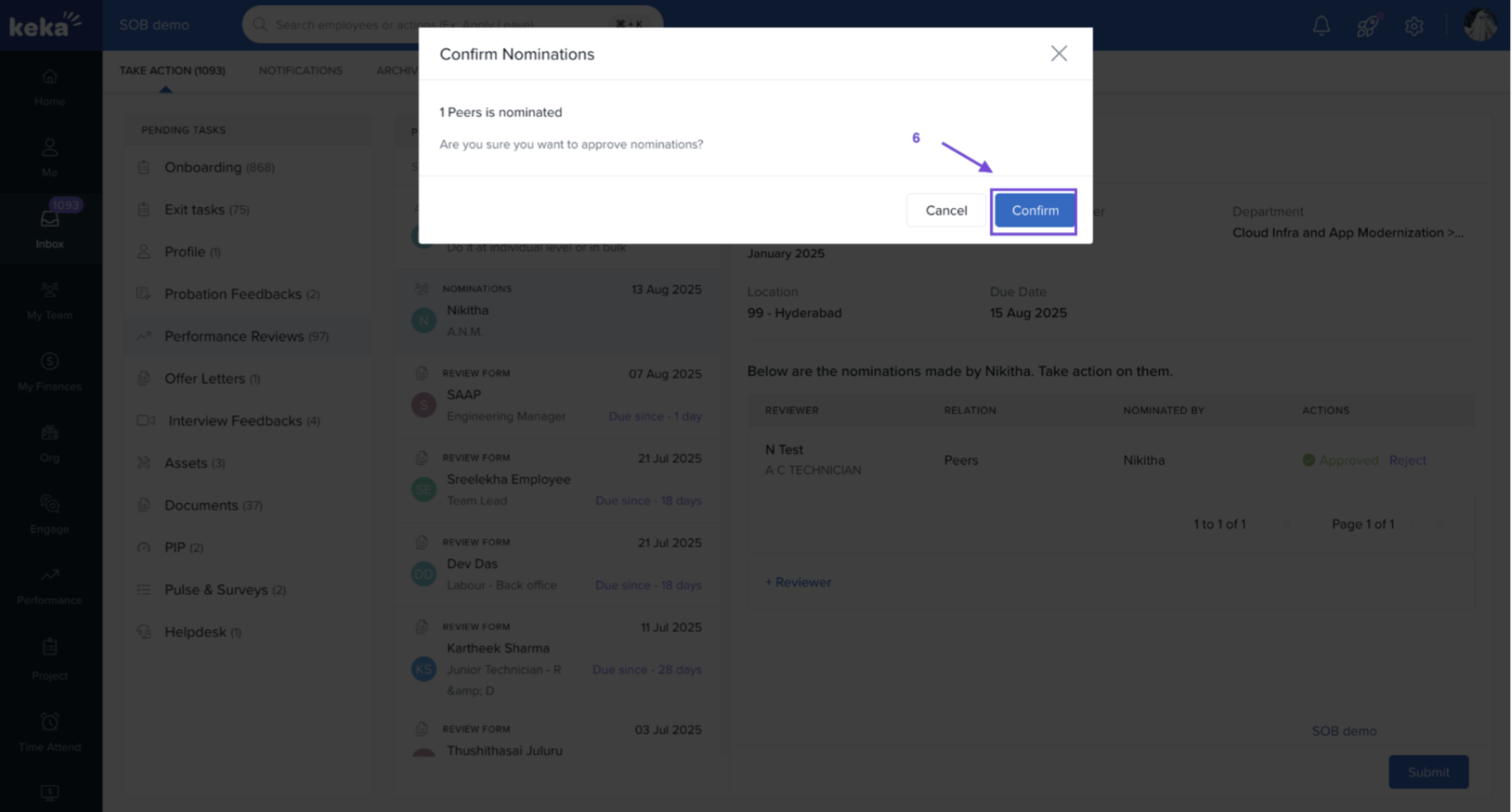 That’s it! You have successfully approved a nomination request as a Manager in Keka. This ensures that the performance review process moves forward with the right peer reviewers in place.