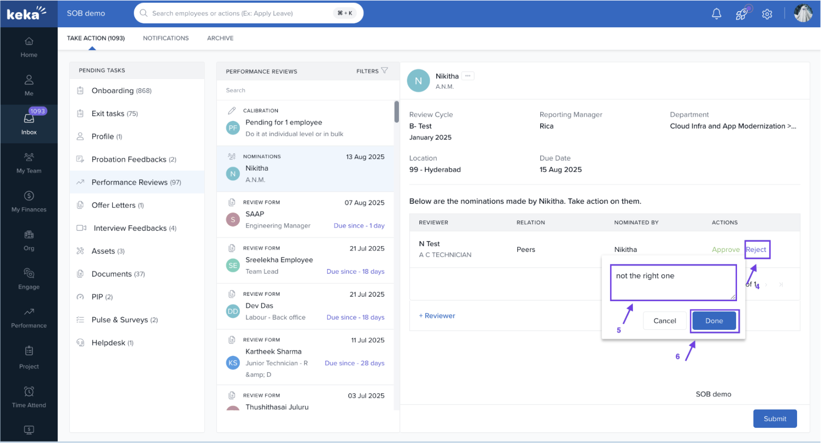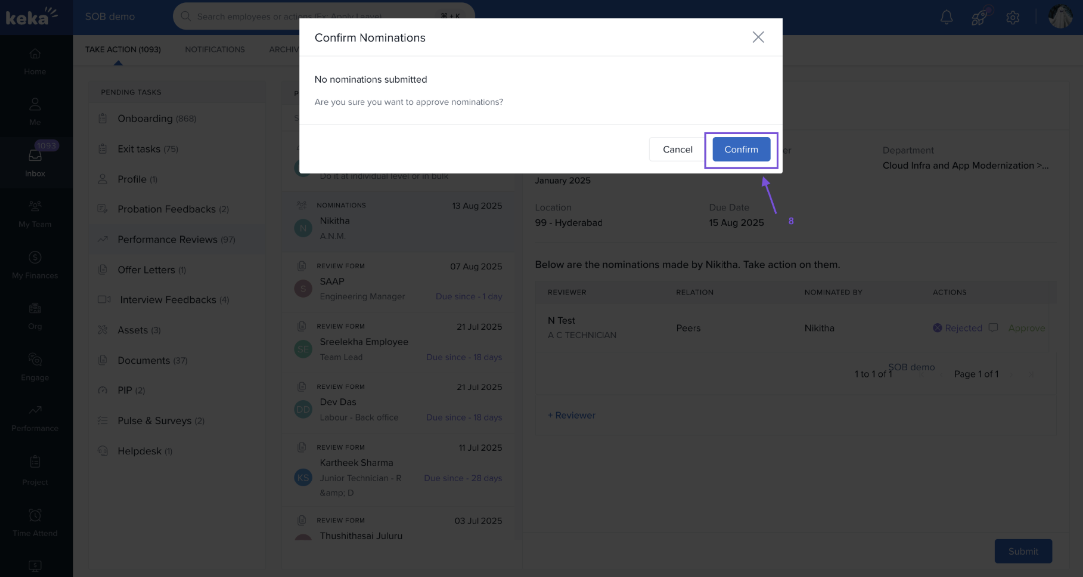 That’s it—you’ve successfully rejected a nomination request as a Manager in Keka.