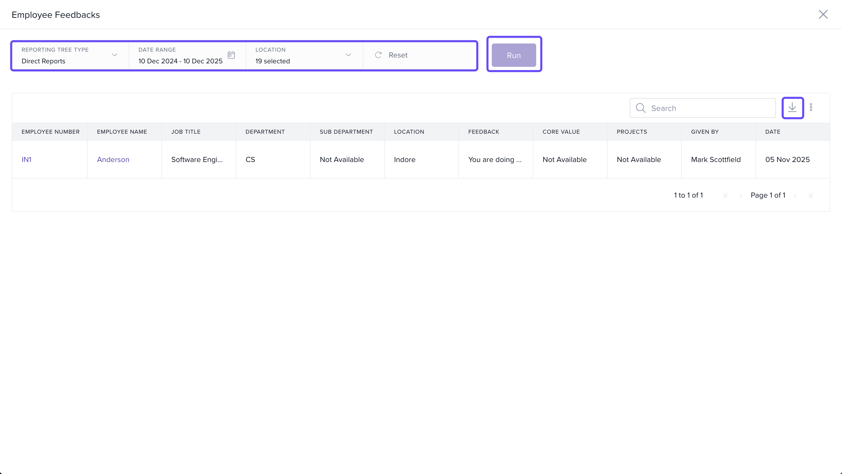 - In both reports, you need to select the Reporting Tree Type and Date range, which are mandatory fields, and click Run. Once the report is generated, you can click the Download Icon to download the report.