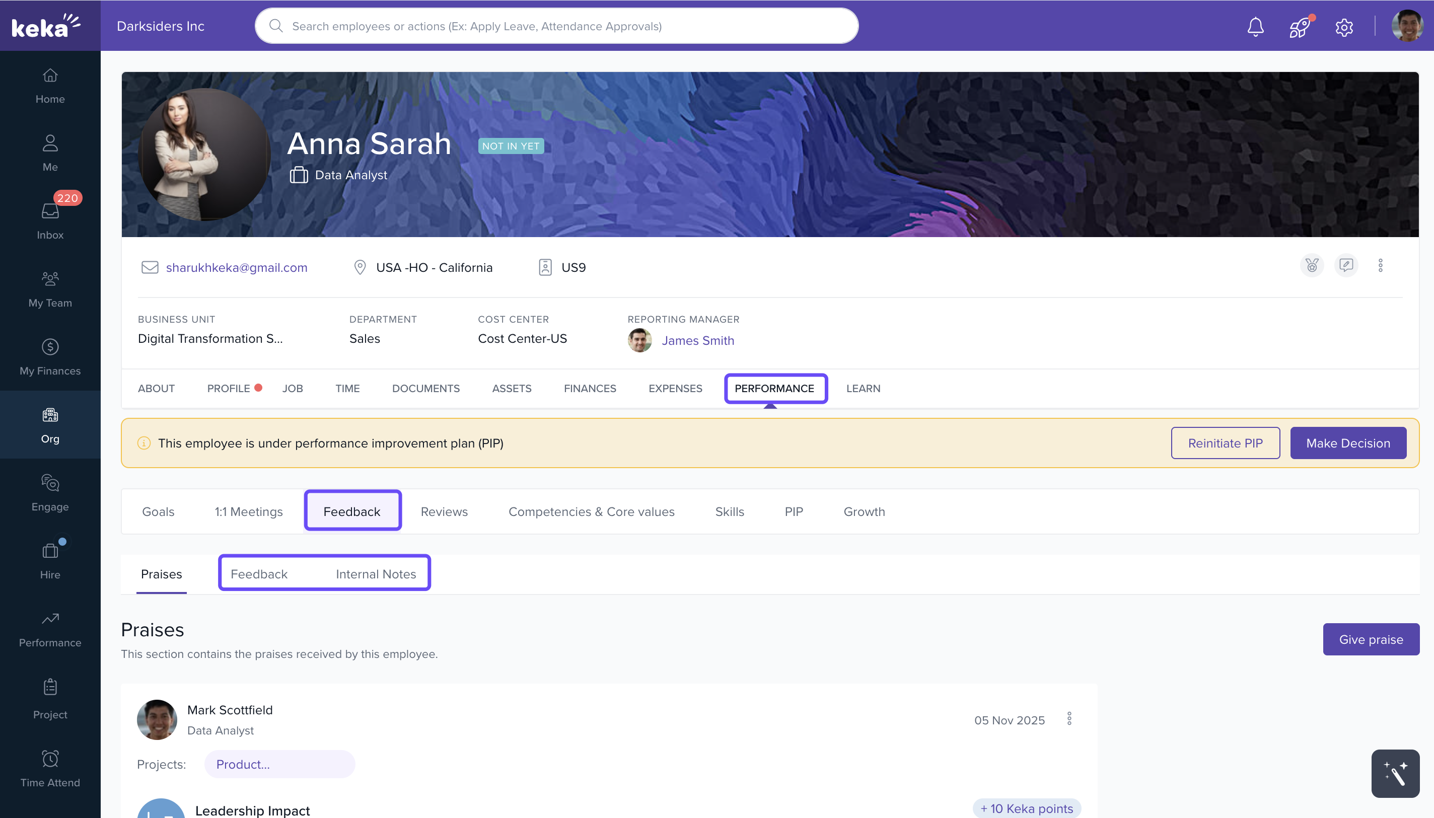 All employees in the organisation can write an internal note to any employee in the organisation, whereas personal feedback can be given by admins to any employee or by managers to their direct or incorrect reports. A reporting manager can view the personal feedback or internal notes given to their reports in order to analyse and work on them if required.