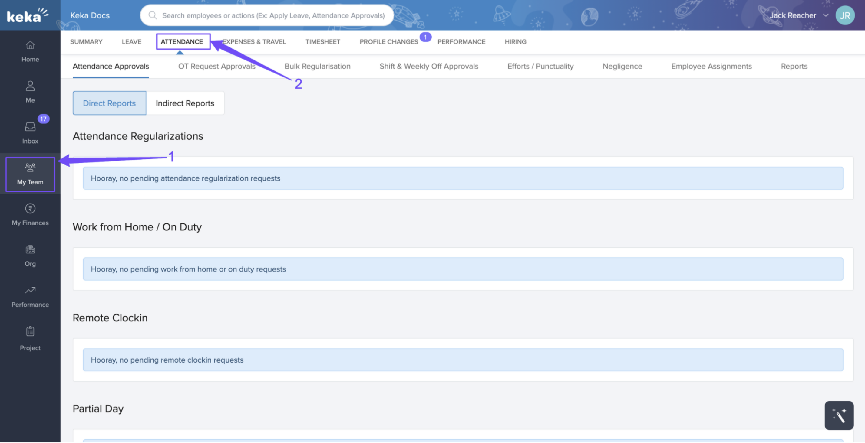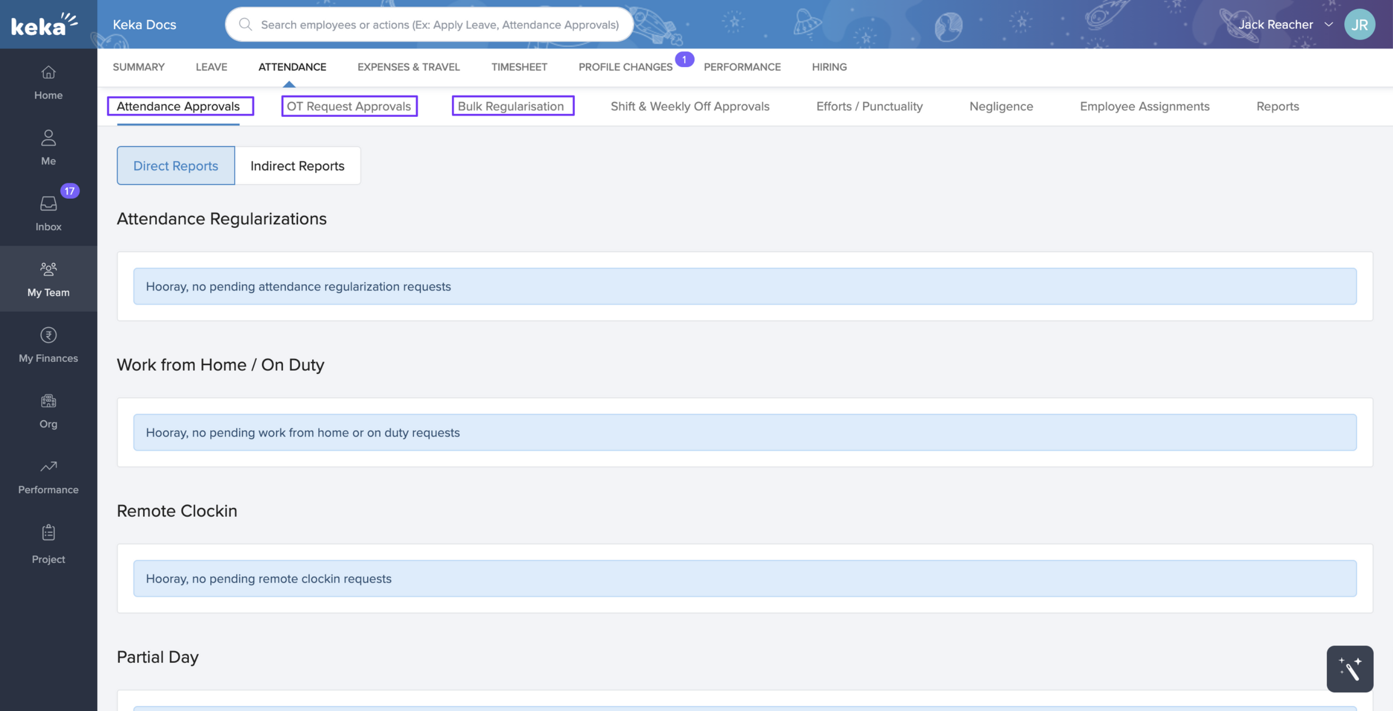Under the Attendance Approvals tab, you can take action on pending regularisation requests, WFH/OD requests, remote clock-in requests, or partial day requests.