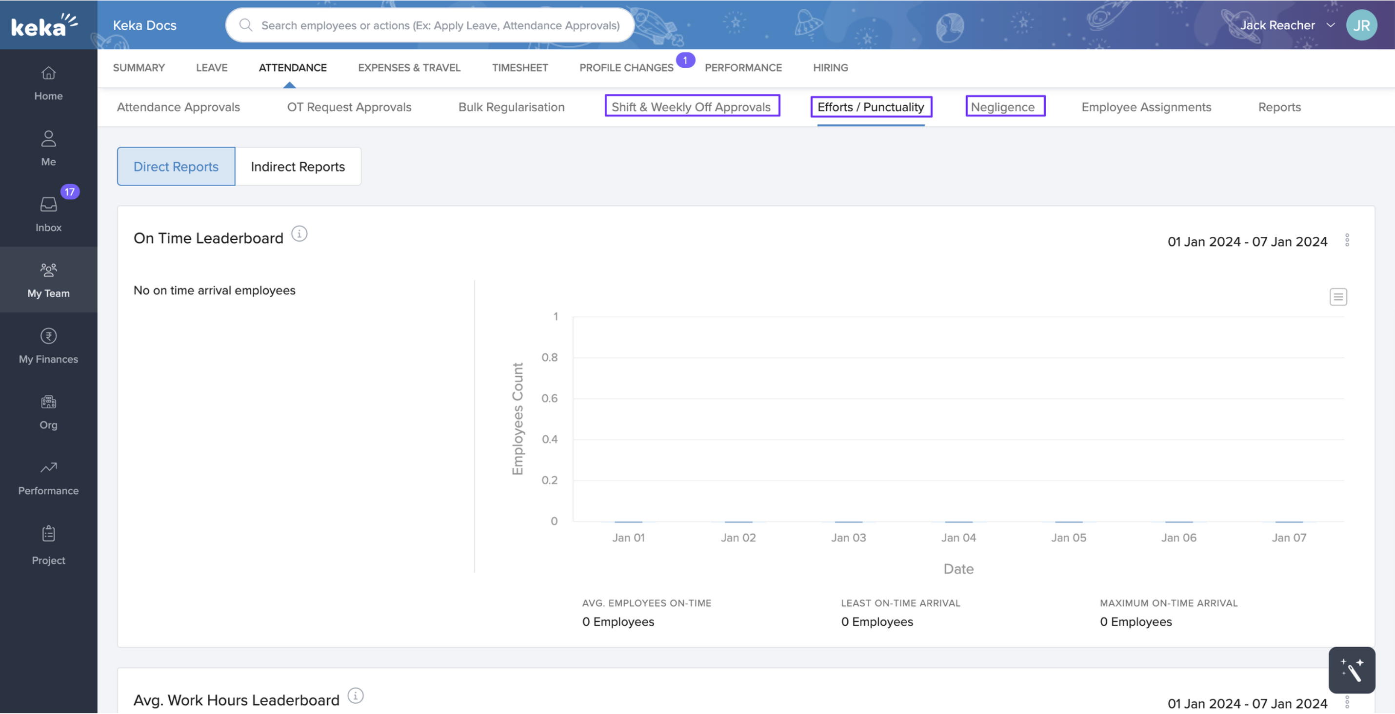 The Efforts/Punctuality tab displays graphical representations of parameters like punctuality, hours worked, and average overtime hours worked in your team for a selected time range. Additionally, this tab features a leaderboard that shows you who is performing well in these areas.