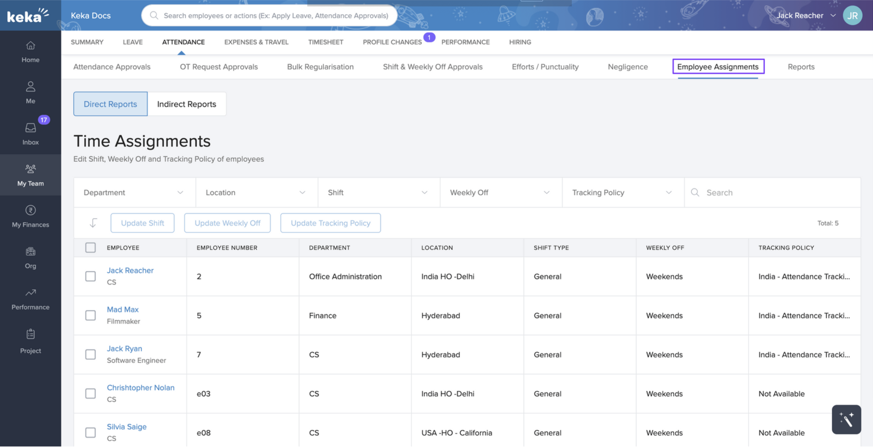 Under the Employee Assignment tab, you can update shift assignments weekly off assignments, and even track penalization policy assignments.