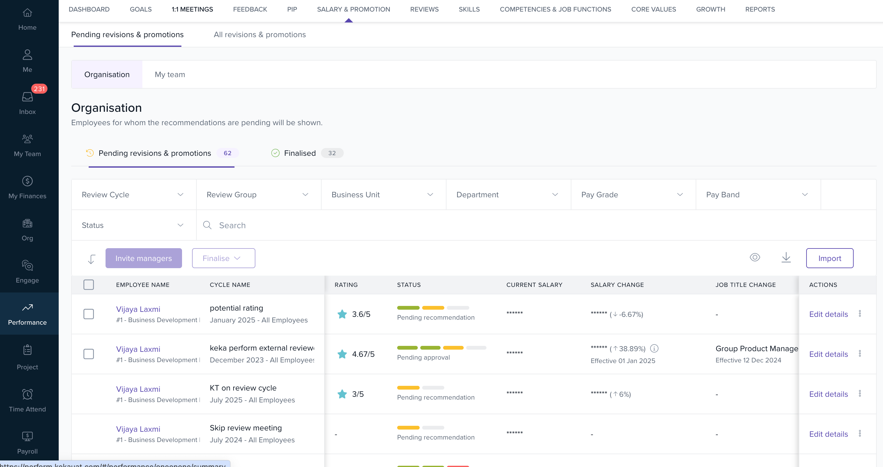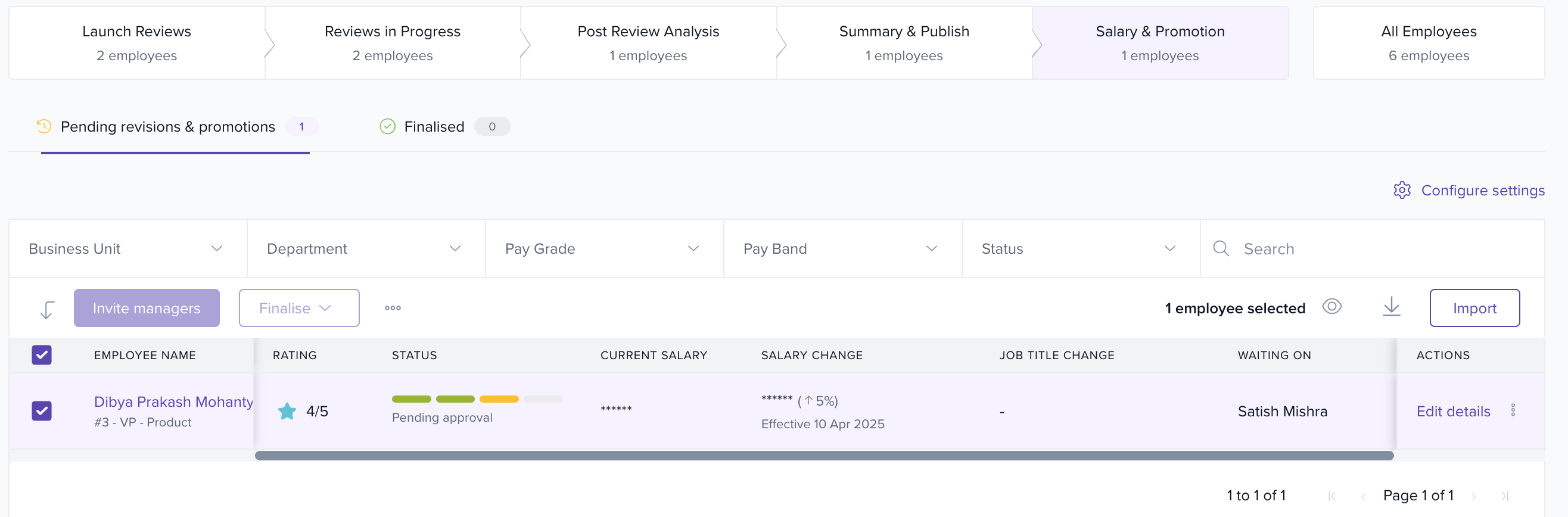 - One-click finalisation to push updates to the employee Finance (salary) and Job (designation) tabs.