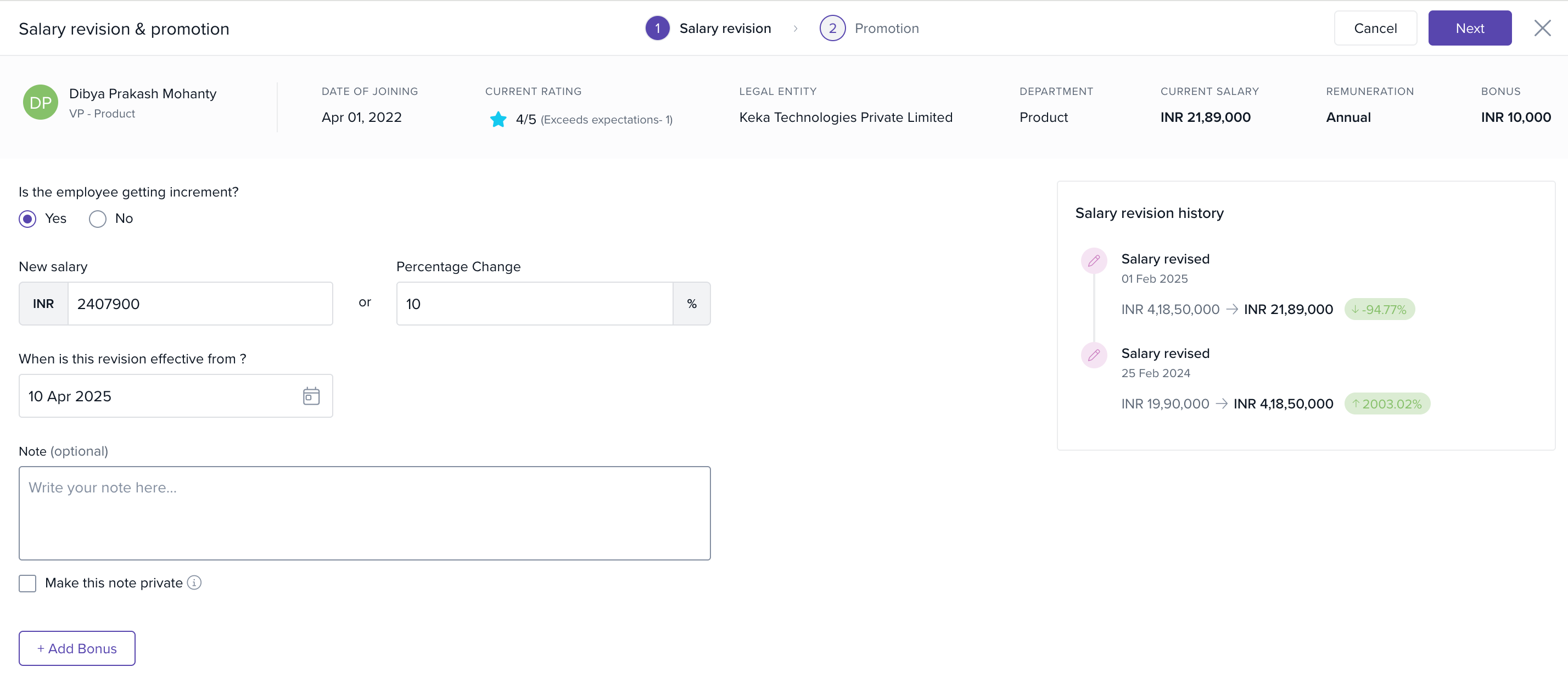 - Enter salary revision (amount or percentage) and optional bonus.