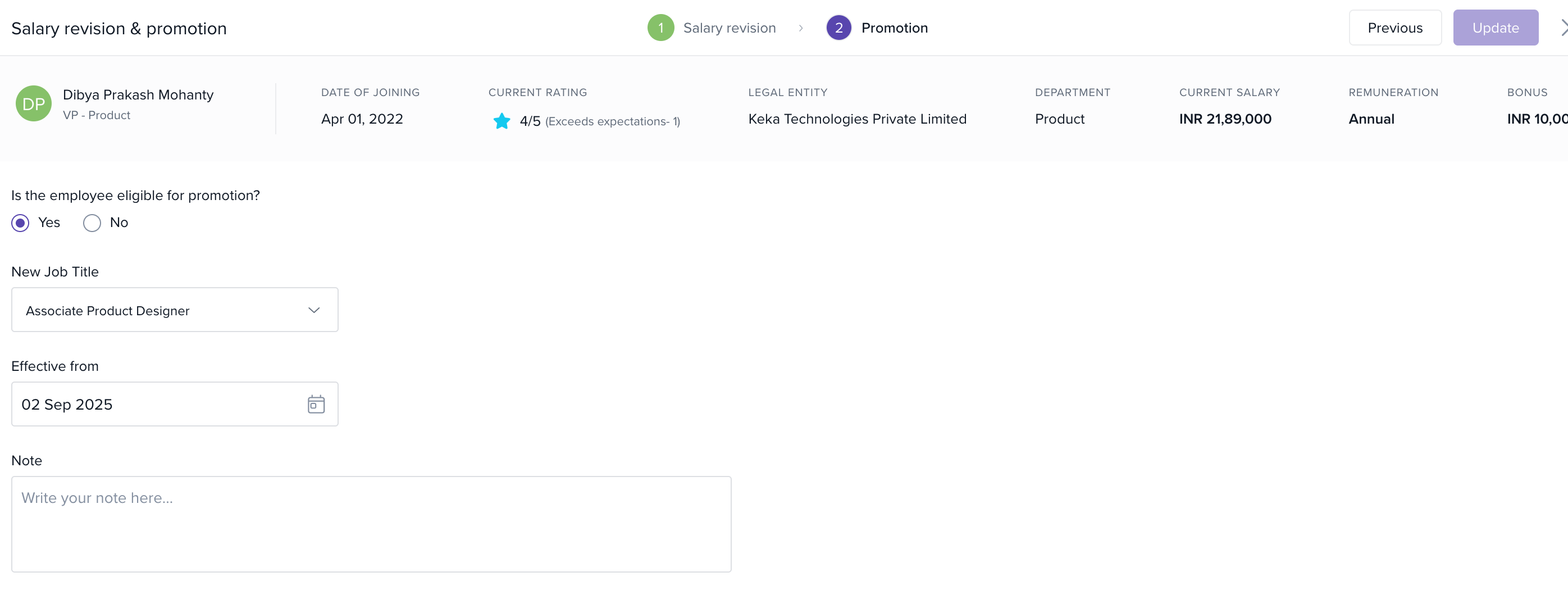 - The Salary & promotion tab is available to Performance admin, Payroll admin, HR manager, and invited managers. Visibility and actions are limited by role and permissions.