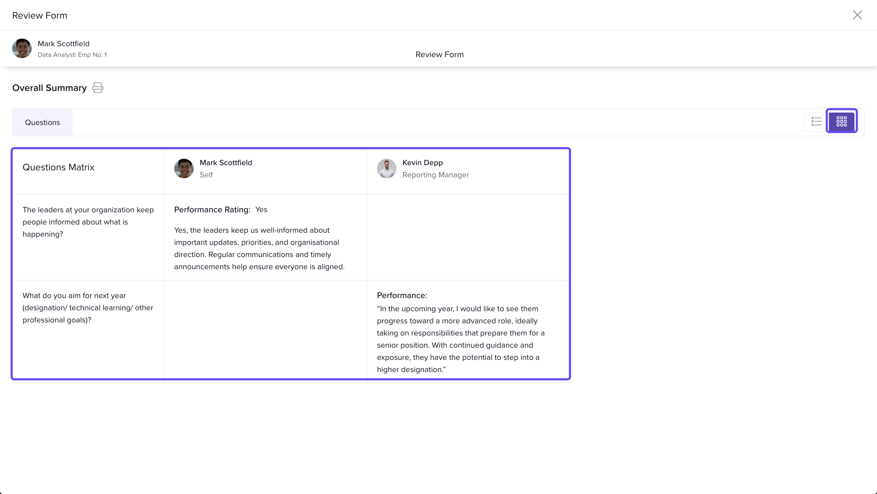 Under View Review, employees can see the feedback given to them under the different sections (In the screenshot provided, there are only Questions available, however if there are other sections, they will appear in the same way as Questions). Employees can use the Collapse Icon provided to view the feedback.