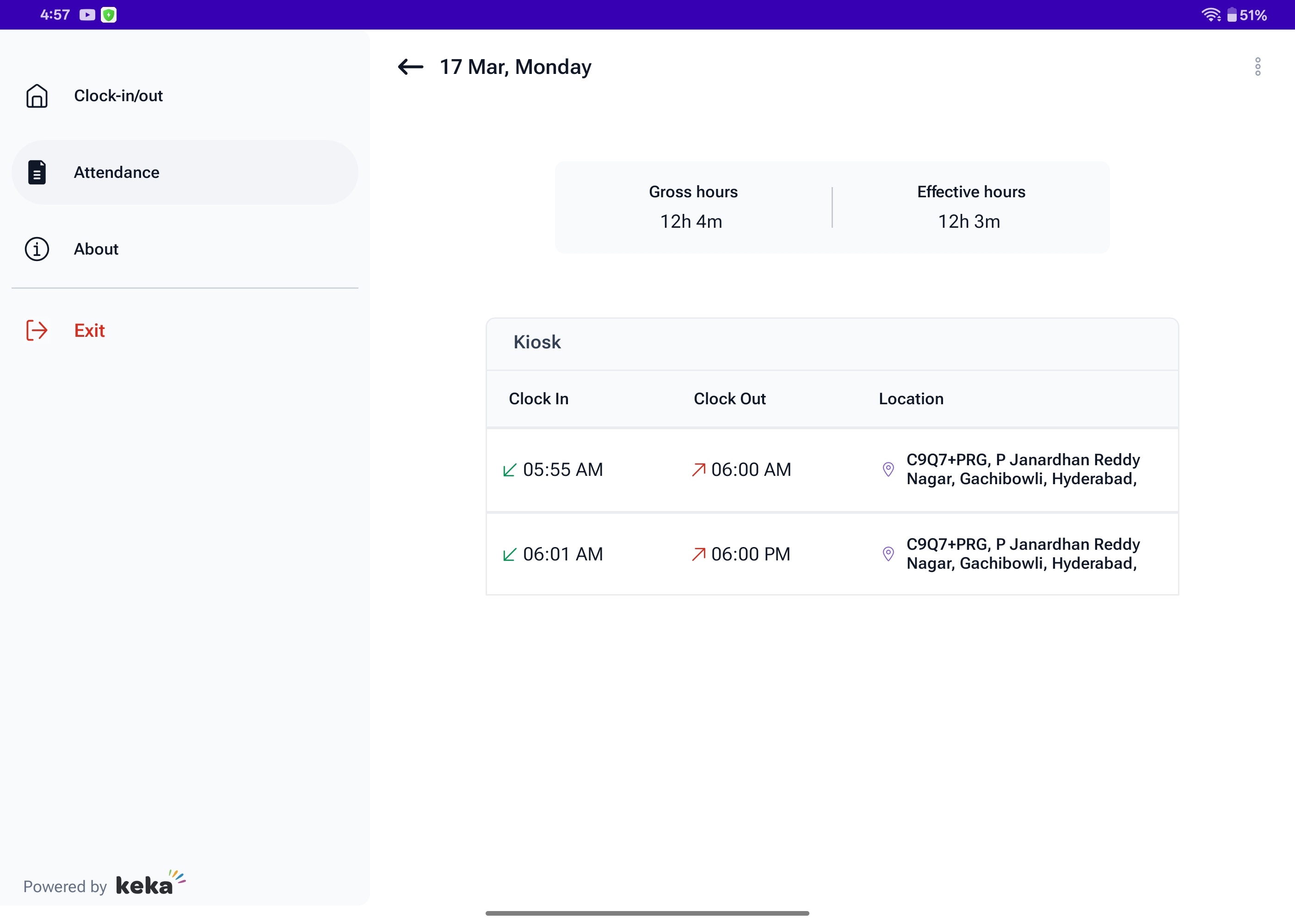 Learn how to navigate the Keka Kiosk employee view, including clocking in and out, using the PIN fallback option, and managing attendance seamlessly.