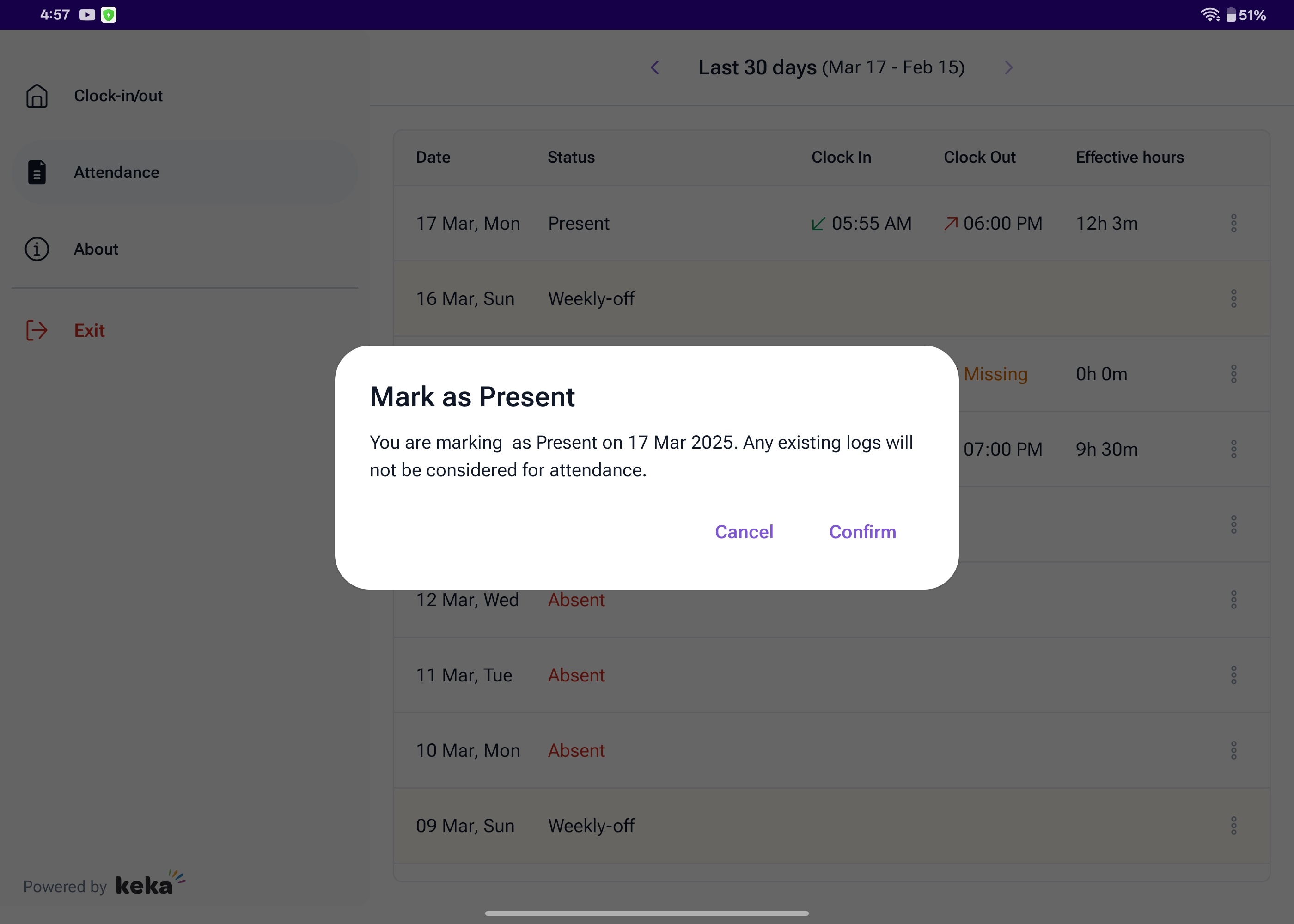 For employees, the Keka Kiosk app provides limited options, mainly for viewing attendance and marking check-ins/check-outs. If any discrepancies arise, employees can request attendance regularization through the app, subject to manager approval.