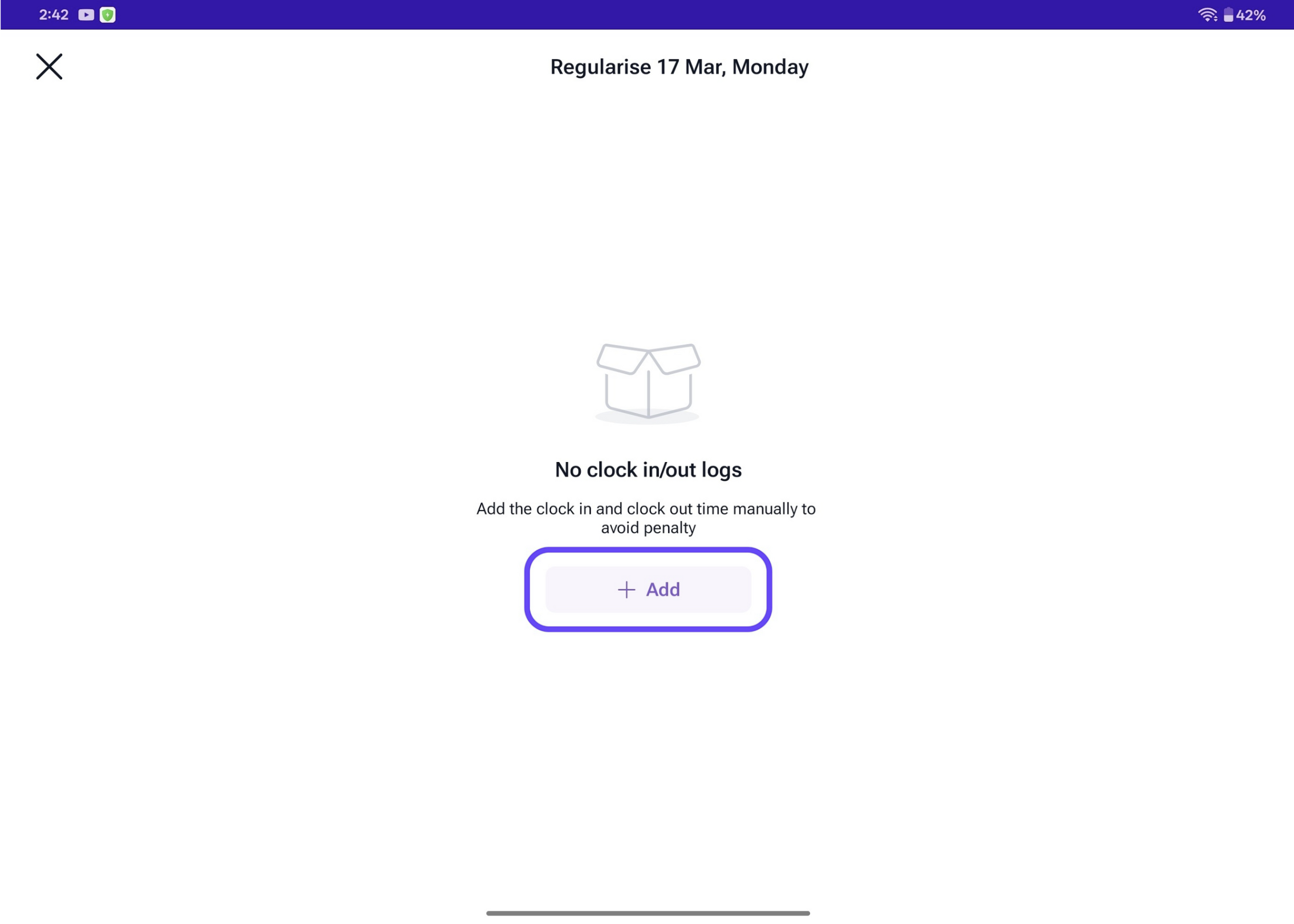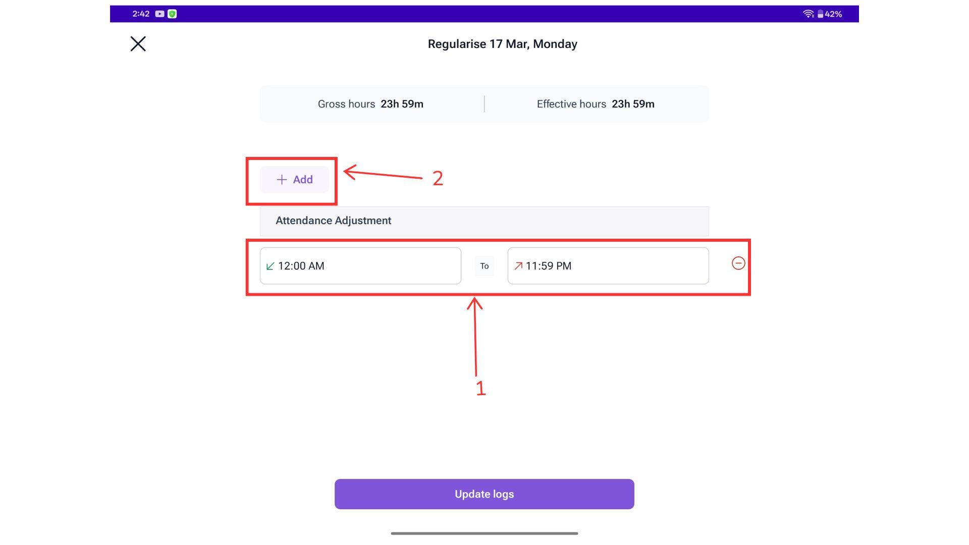 Choose the Regularise logs option then In the Attendance Adjustment window, click + Add to enter the time logs.