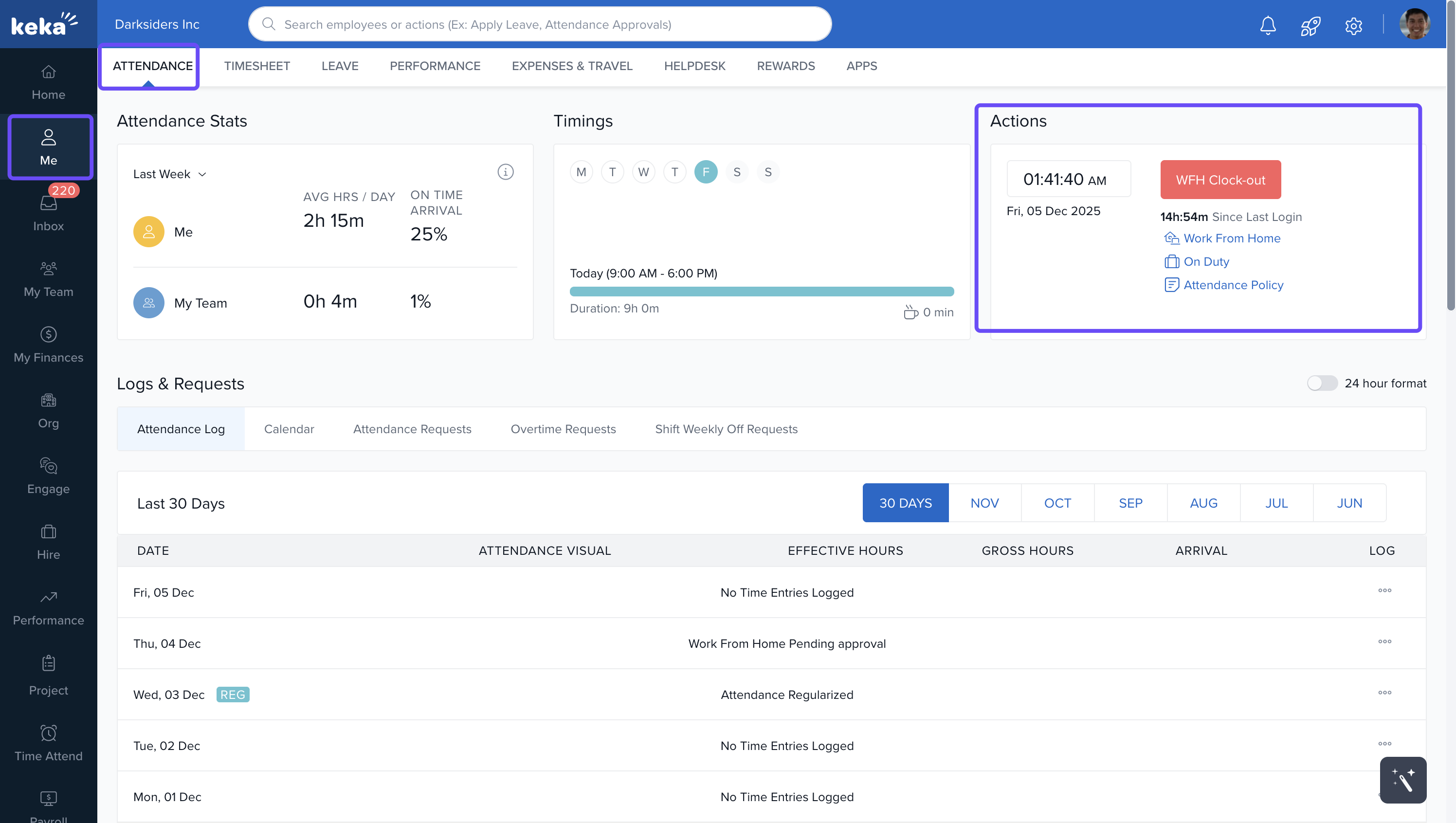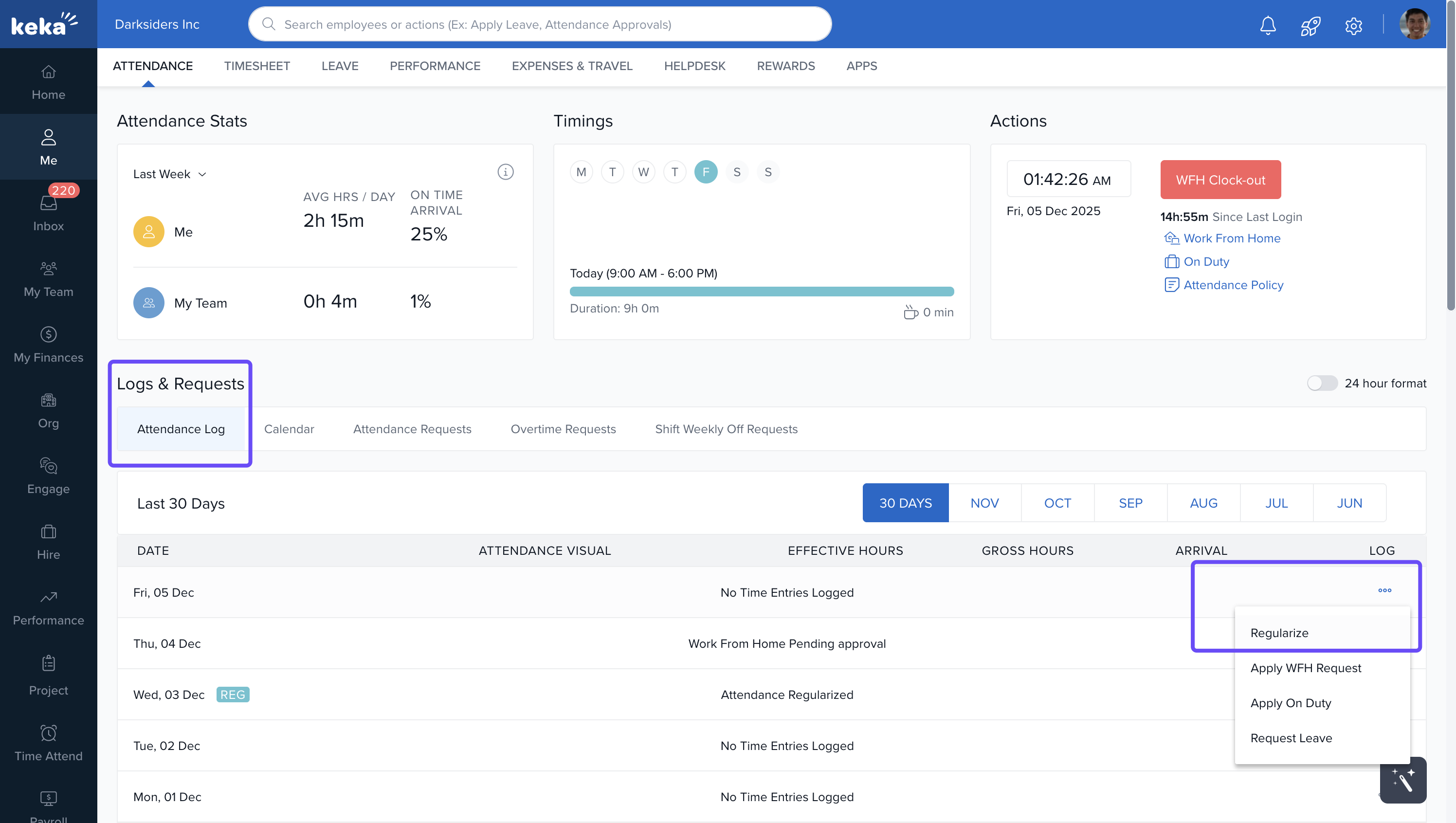 Keka lets you submit Work From Home (WFH), On Duty (OD), Partial Day, and Attendance Regularization requests directly from your portal. With real-time usage counters, you can now see how many instances you've used and how many remain—so you can plan better and avoid exceeding limits.