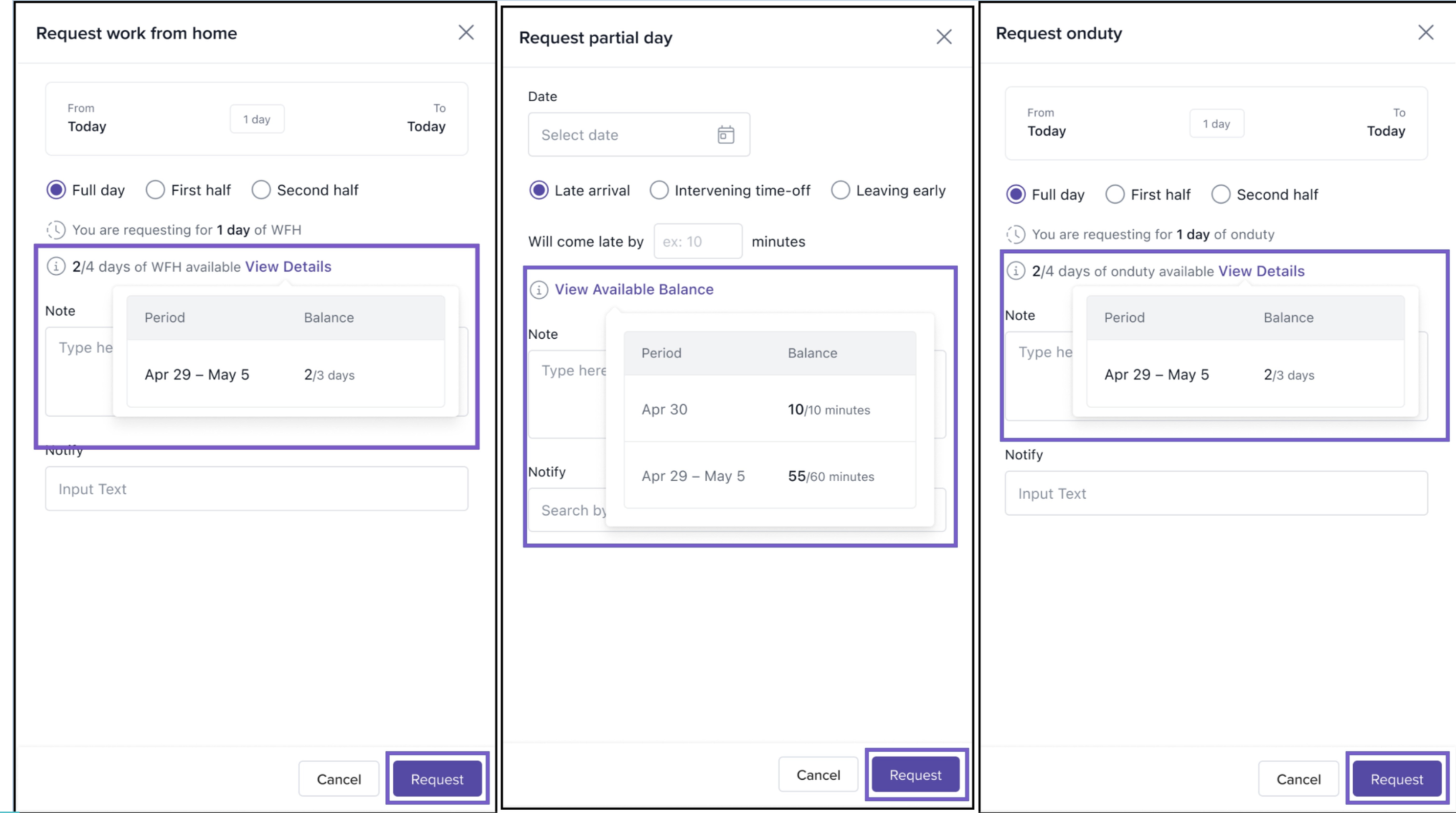Tip: Use real-time counters to track how many WFH or OD days you've used before submitting a new request.