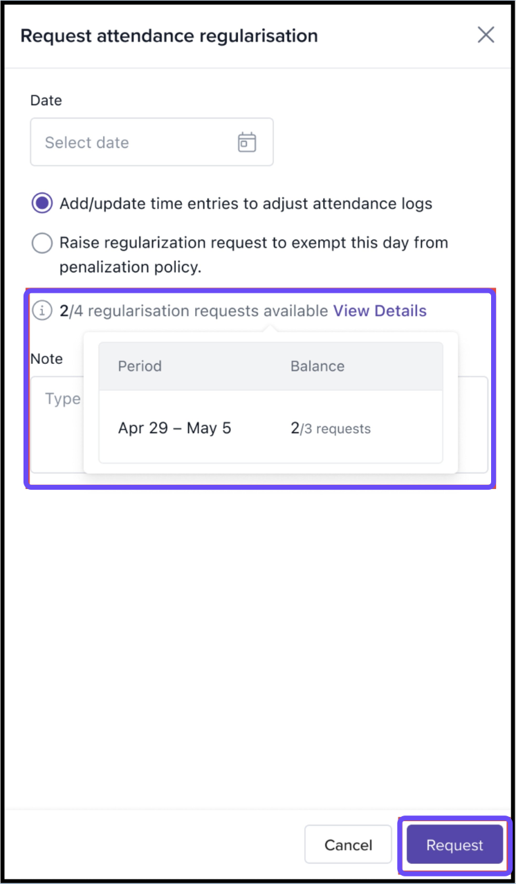 You'll also see your available regularization balance. Once done, click Request to submit.