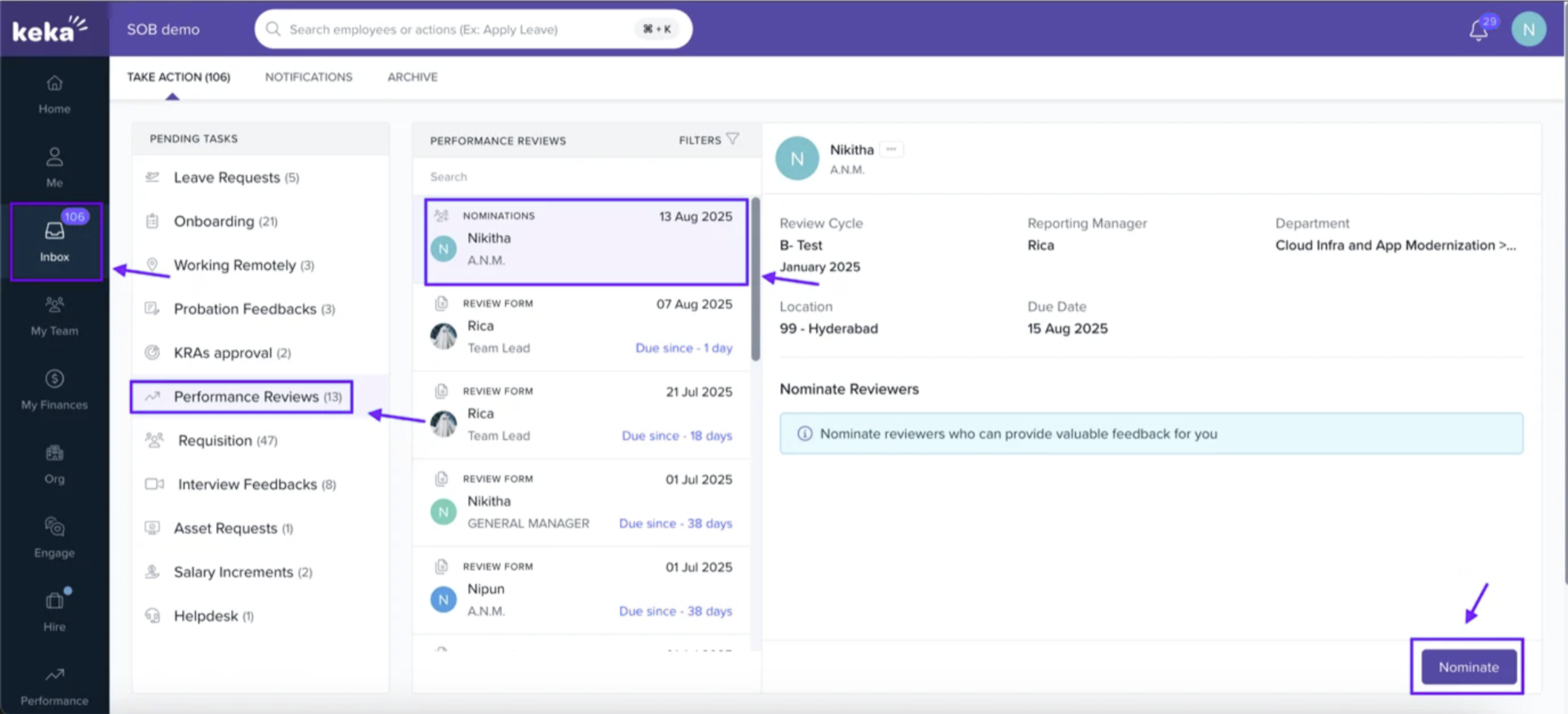 Peer reviews are an essential part of the performance evaluation process, allowing employees to receive constructive feedback from colleagues they work closely with. In Keka, nominating a peer reviewer is quick and straightforward. Here’s a step-by-step guide to help you through the process.
