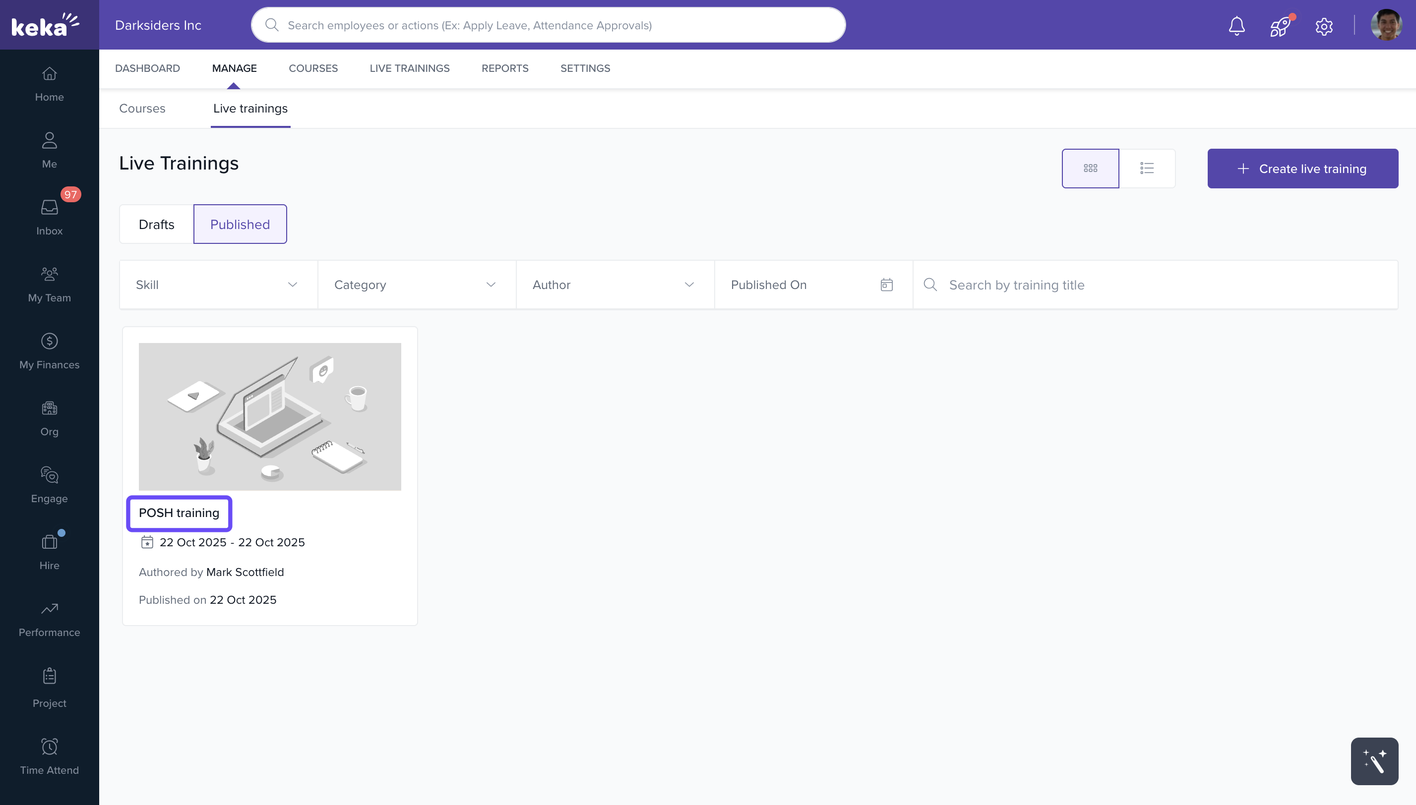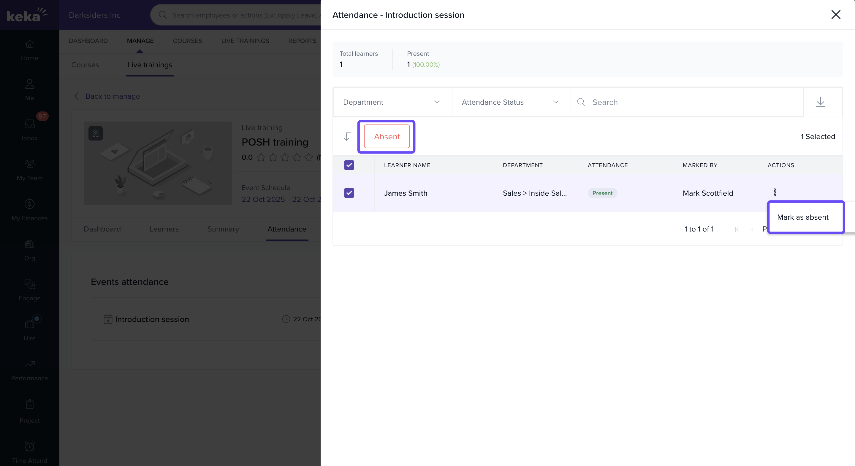Select the live training session for which you want to manage attendance.