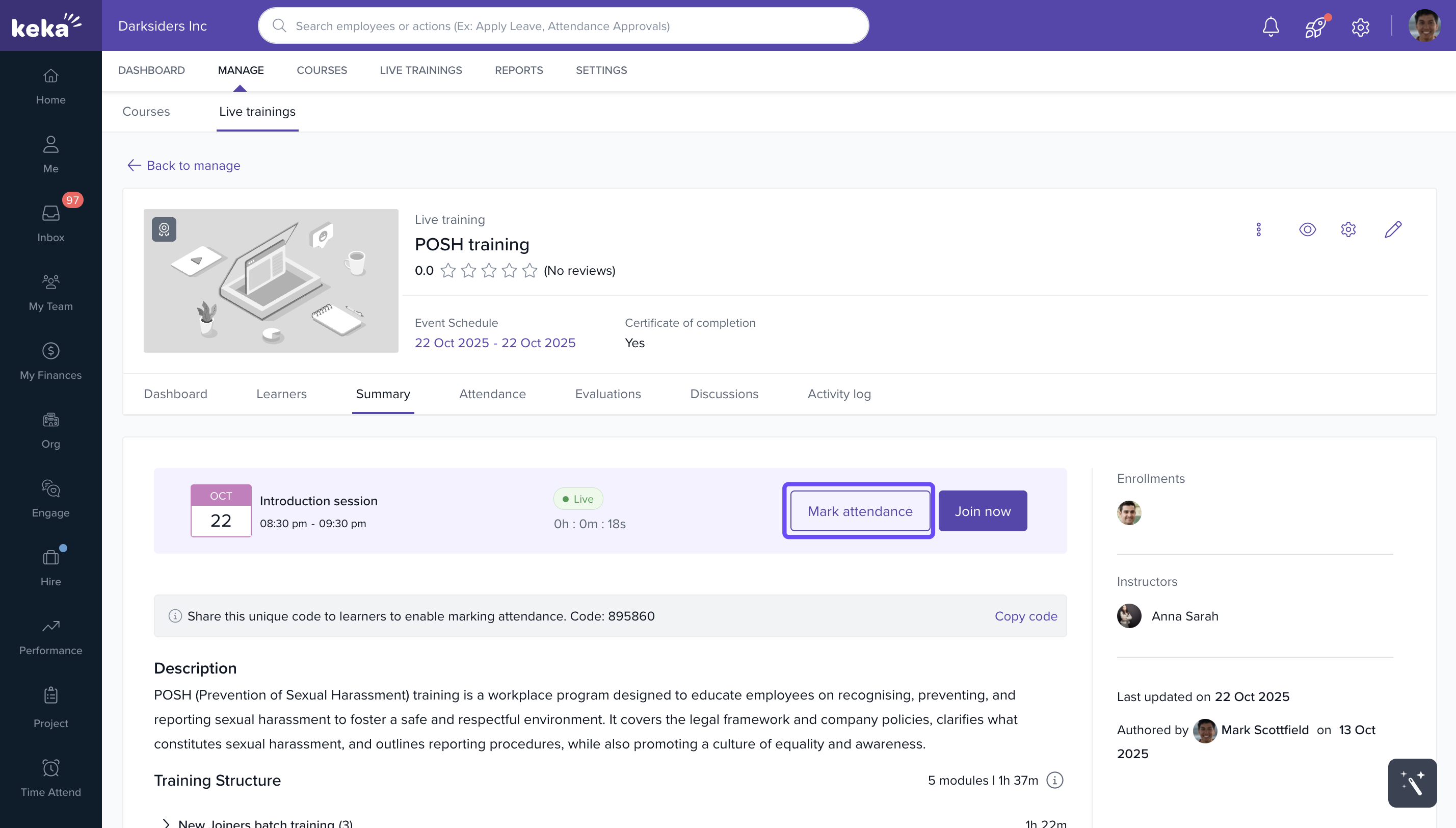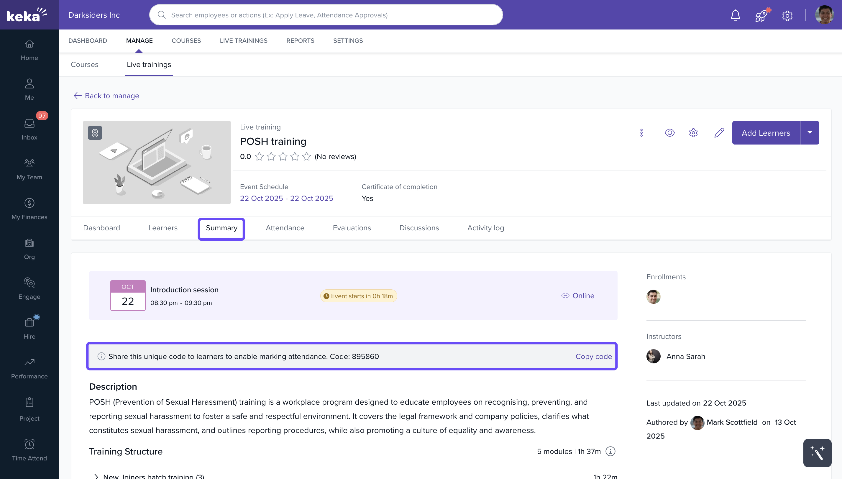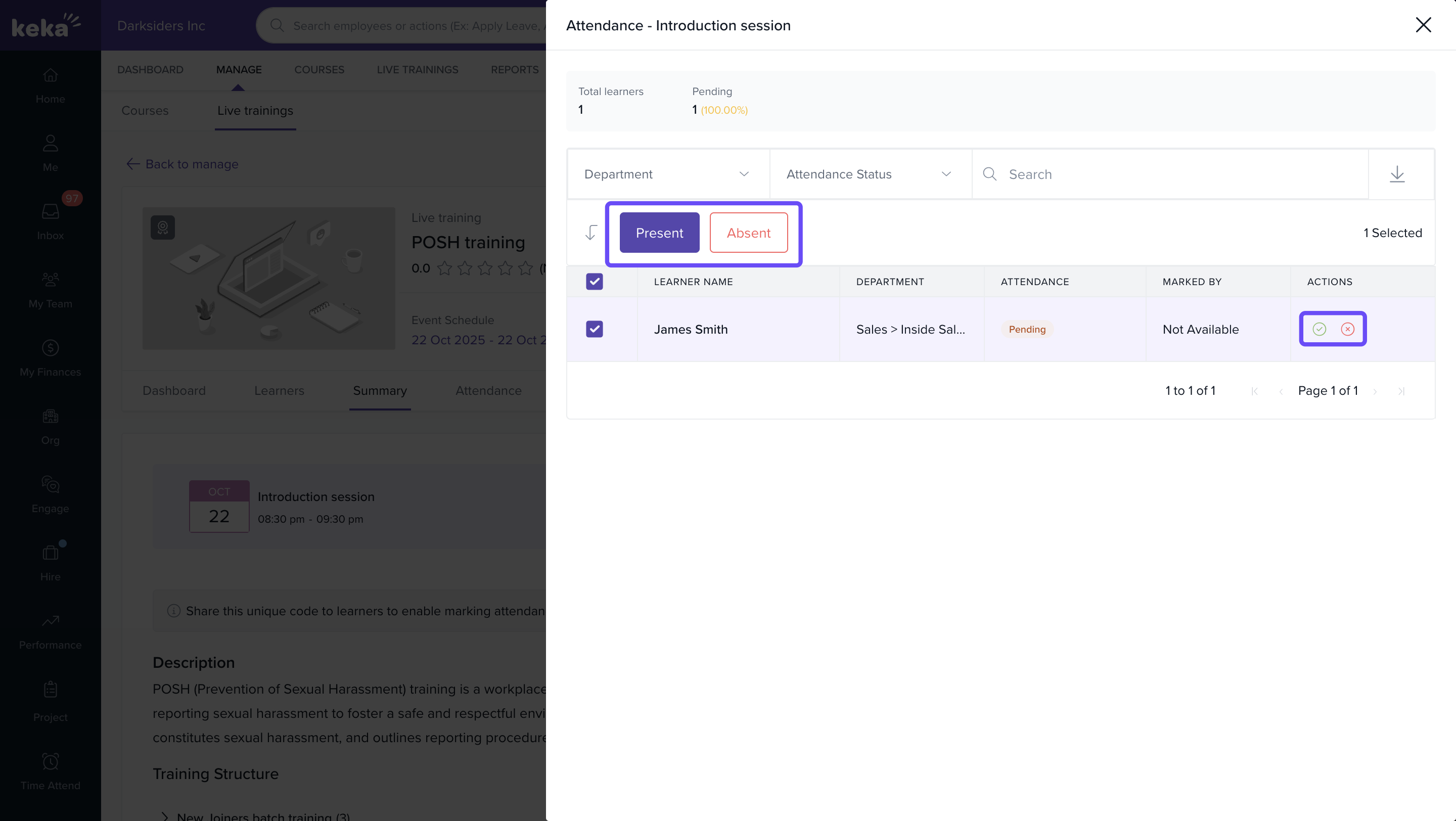 Keka Learn allows administrators and trainers to manage attendance for live training sessions directly from the platform. You can share attendance codes with learners, mark attendance during the event, and edit it afterward if needed.