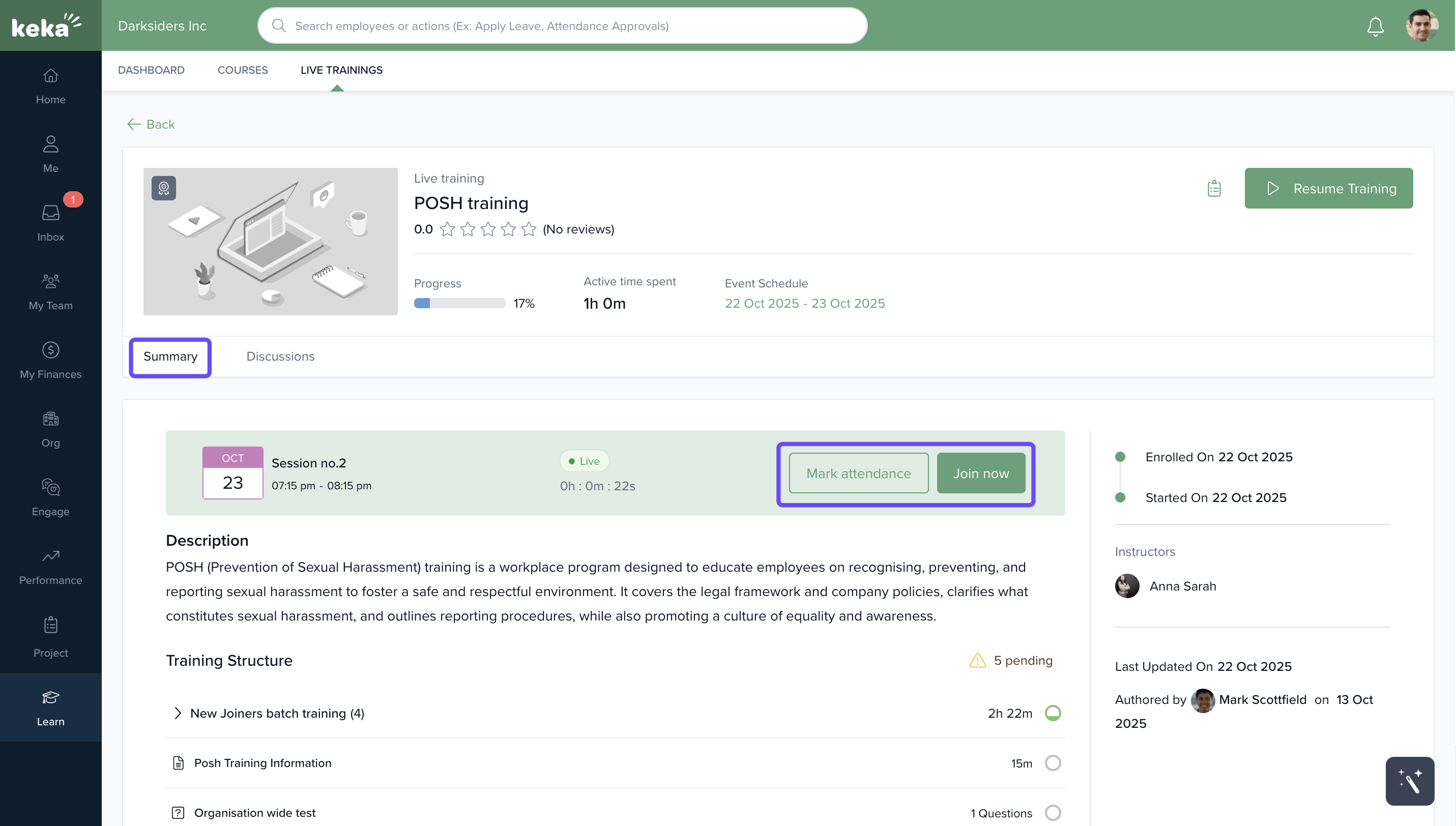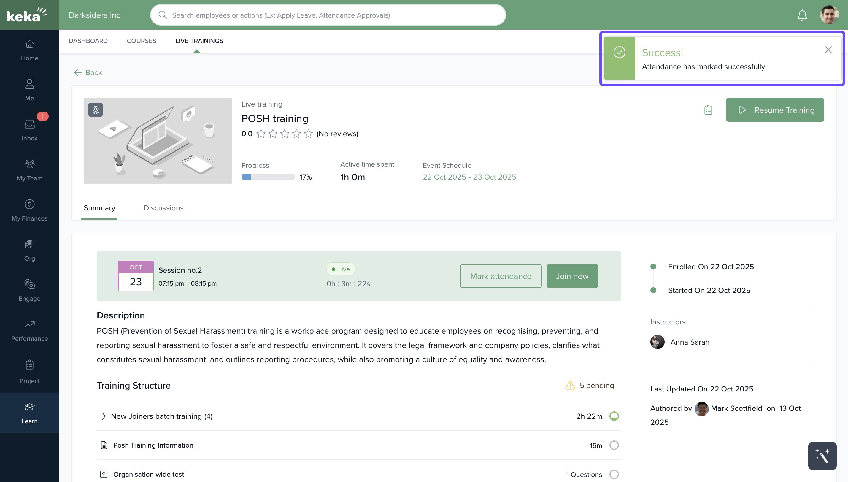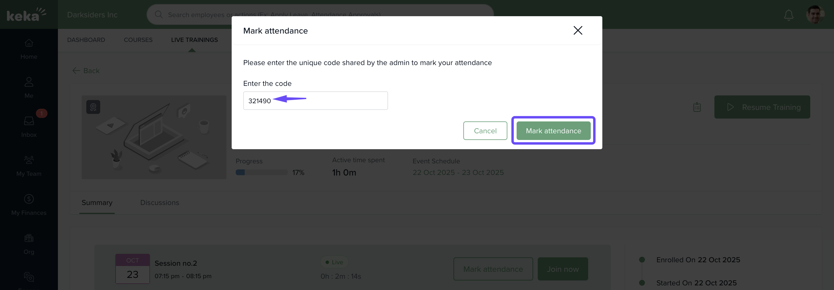 As a learner in Keka Live Trainings, you can mark your own attendance during a live session using a code provided by your administrator or trainer. Attendance can only be marked once the event is live.